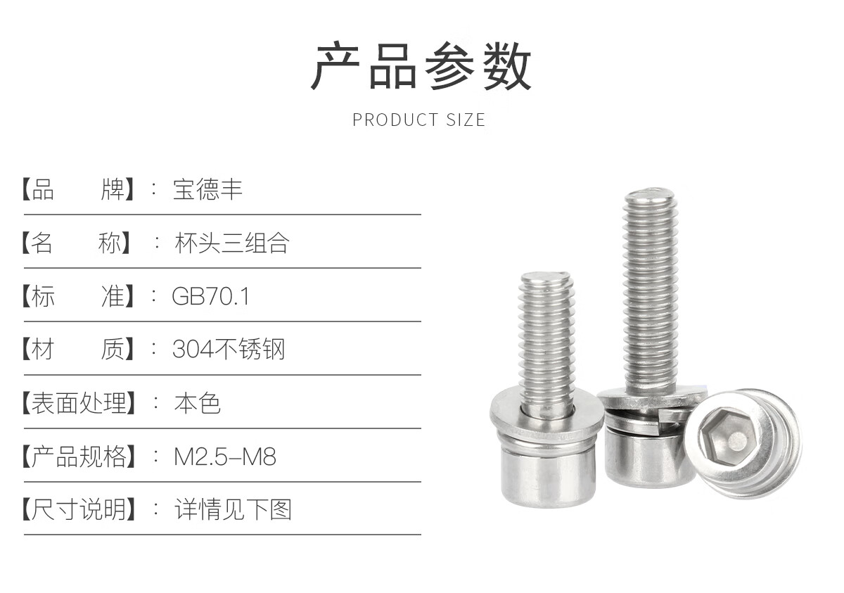 宝德丰304不锈钢GB70.1三组合螺丝钉内六角螺丝圆柱头垫片杯头组合螺钉 M2x4(50只)搓花