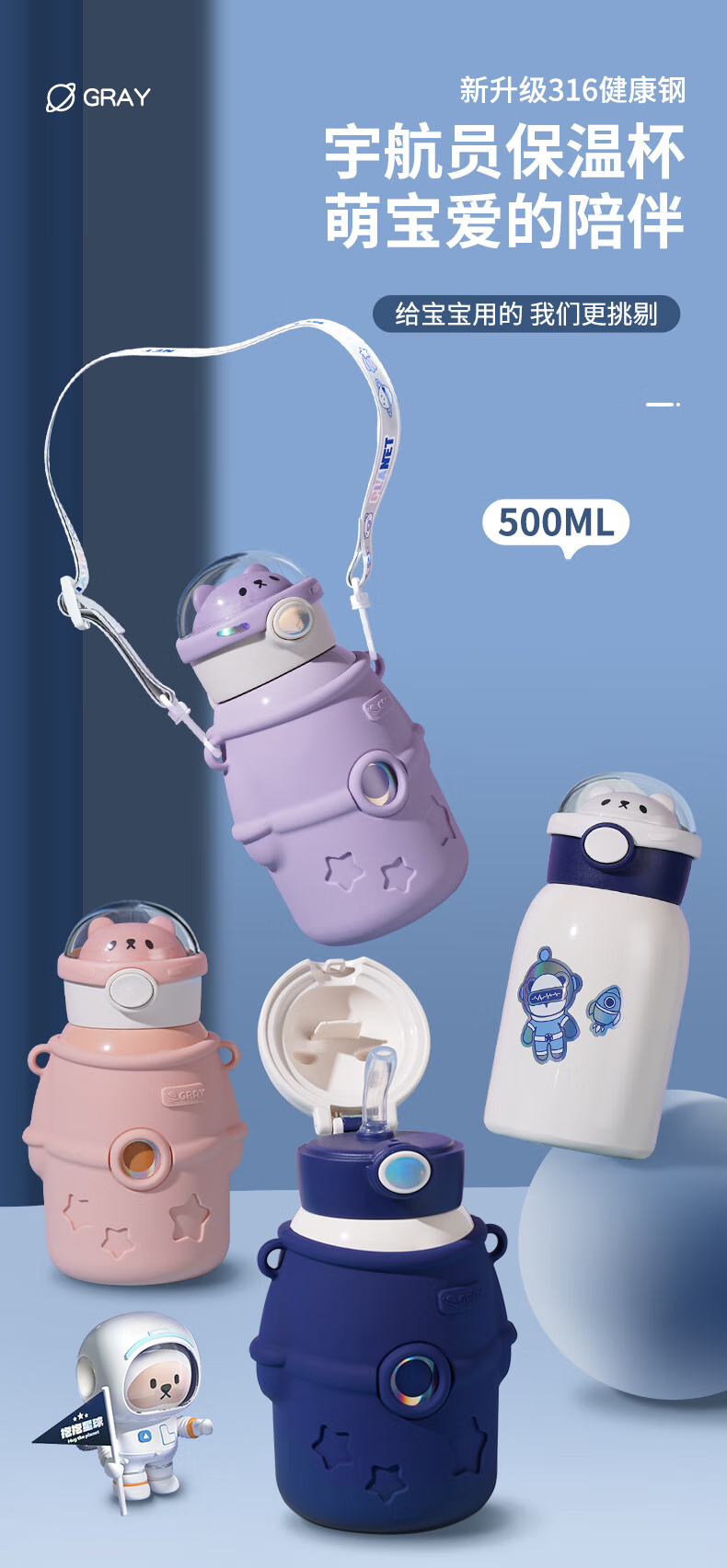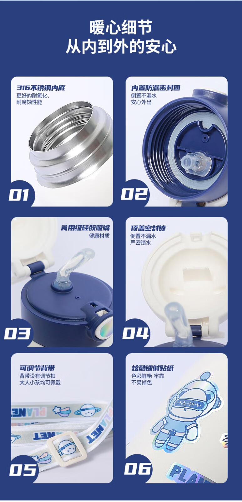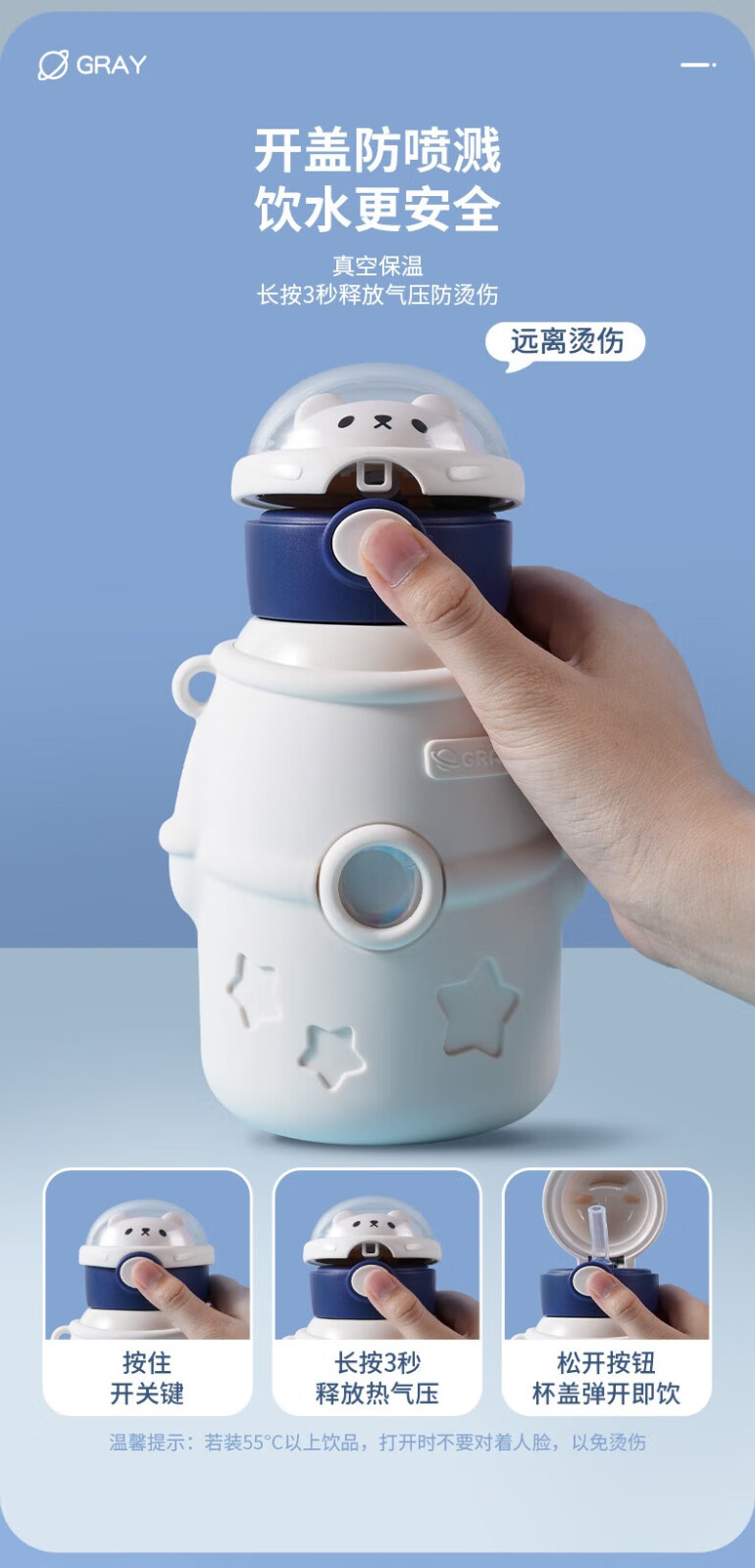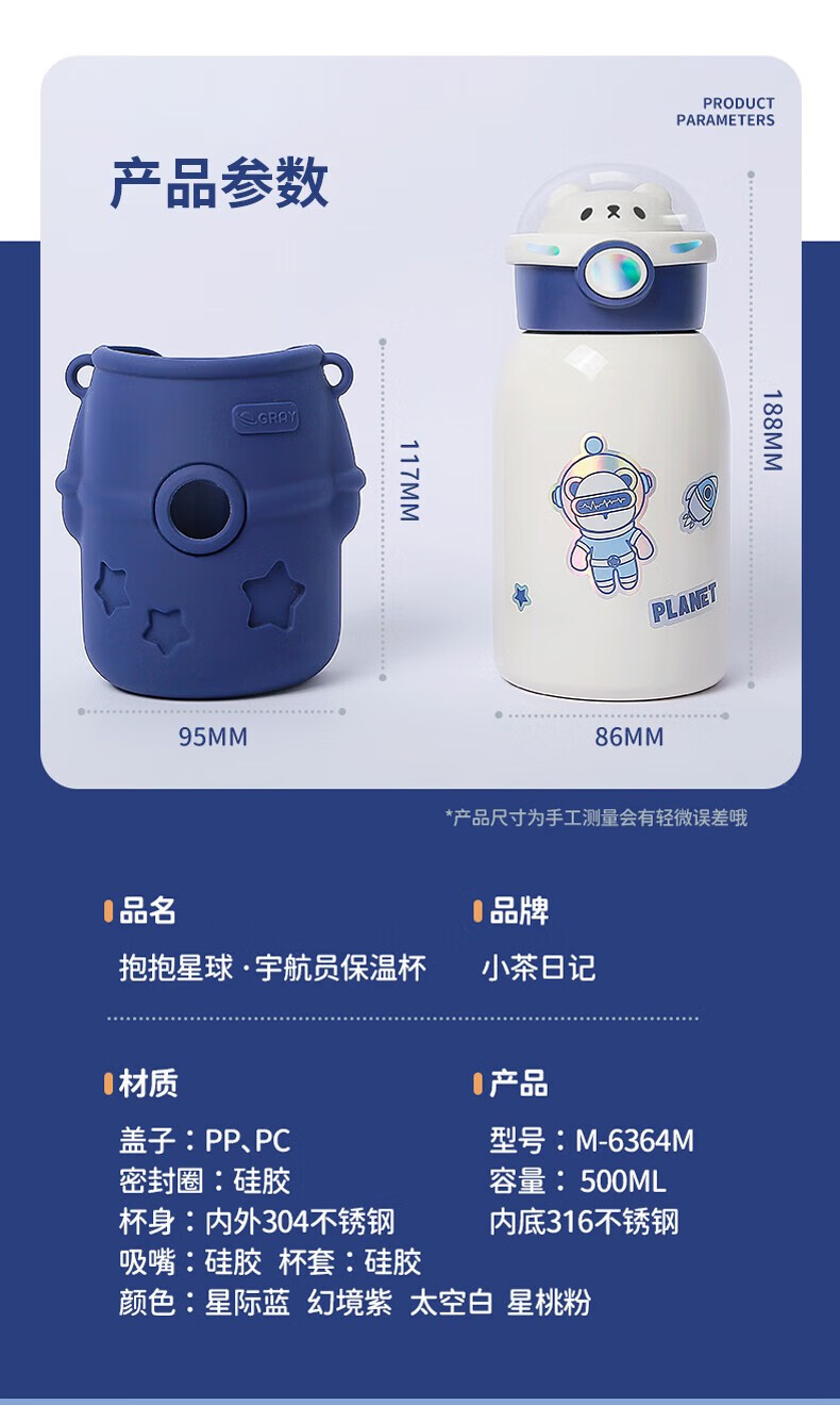 小茶日记抱抱星球316不锈钢儿童保温杯学生吸管水杯子大容量高颜值大肚杯 500ML星际蓝【宇航员保温杯】