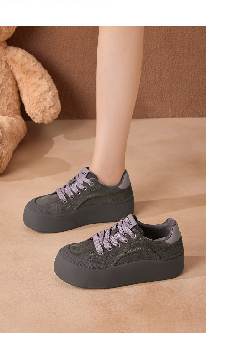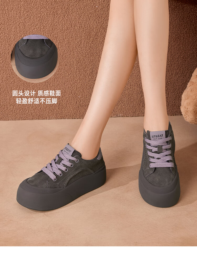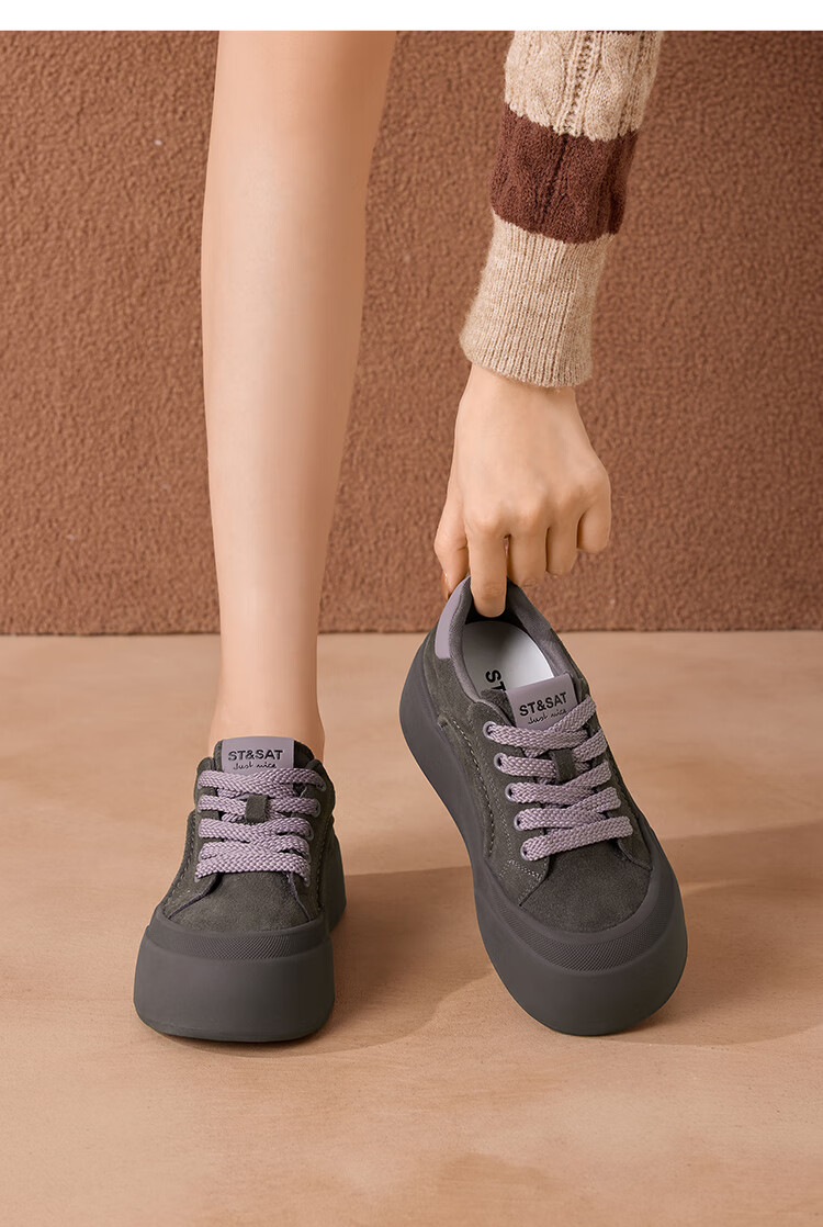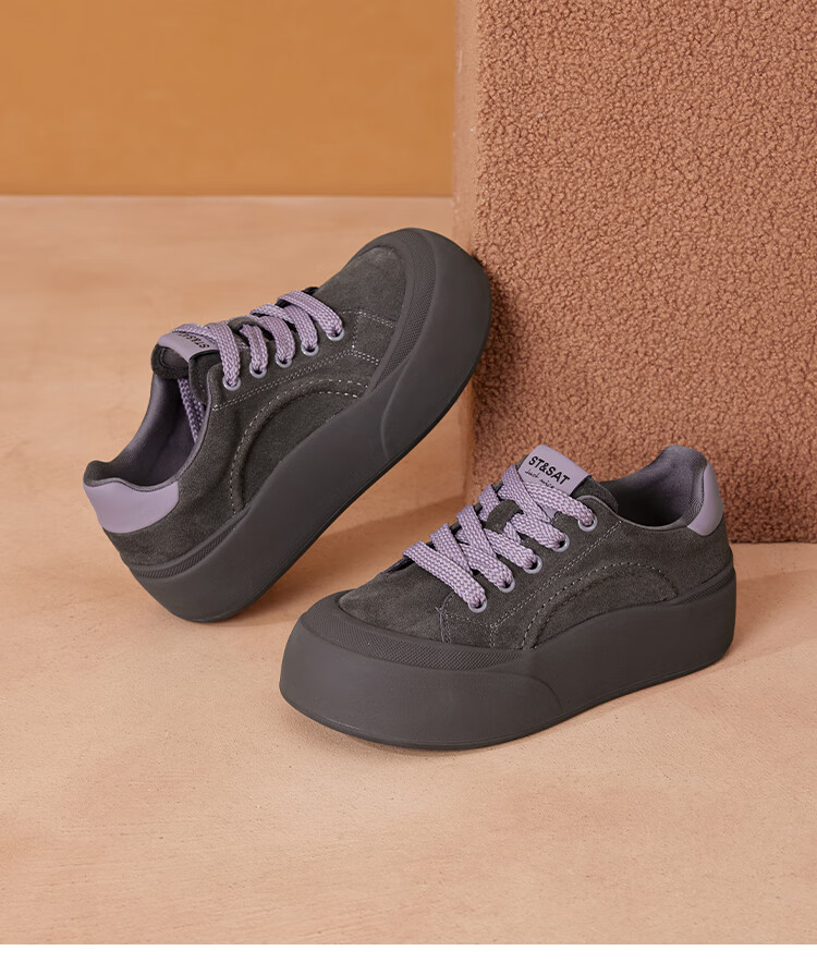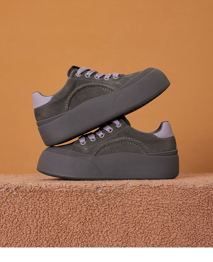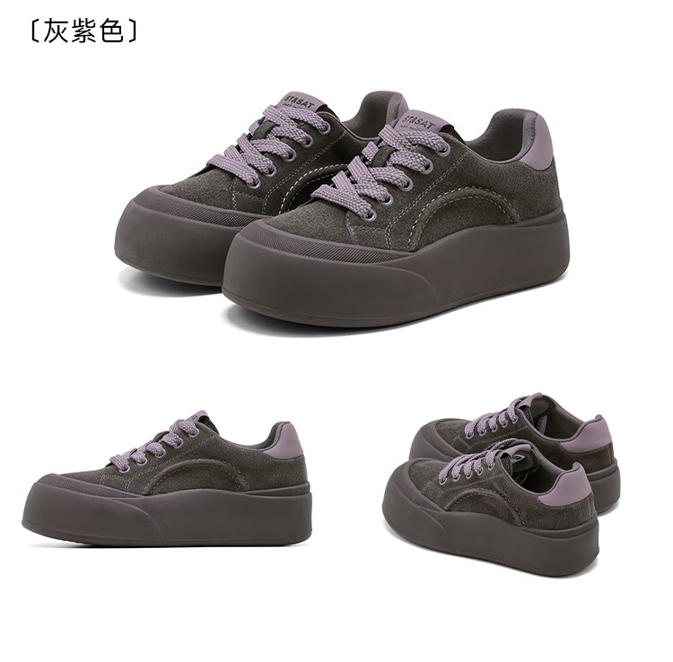 星期六真皮厚底板鞋女款2025新款女鞋冬季复古大头德训运动休闲鞋 灰紫色 37