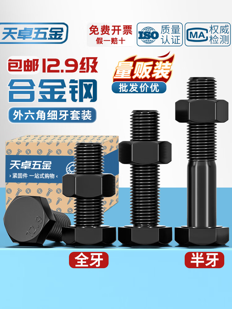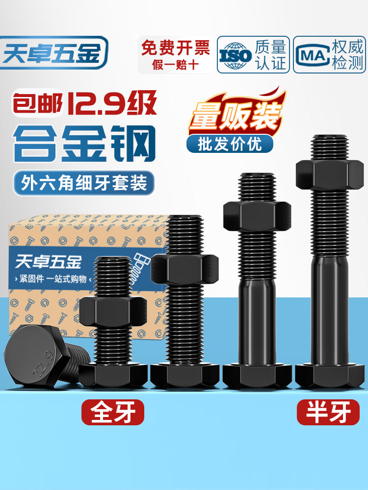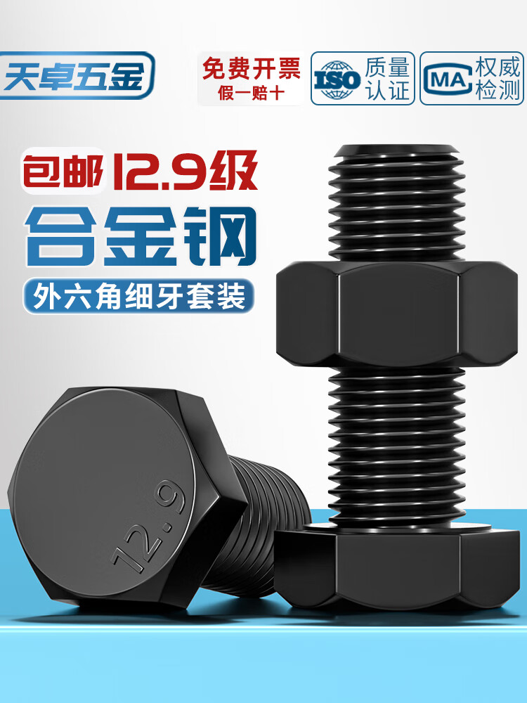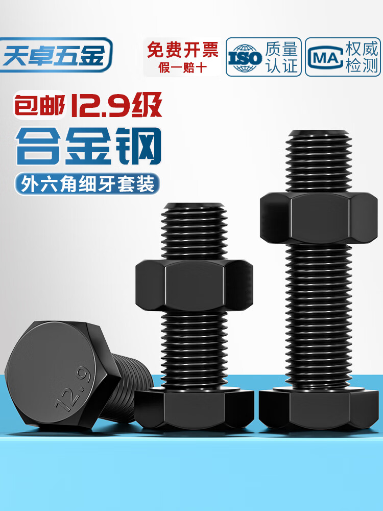 天卓五金12.9级细牙外六角螺丝细丝螺母螺钉细扣幼牙螺栓套装M8M10M12-M36 M18*1.5*200半牙【2套】