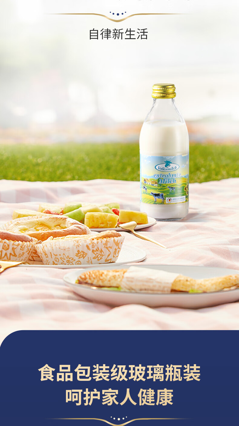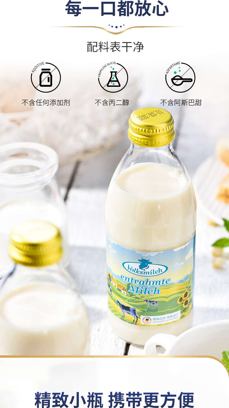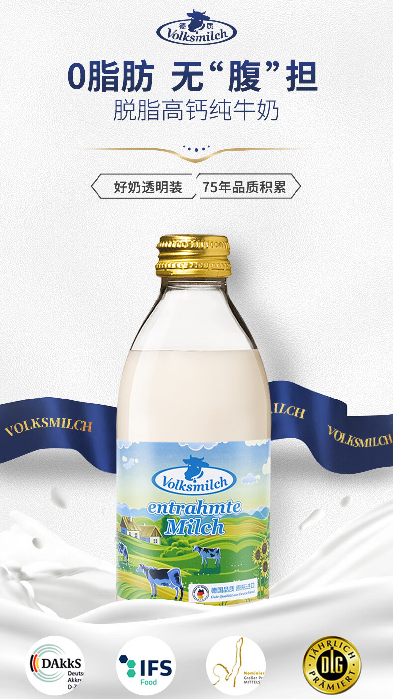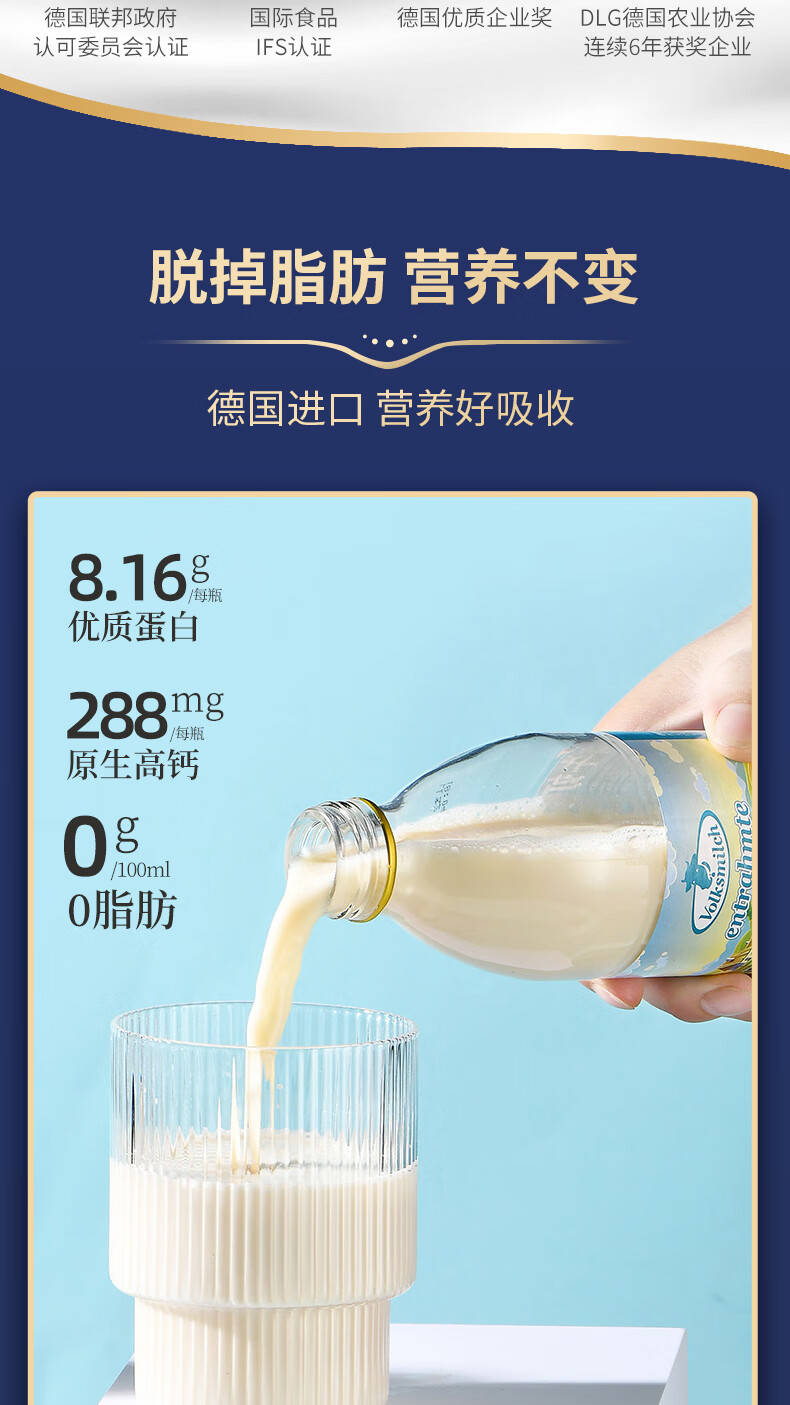 德质(Volksmilch)脱脂纯牛奶240ml*20整箱 进口牛奶 0脂0蔗糖脱脂牛奶