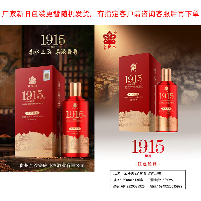 酿荟红色经典1915酱香型白酒纯粮酿造 53度 500mL 2瓶 (配礼袋)贵州金沙古