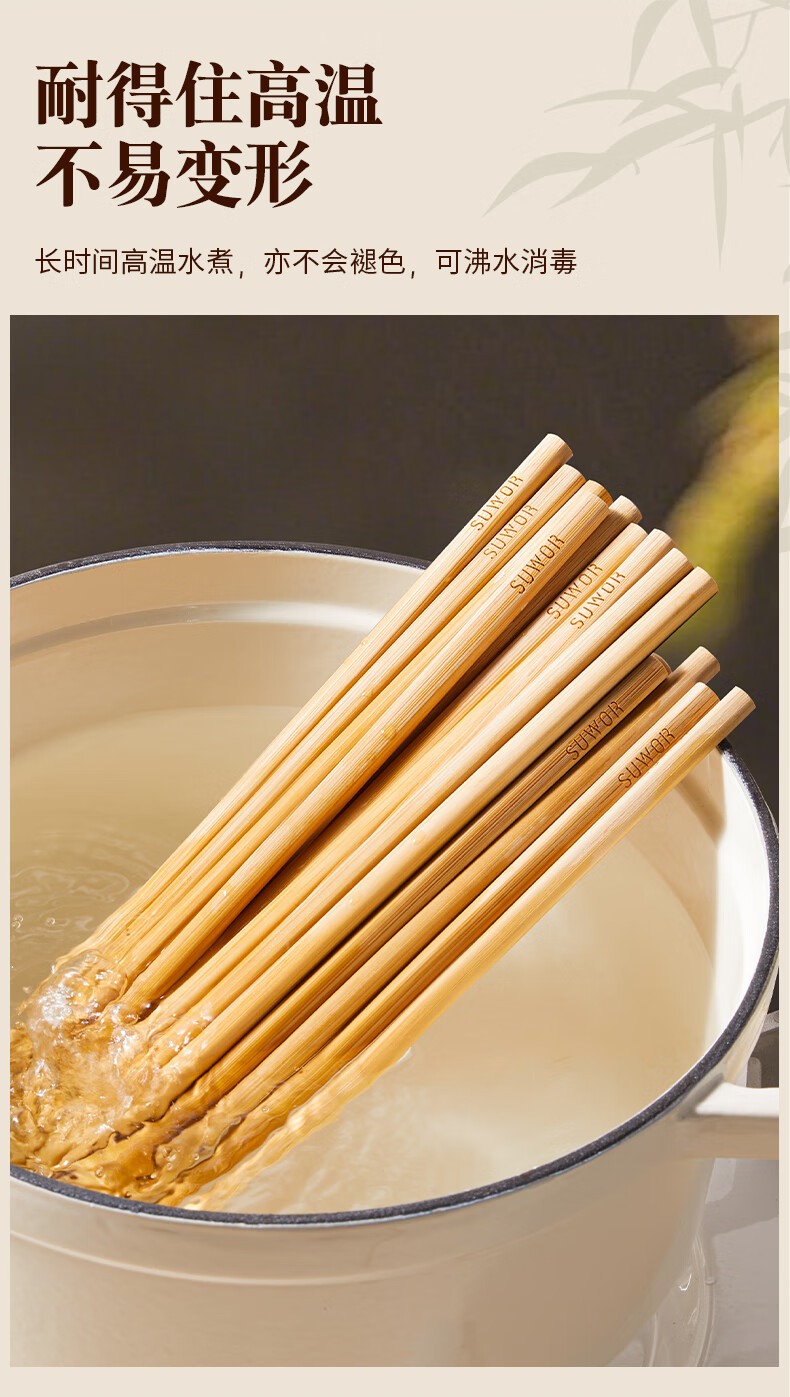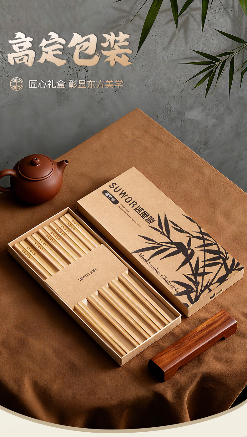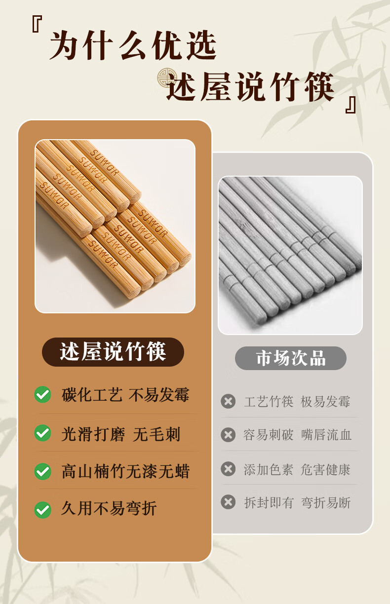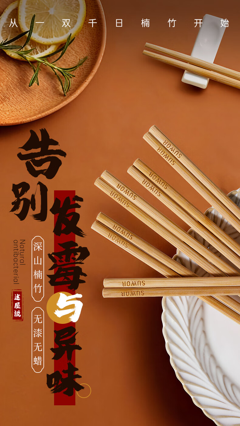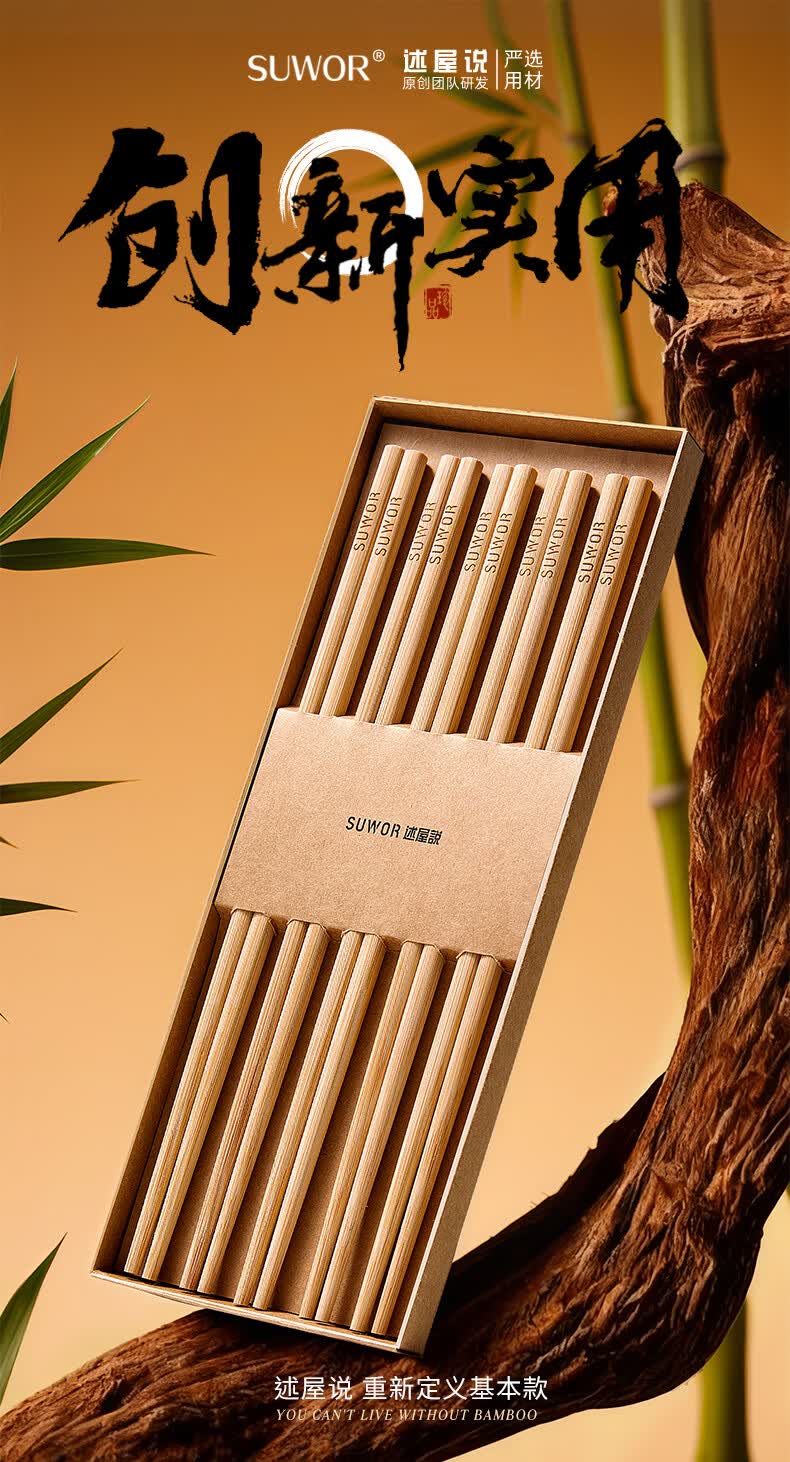 述屋说天然竹筷子 竹质餐具套装食品级防霉抗菌家用无漆无蜡10双装