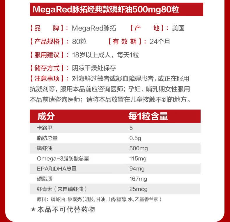 MegaRed脉拓南极磷虾油软胶囊 深海鱼油omega-3美国进口高纯度500mg80粒 【热销爆款】养护心血管 80粒*1瓶