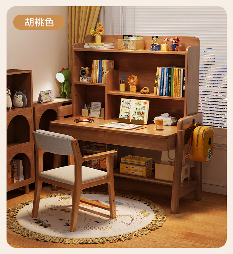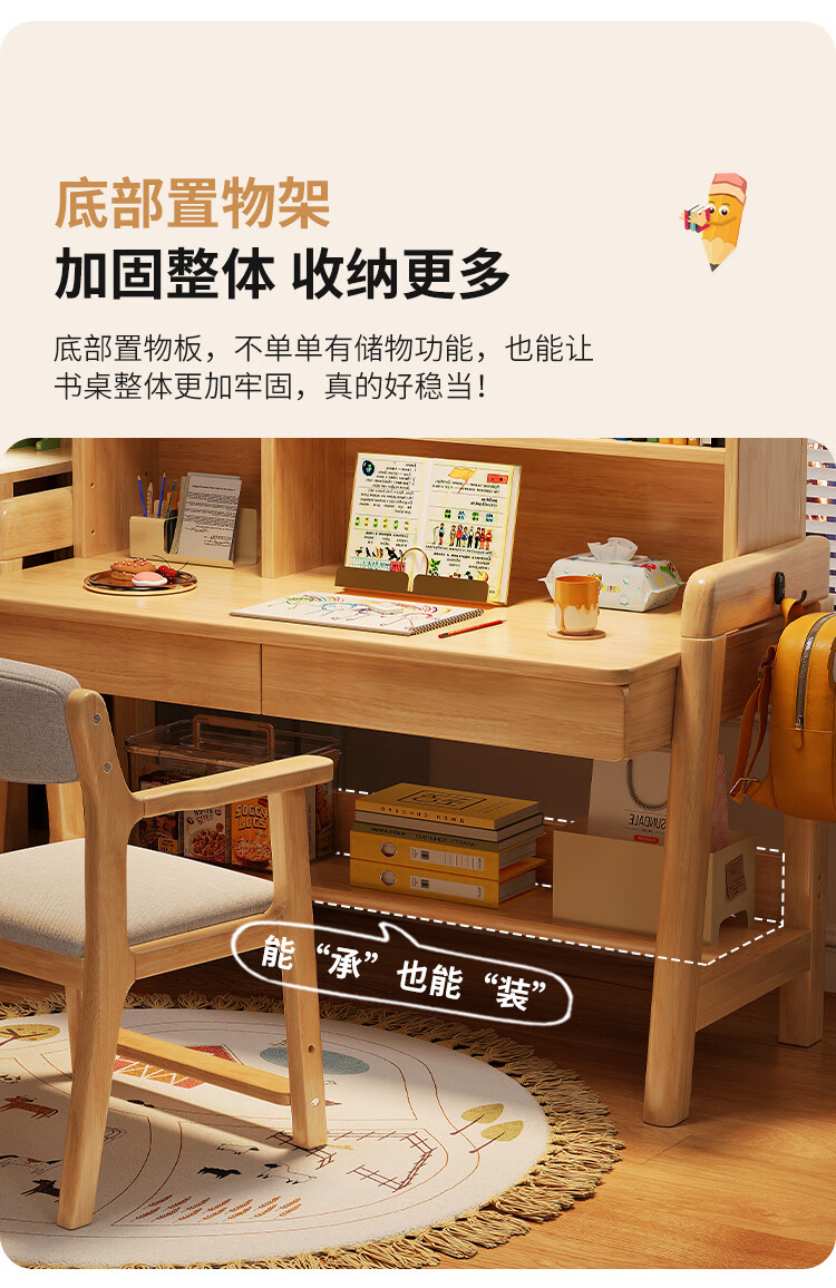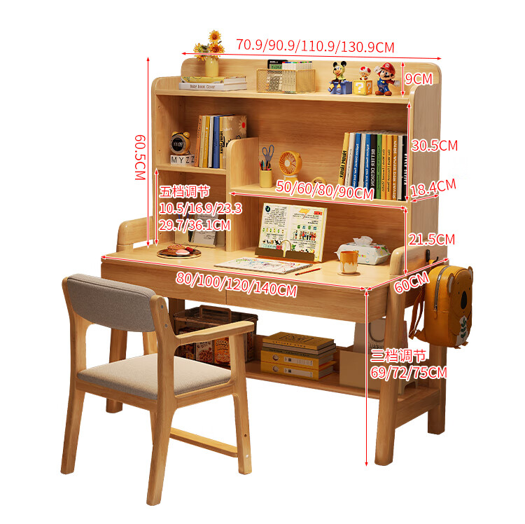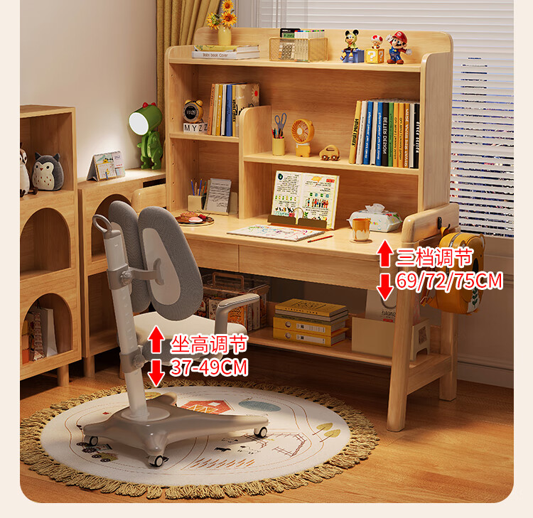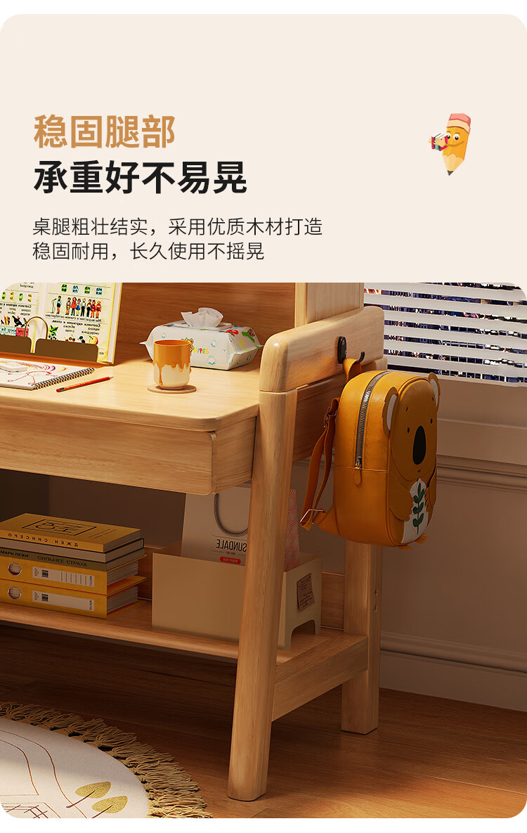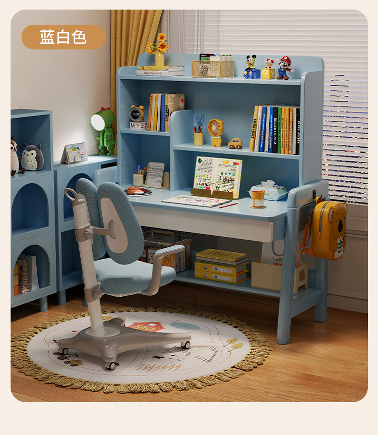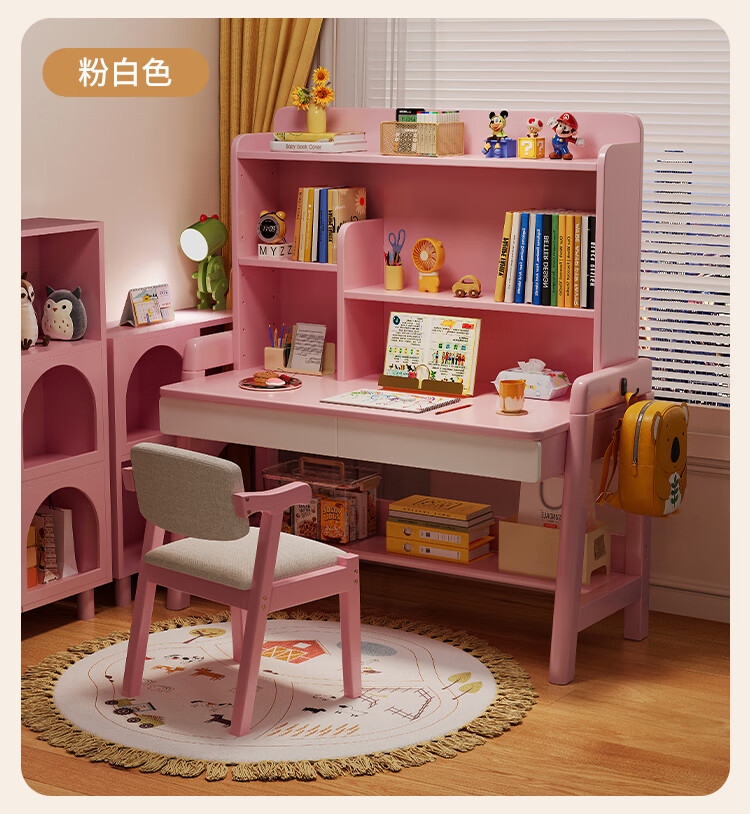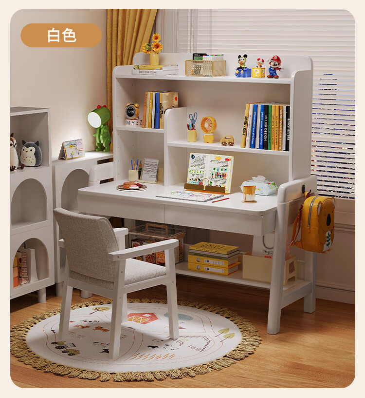 芈迪实木书桌学生家用书桌书架一体桌子儿童学习桌电脑桌升降学生书桌 白色单桌 80*60*135.5cm