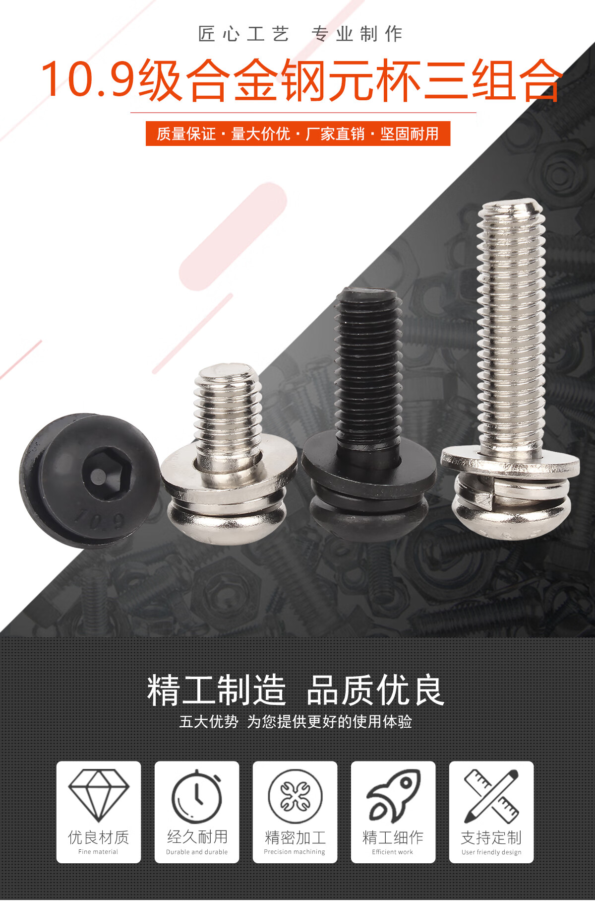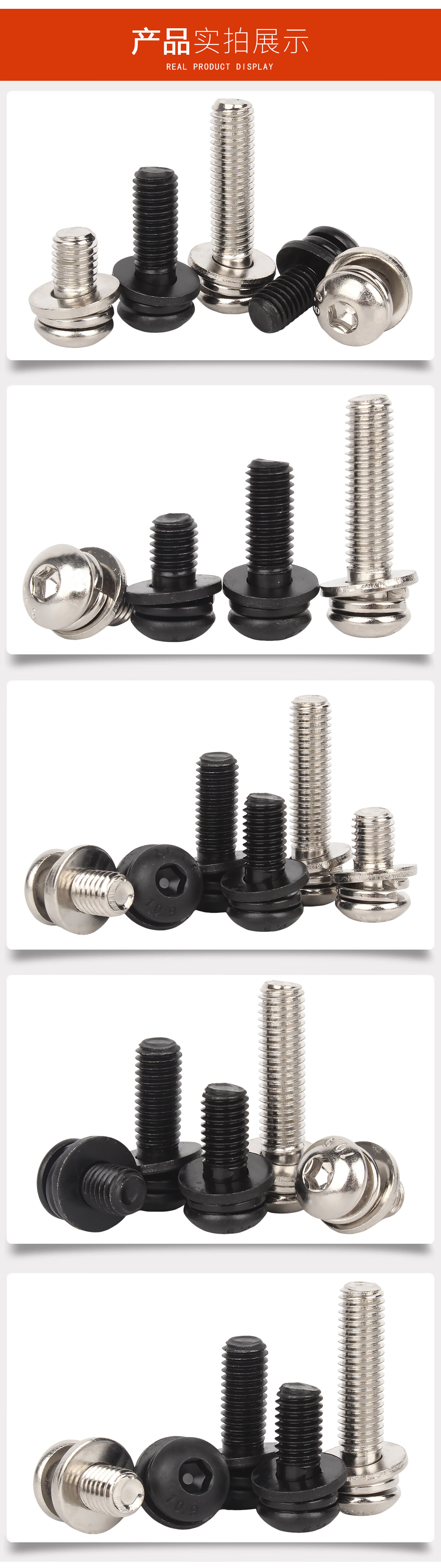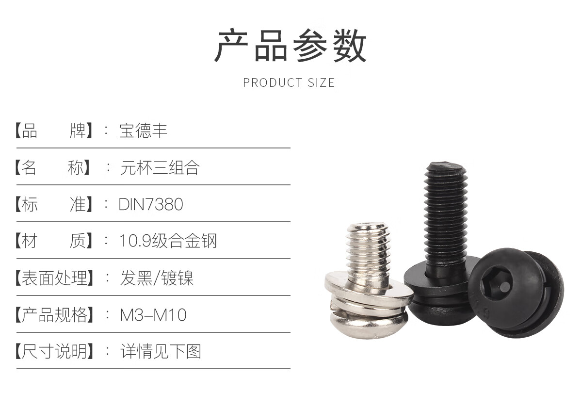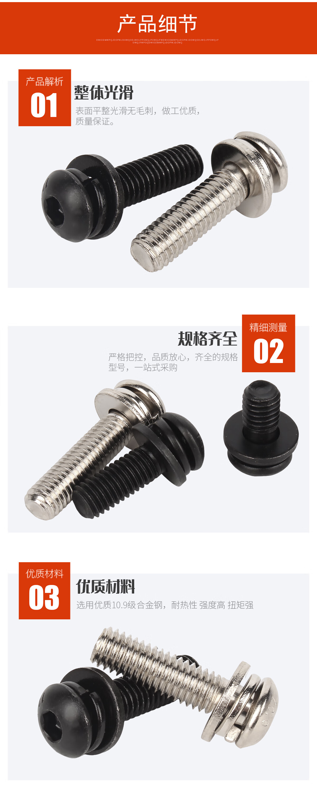宝德丰10.9级铁黑半圆头三组合螺丝钉镀镍盘头蘑菇头螺栓自带平弹垫套装 铁黑M3x6(50个)