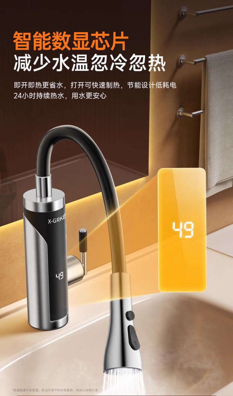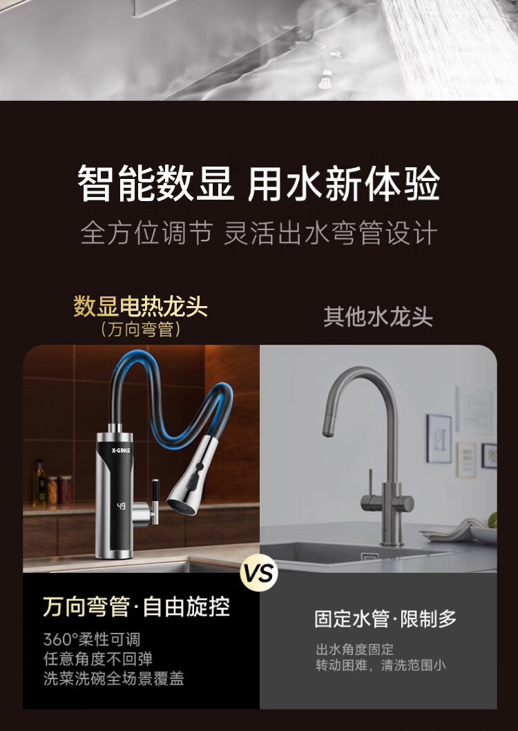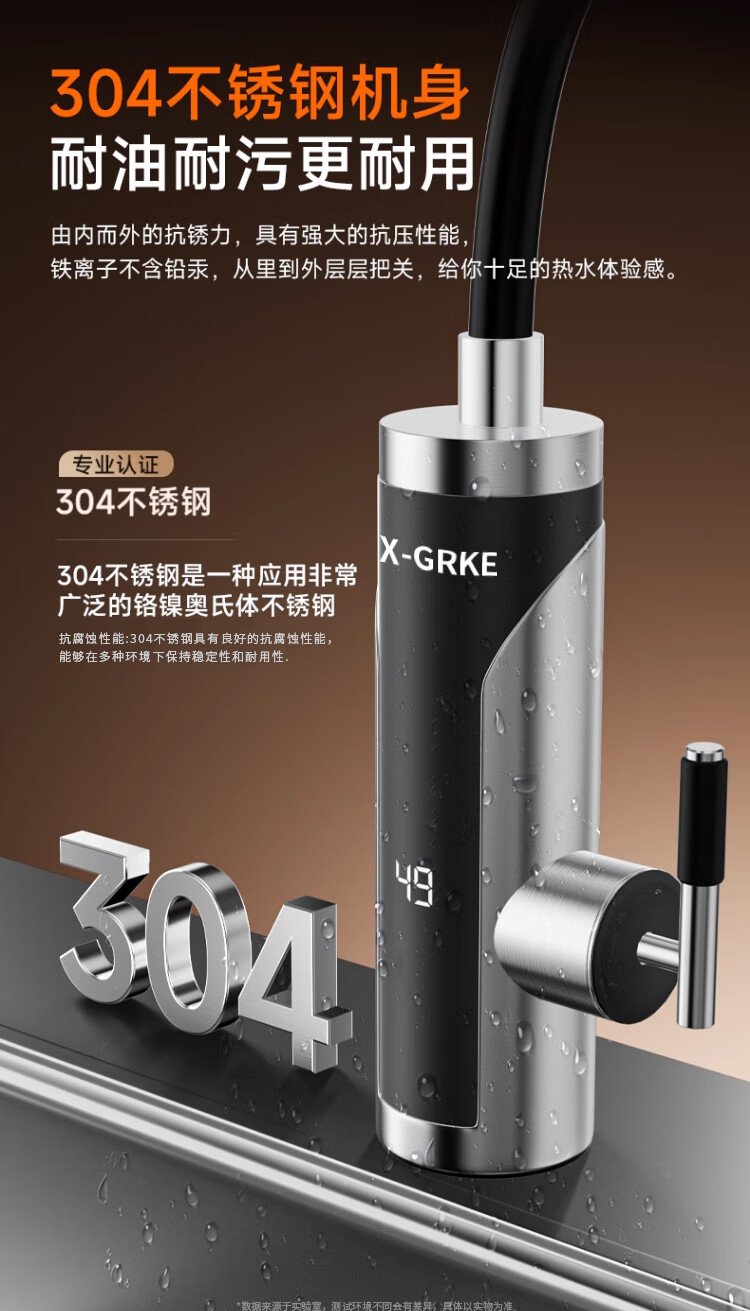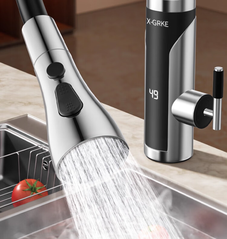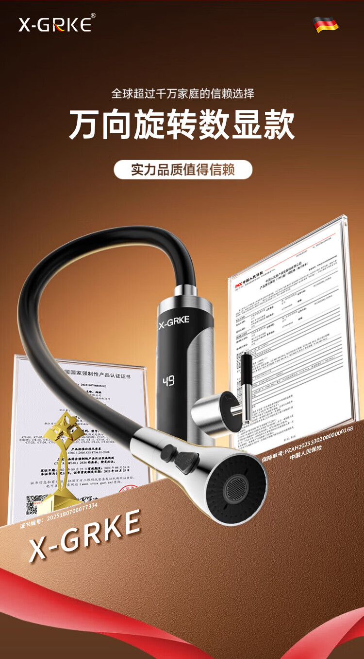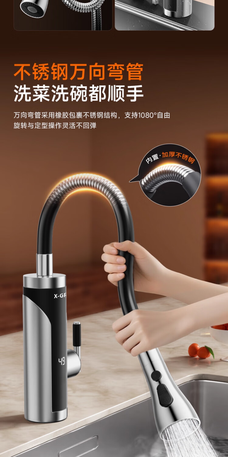 X-GRKE【德国】电热水龙头即热式万向机械臂智能变频数显防漏电快速热水专用304不锈钢厨房热水冷热两用 304不锈钢【万向管】漏保+1.1米线+置物架 万向喷头+进水管+漏保插头+置物架