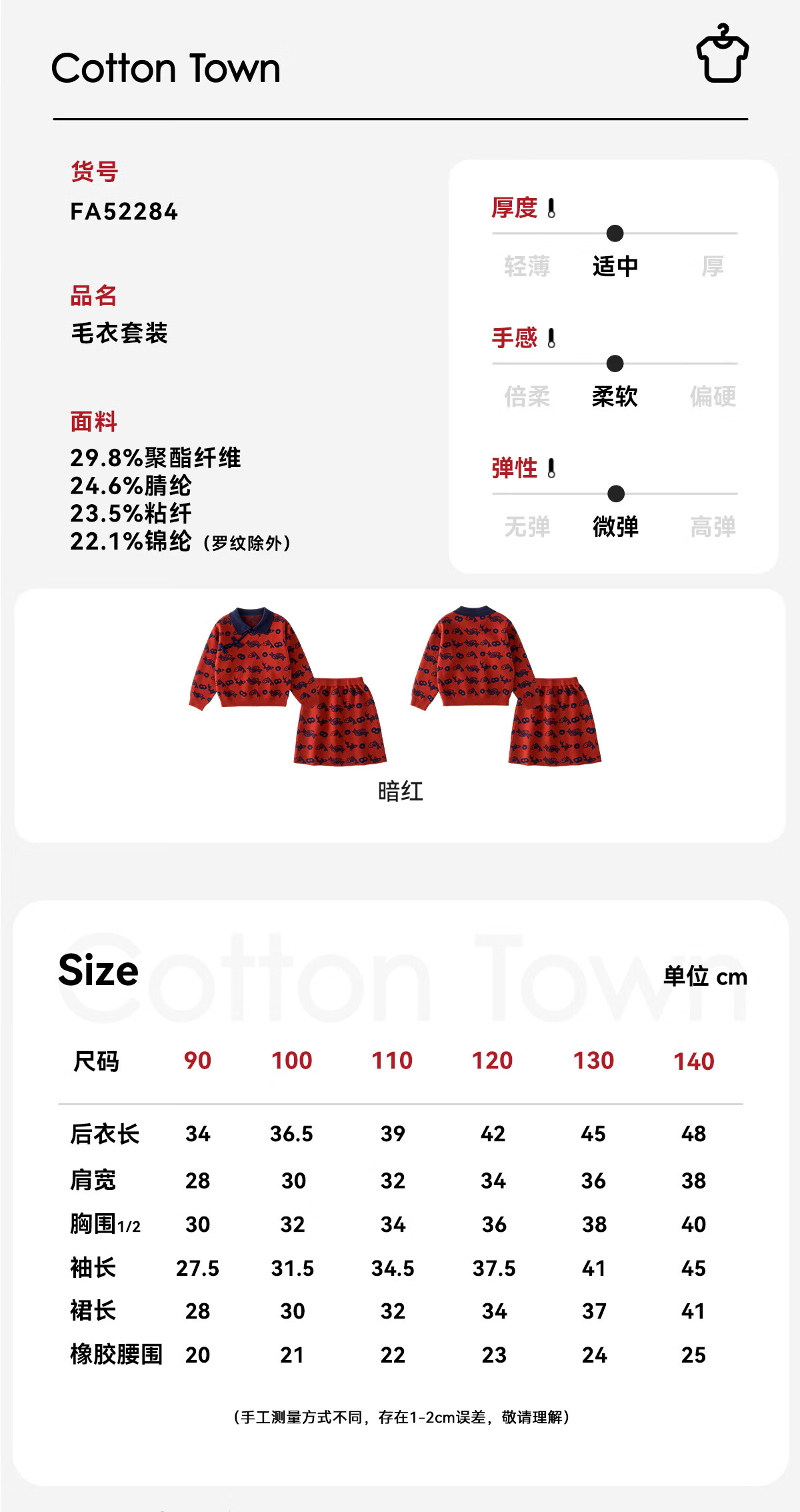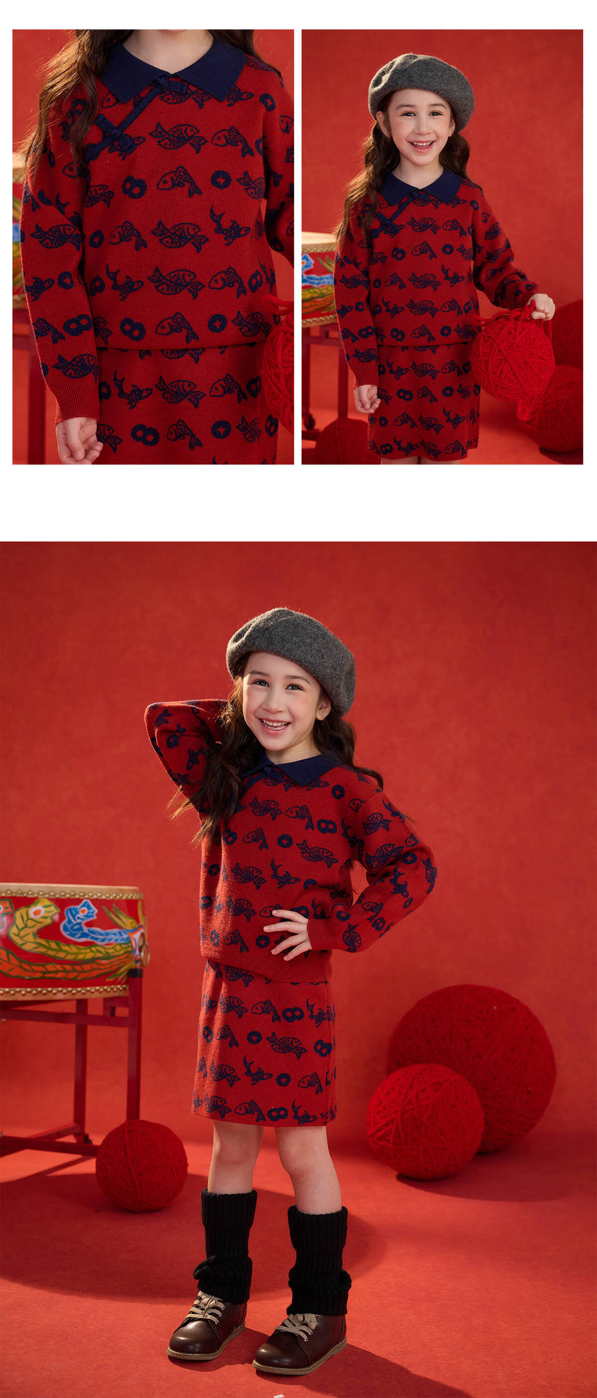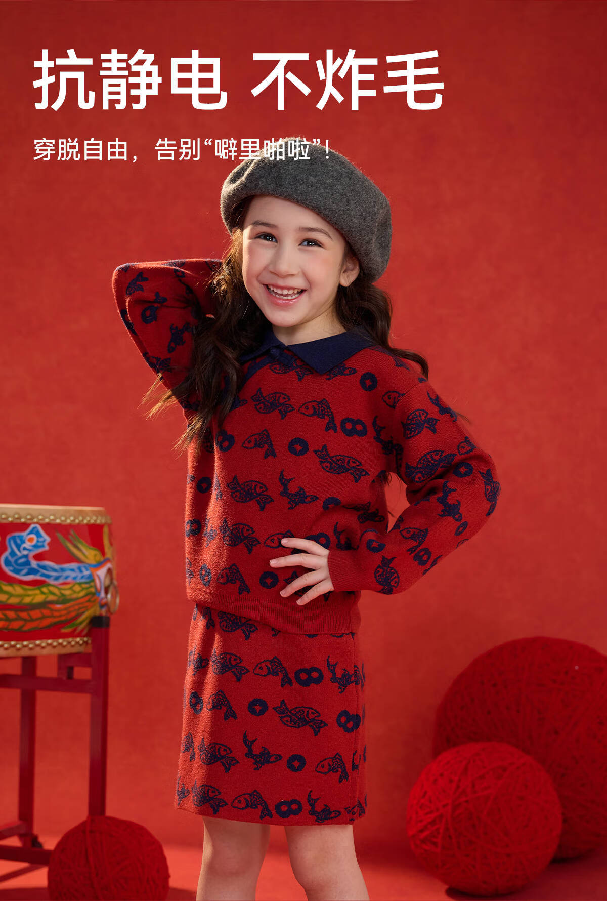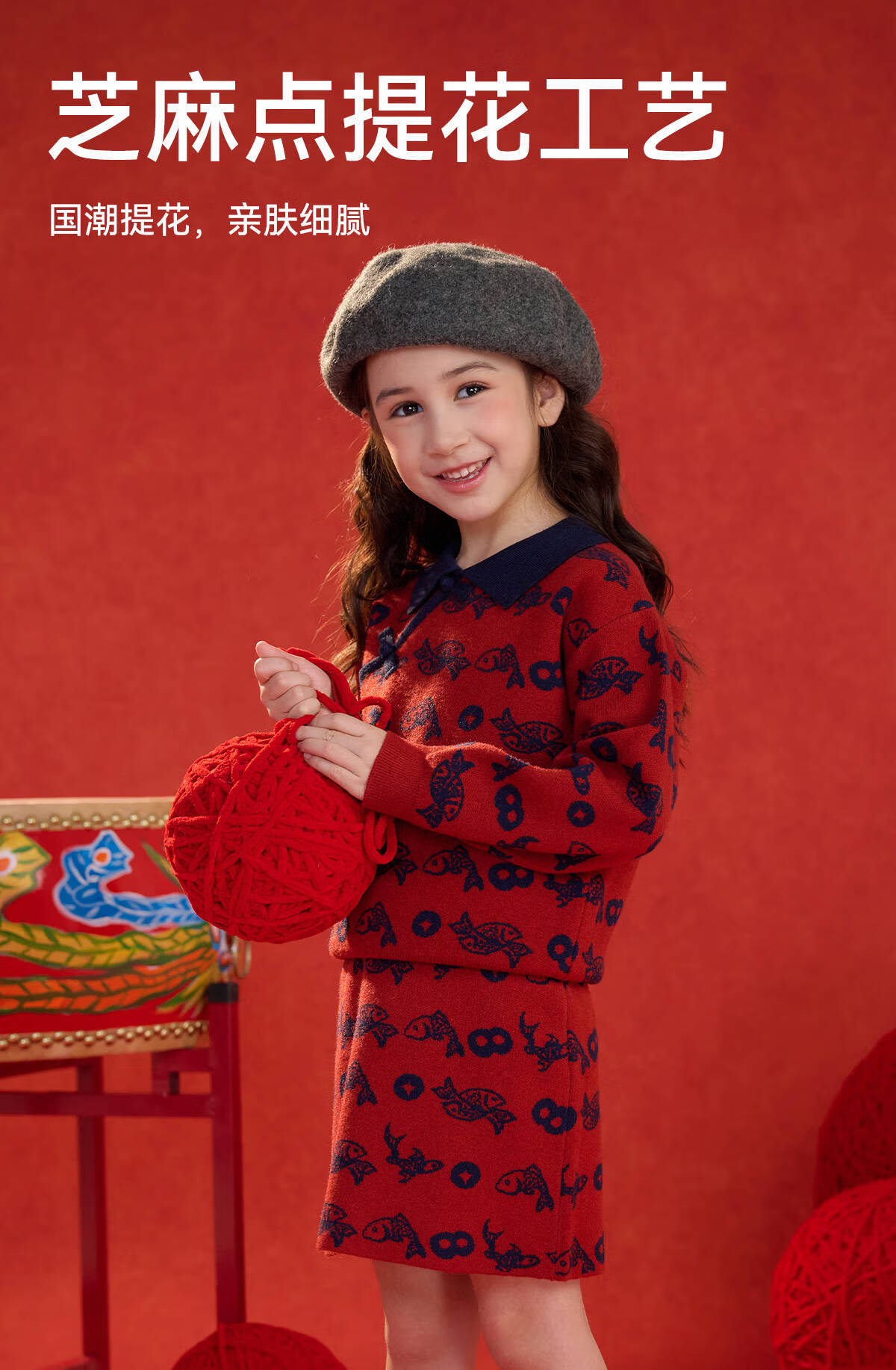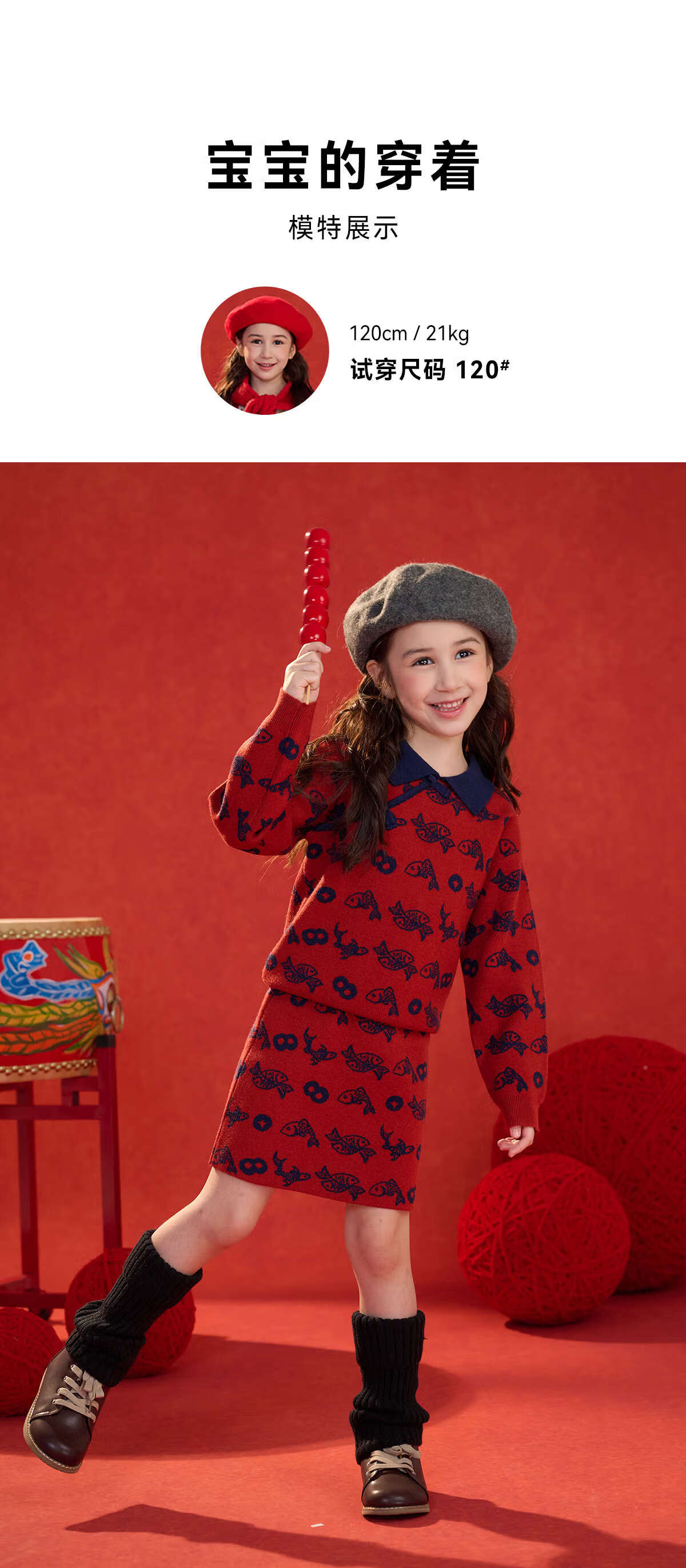 棉花堂(cottontown)【新年】棉花堂拜年服女童冬裙套装洋气红色毛衣儿童过年裙子衣服 暗红 140 140/68