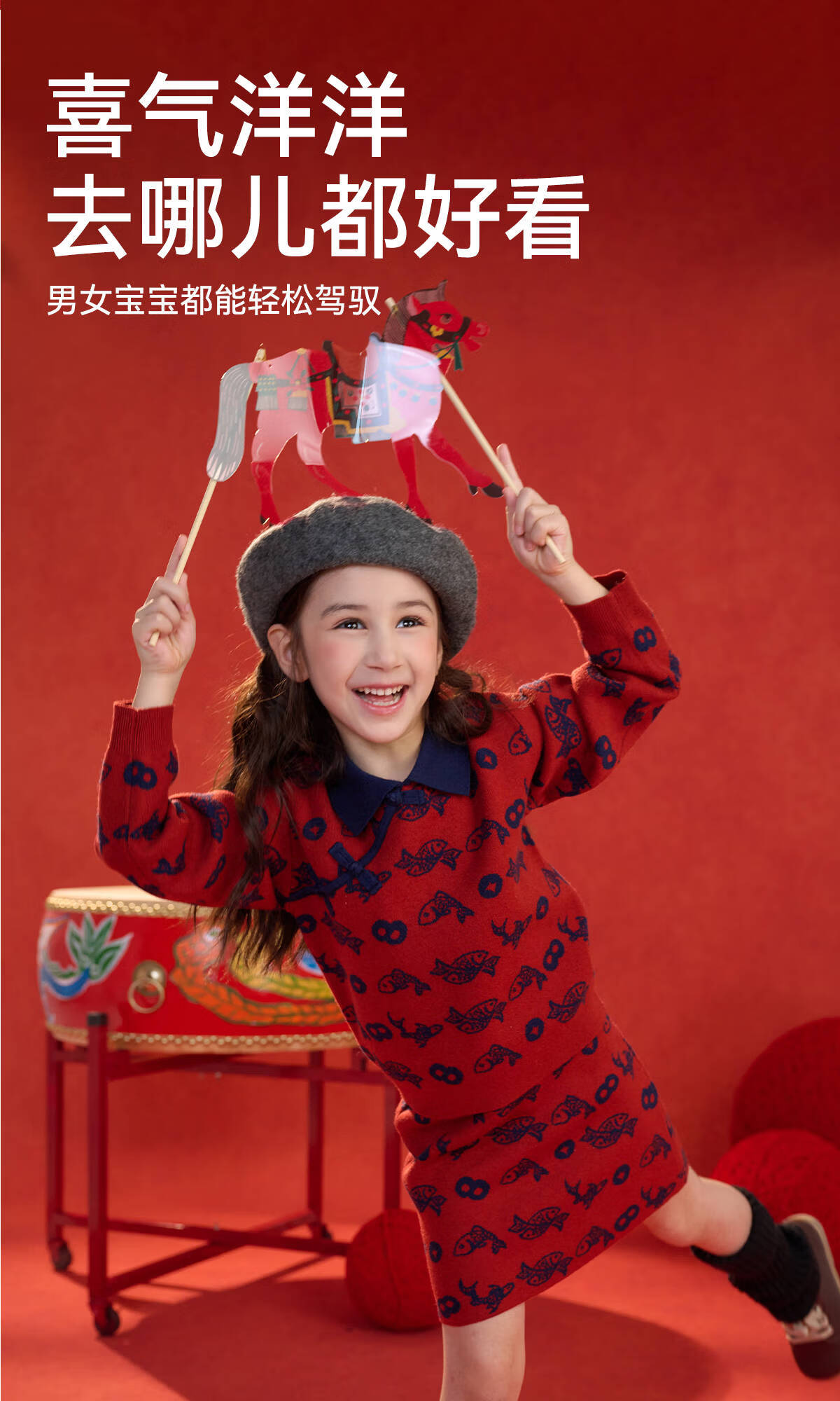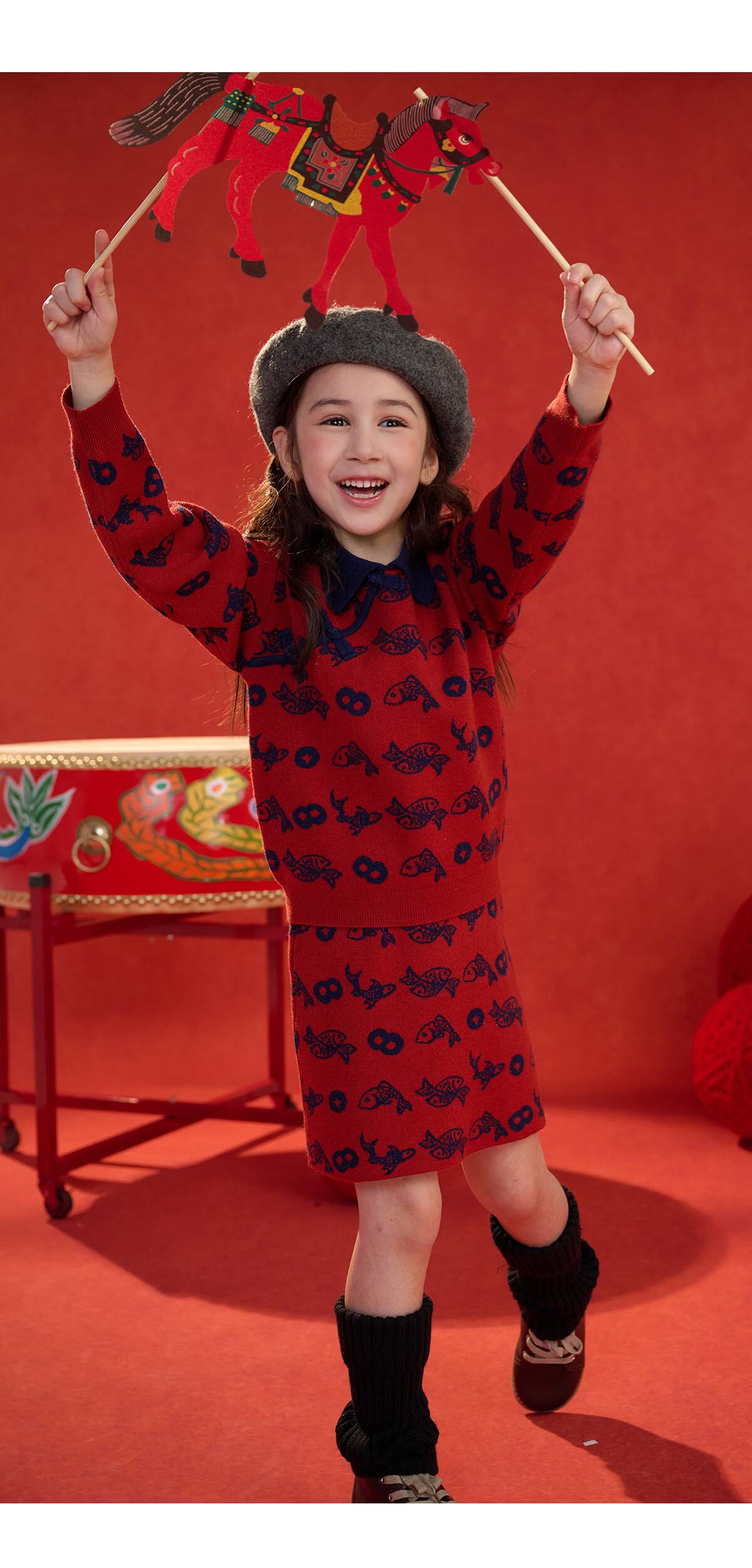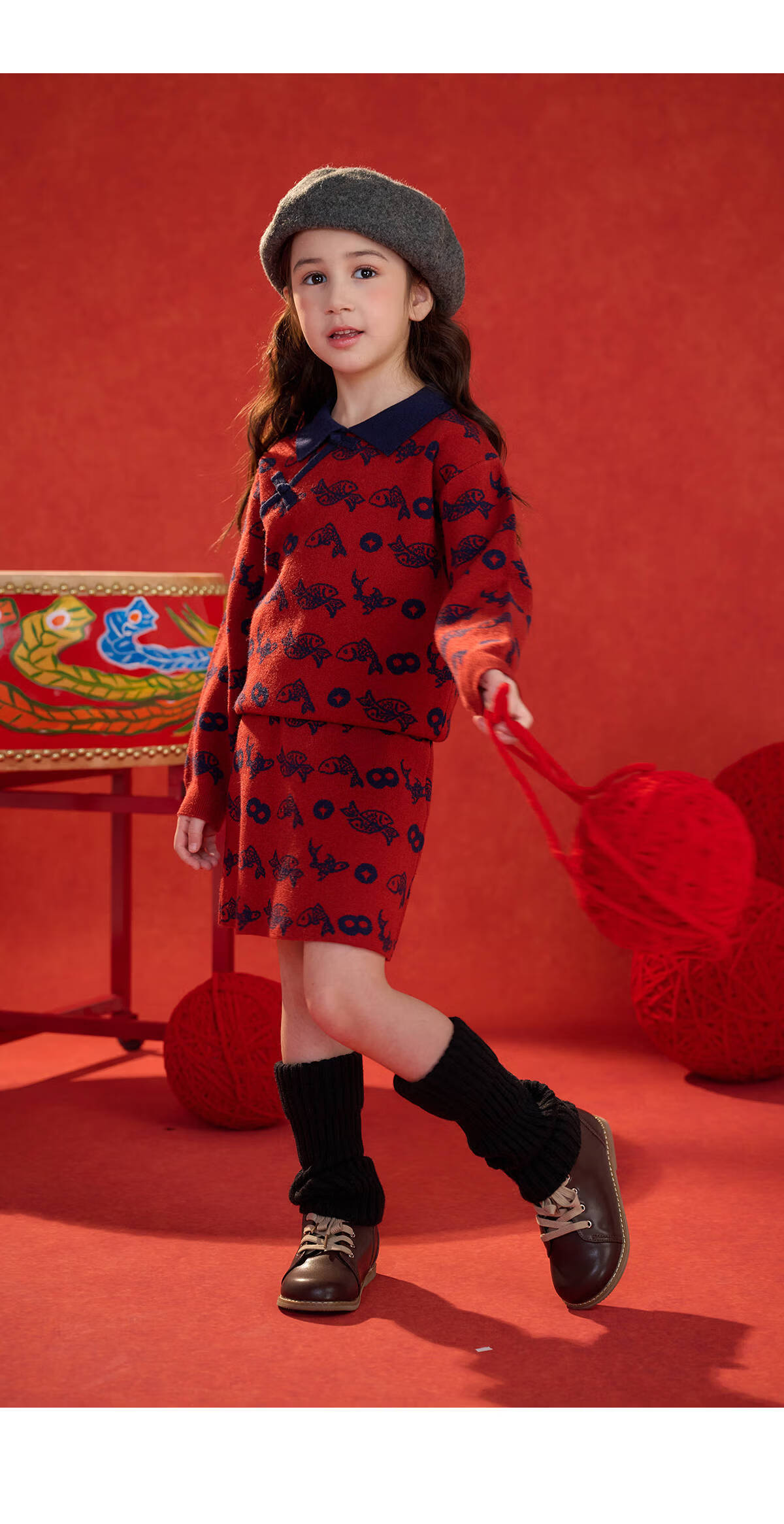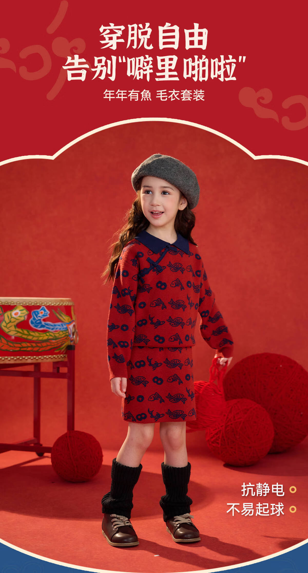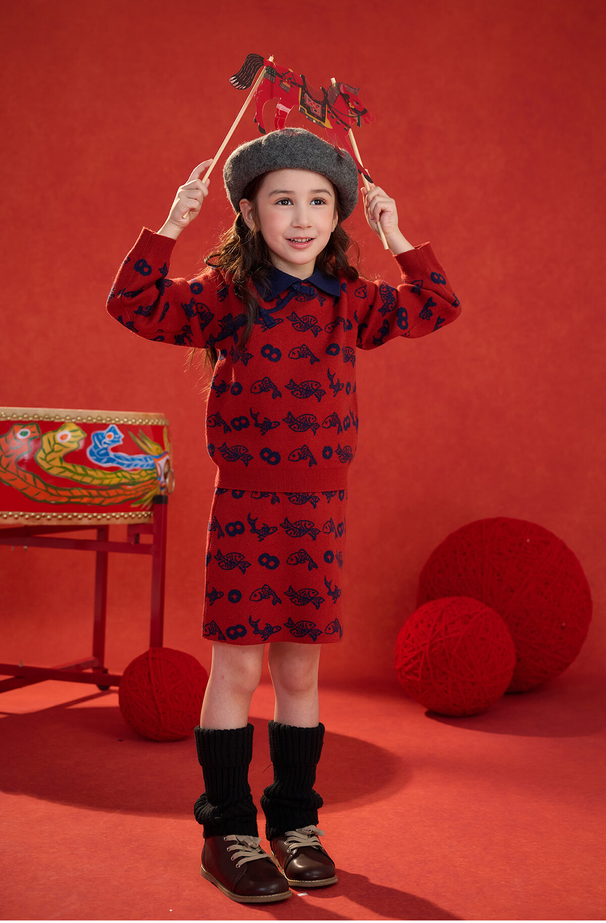 棉花堂(cottontown)【新年】棉花堂拜年服女童冬裙套装洋气红色毛衣儿童过年裙子衣服 暗红 140 140/68
