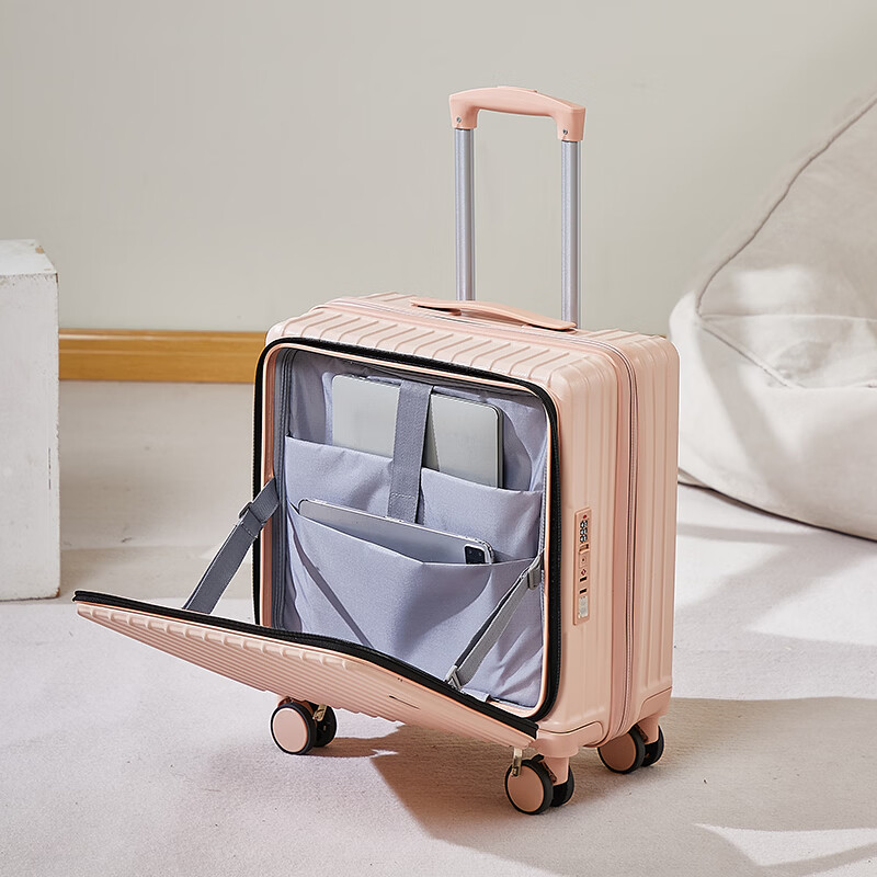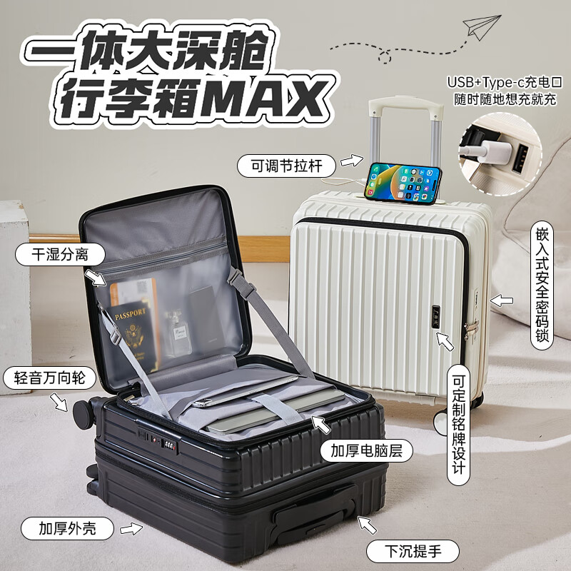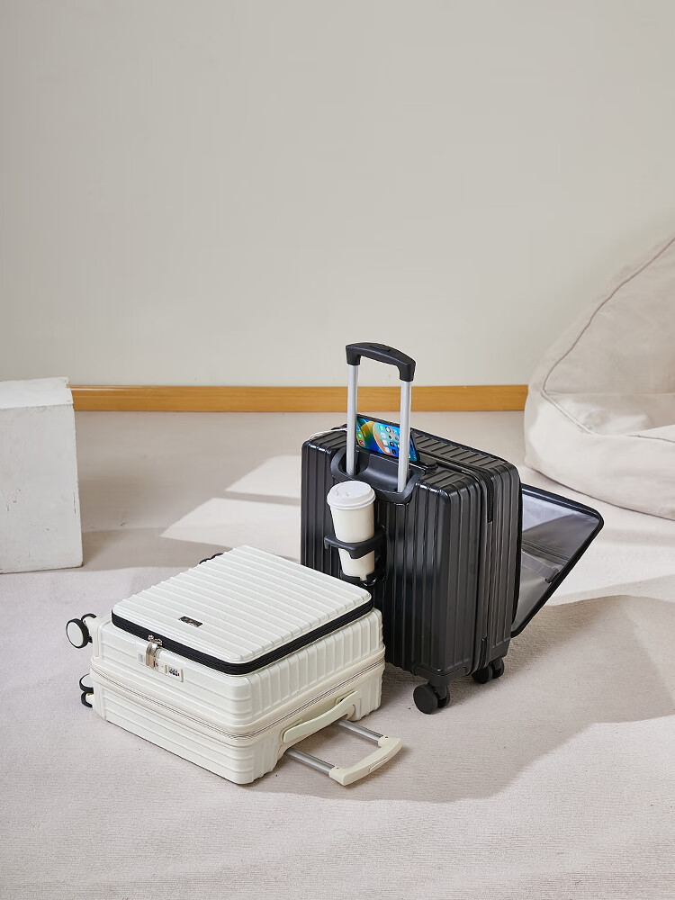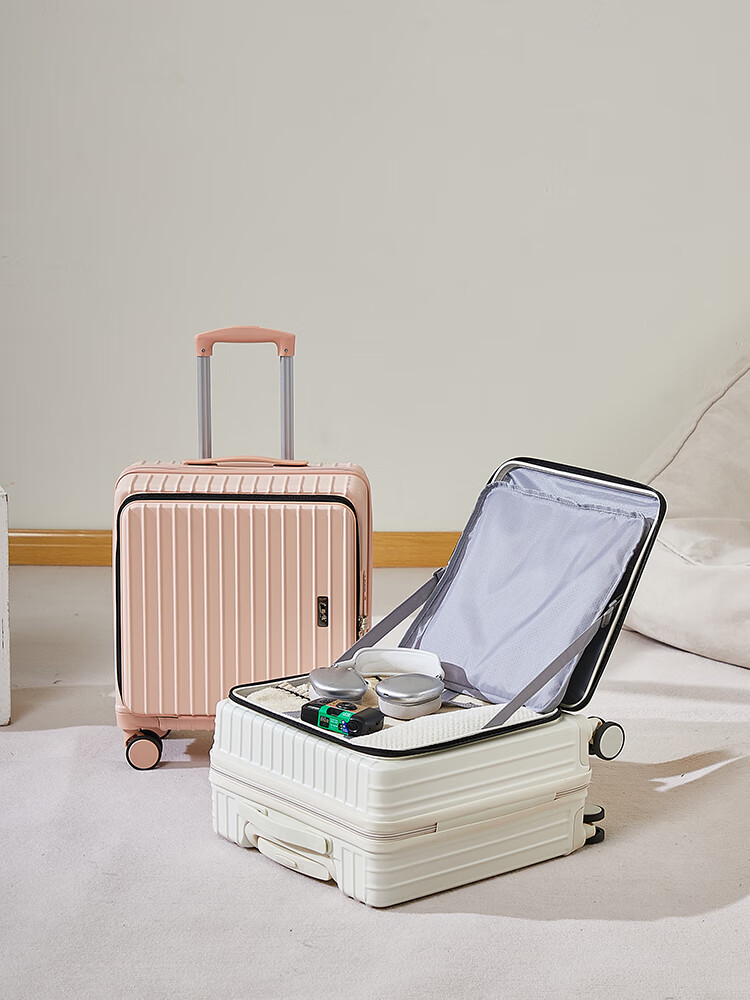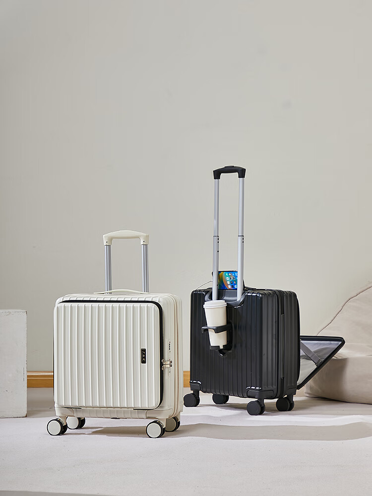 广璐迪(GUANG LU DI)前开盖深舱免托运行李箱拉杆箱小型旅行箱男大容量密码登机箱包女 一九开深舱款/米白色-加厚电脑层 18英寸 干湿分离+杯架+双充电孔