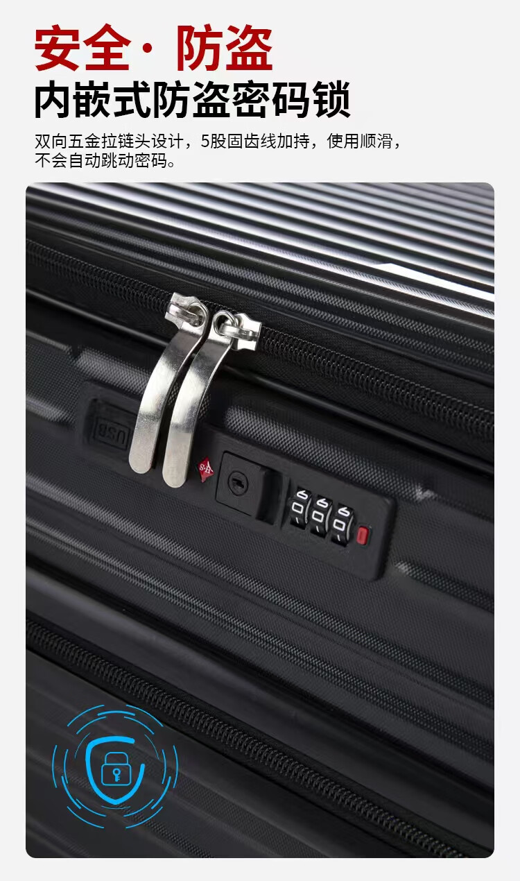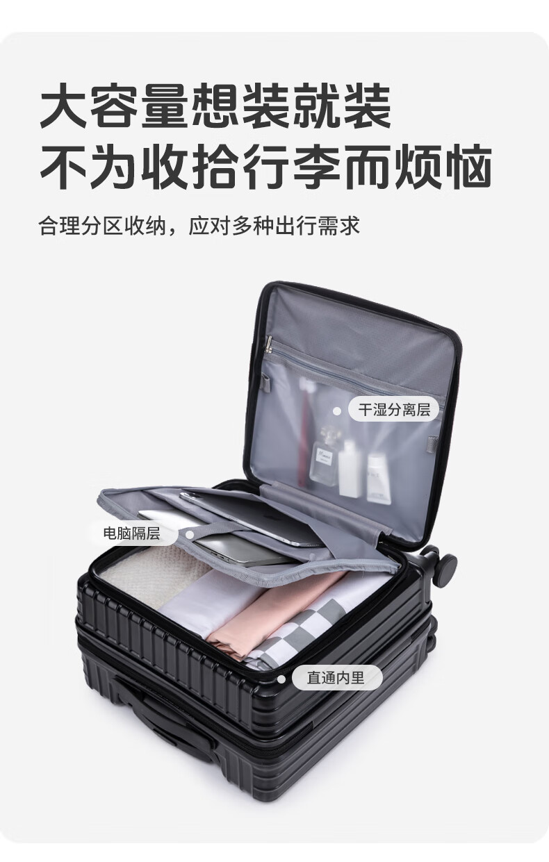 广璐迪可扩展前开盖学生行李箱拉杆箱男大容量密码旅行箱女小登机皮箱包 前置开口拉链箱/奢华银+干湿分离 26英寸 大容量+双充电口+可扩展