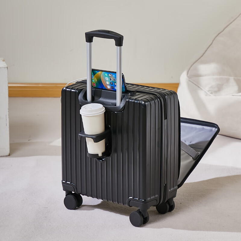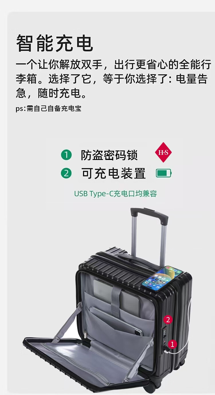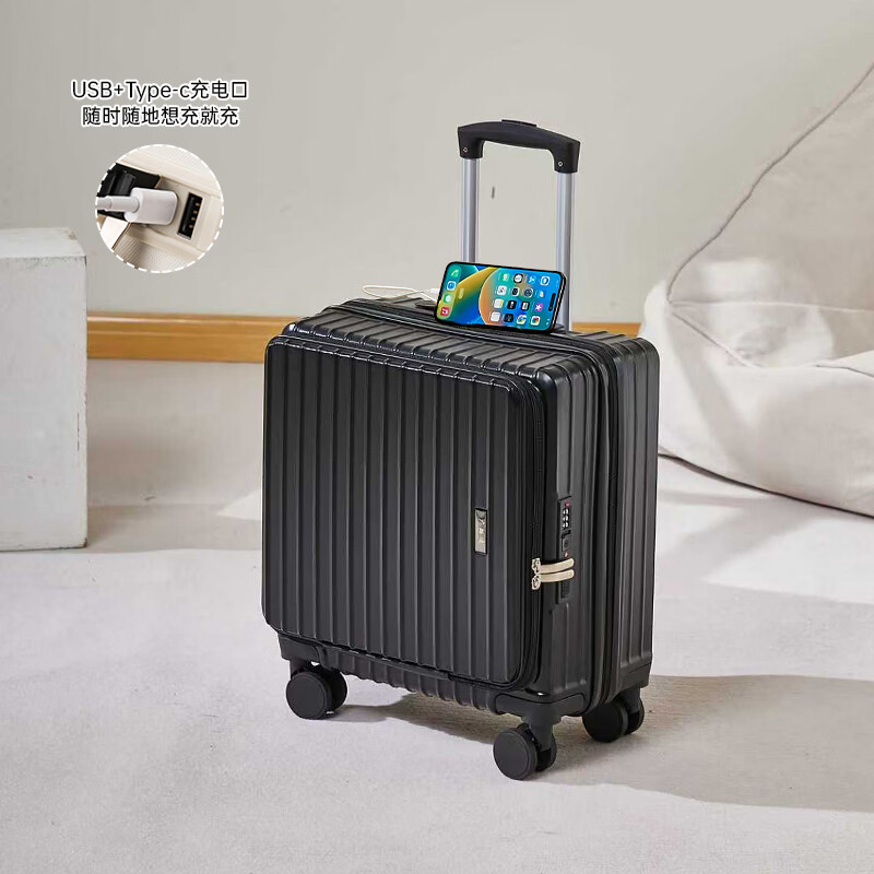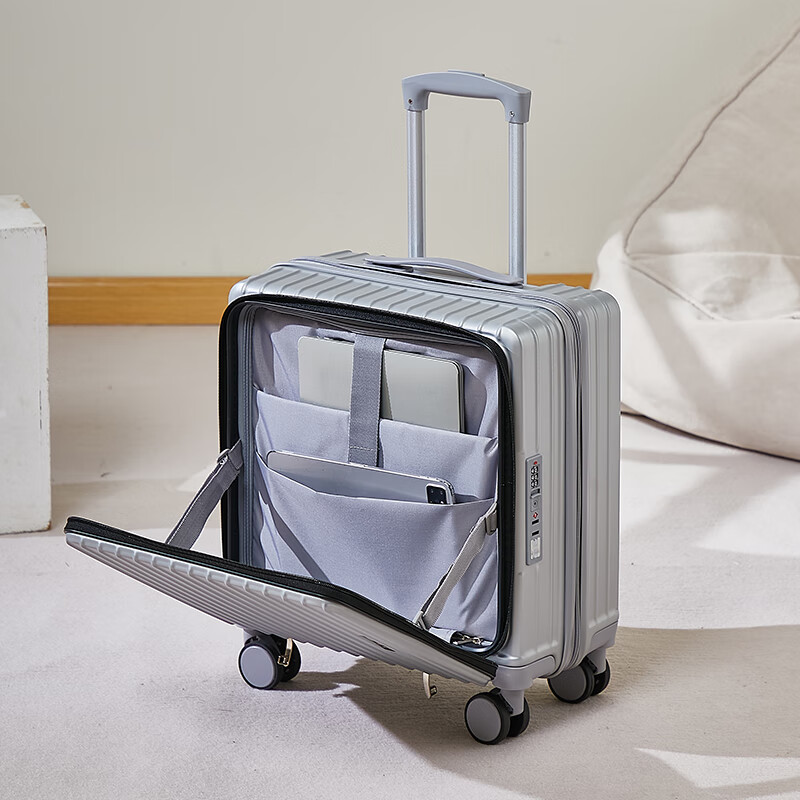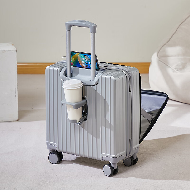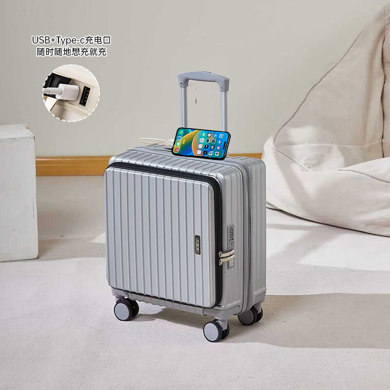 广璐迪前开盖小行李箱拉杆箱可上飞机登机箱18密码旅行箱子皮箱结实耐用 奢华银 【USB/Type-c 双充电口】 18英寸 登机箱+干湿分离+杯架