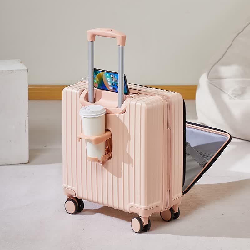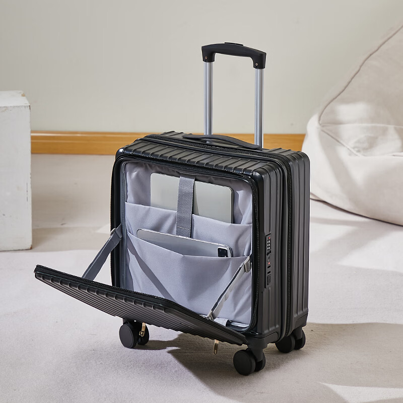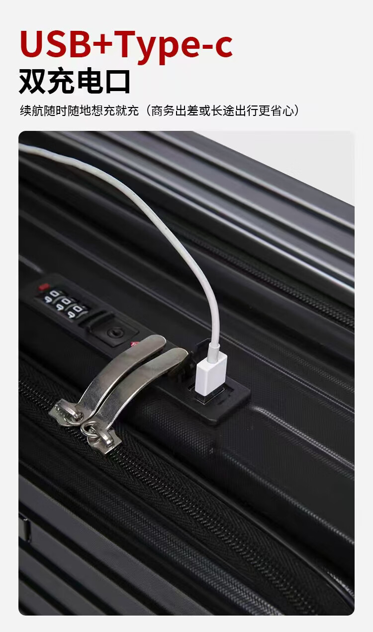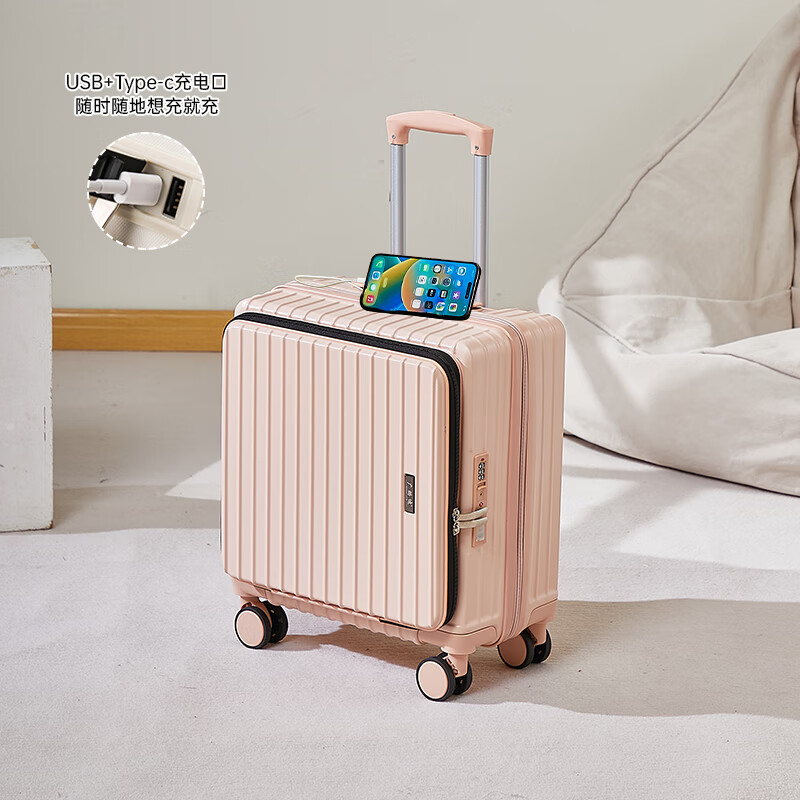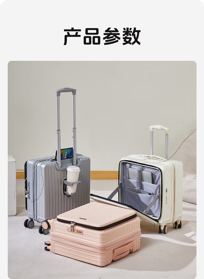 广璐迪前开盖小行李箱拉杆箱可上飞机登机箱18密码旅行箱子皮箱结实耐用 奢华银 【USB/Type-c 双充电口】 18英寸 登机箱+干湿分离+杯架