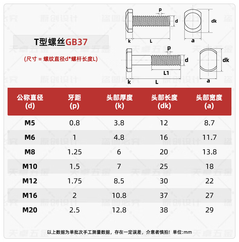 天卓五金304不锈钢T型螺丝GB37模具槽用螺栓T形压板螺钉5M6M8M10M12M16M20 M6*30【20个】