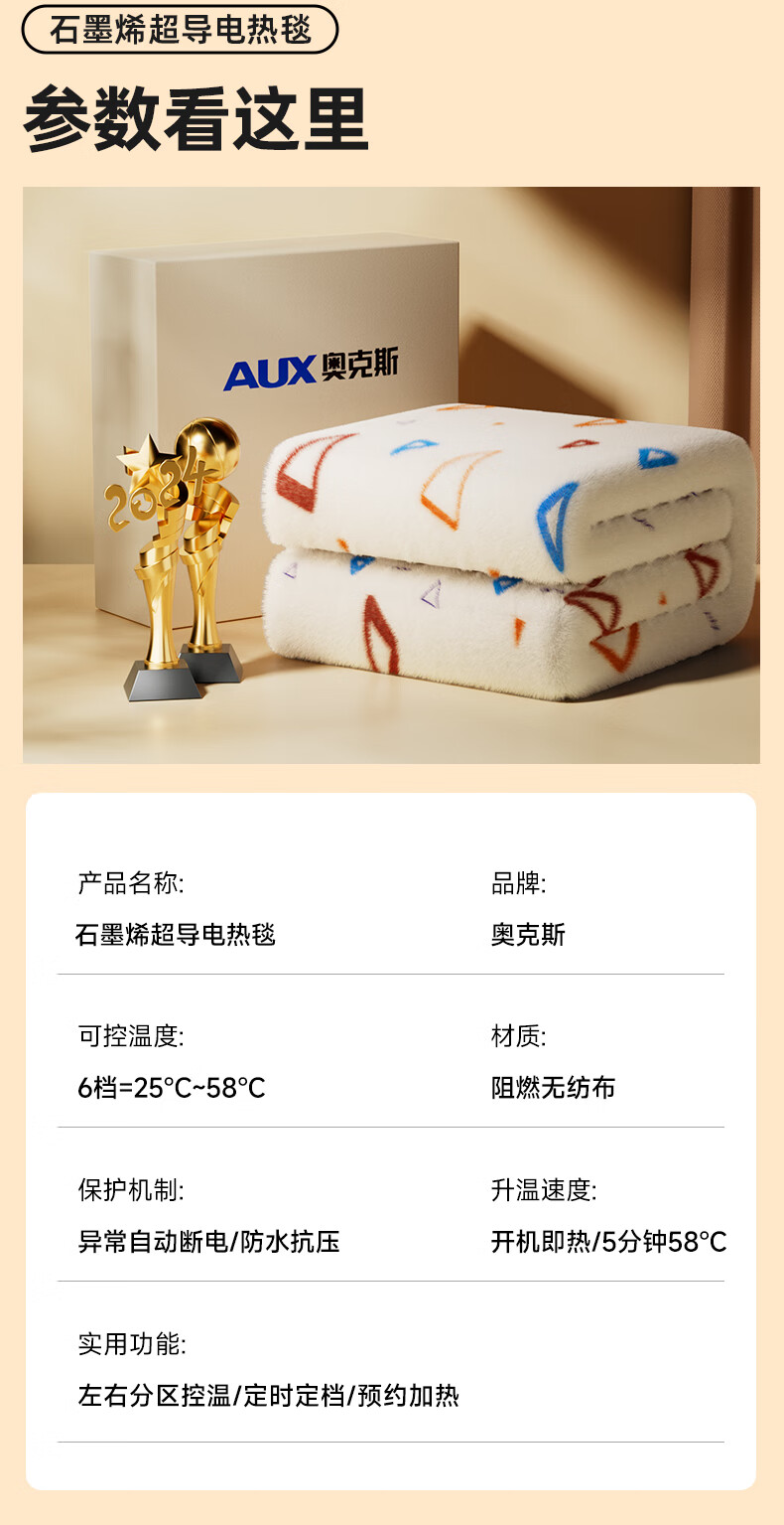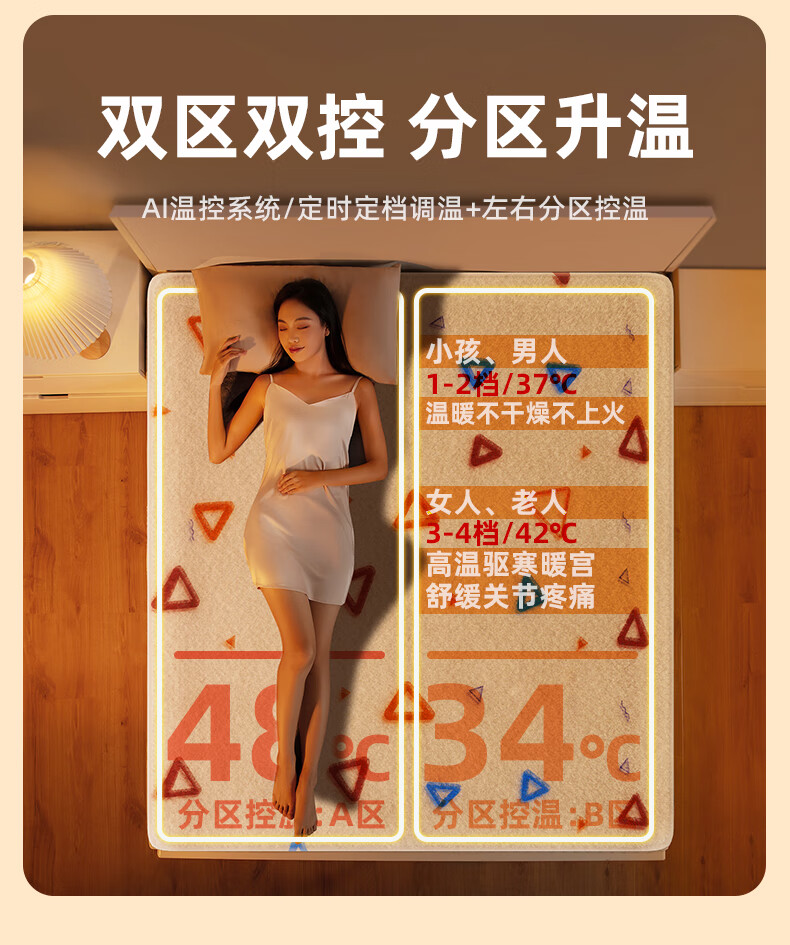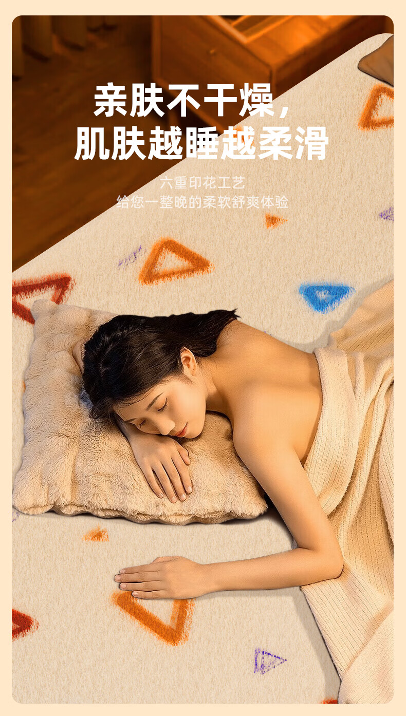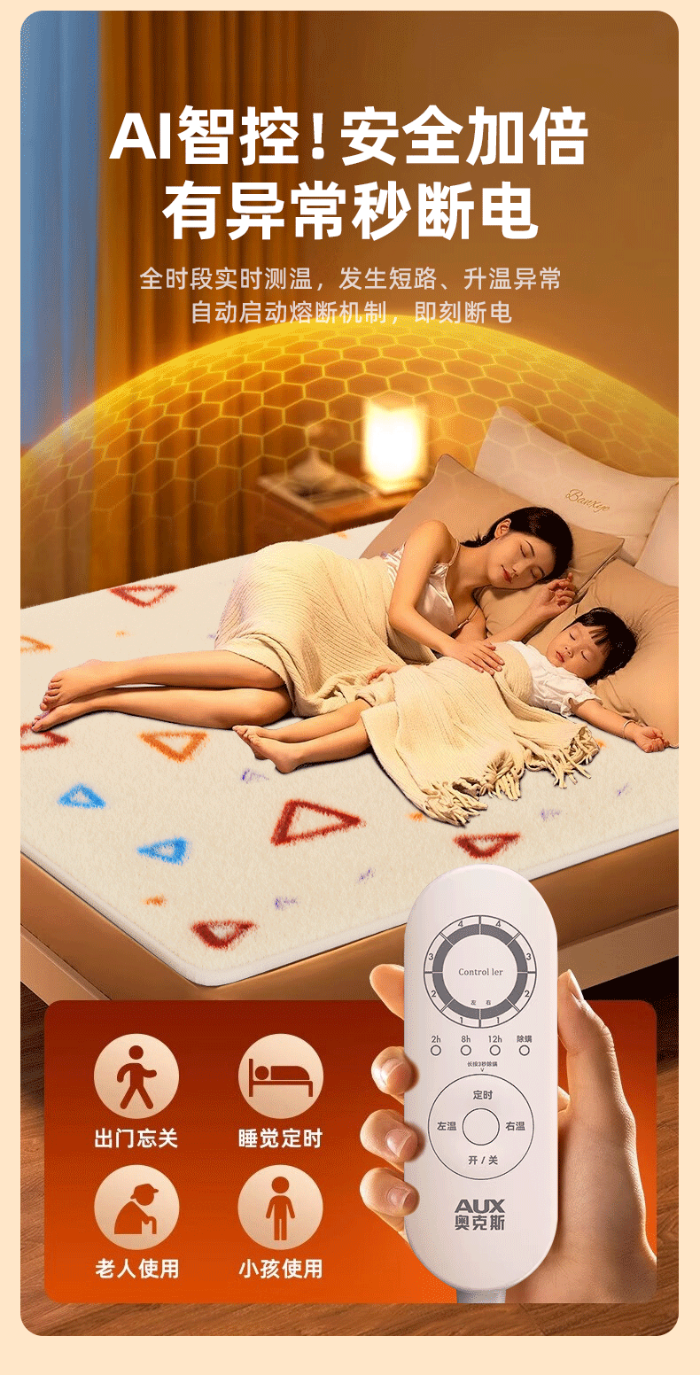 奥克斯【高温断电】电热毯单双人电褥子1.5x1.8x2米双温双控自动断电 加厚暖绒三角款【2.0*1.8m】双人双控恒温定时除螨 恒温整晚丨暖透全身丨除螨抑菌