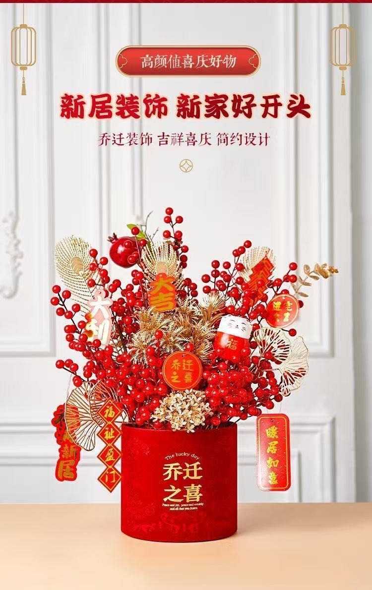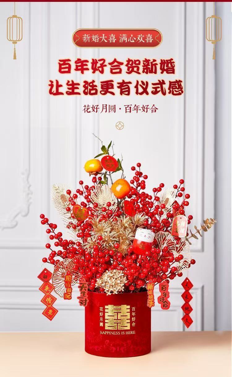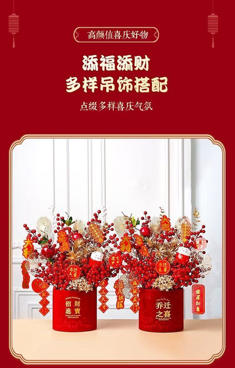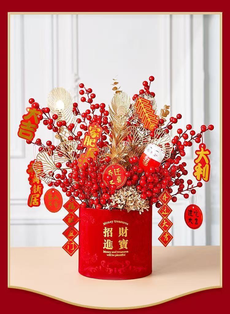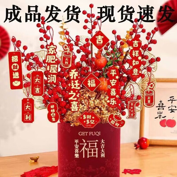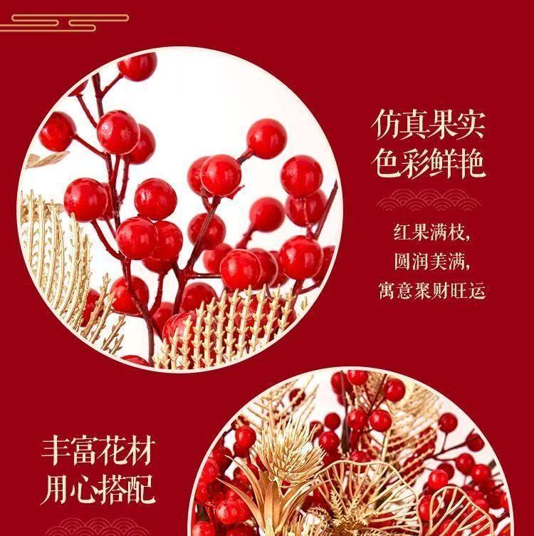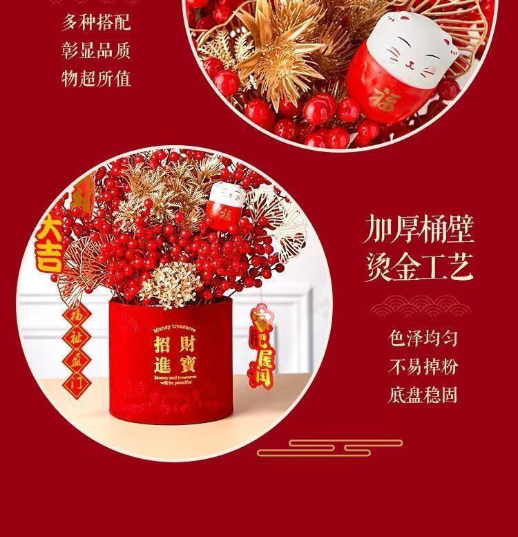 OYKTN【极速发货】春节年宵花发财果摆件福桶客厅摆件结婚乔迁装饰花艺 成品发货(新年快乐绒桶)总高56cm+挂牌