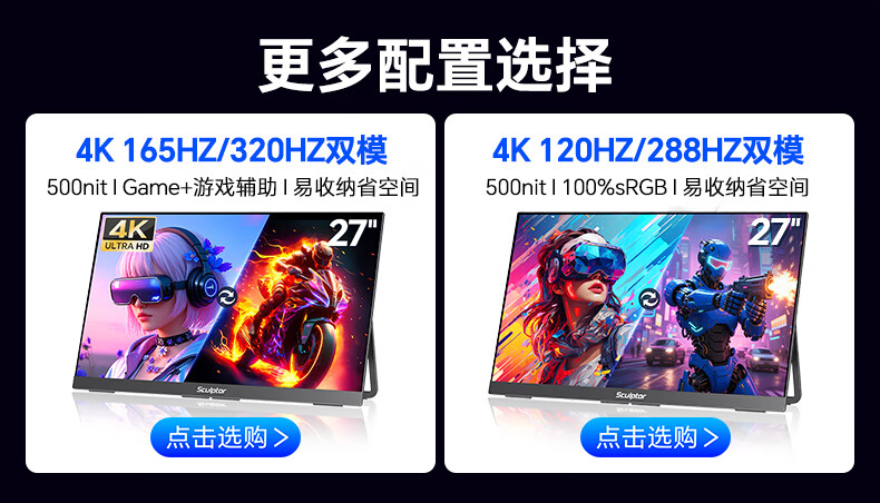 雕塑家27英寸4K 120Hz双模288Hz 100%sRGB 500nit高亮IPS屏DC调光笔记本电脑电竞显示器Type-c接口MU27LA