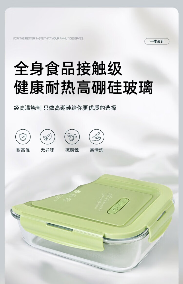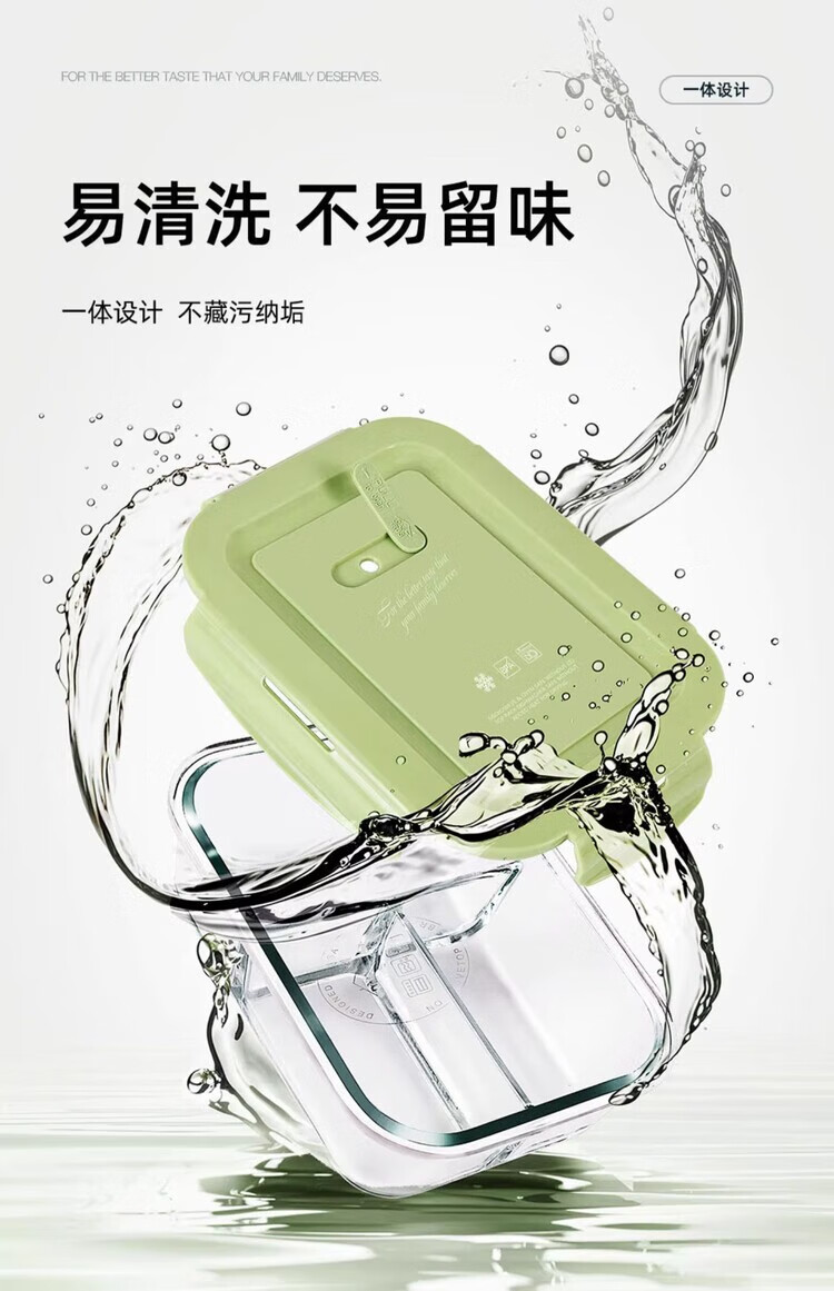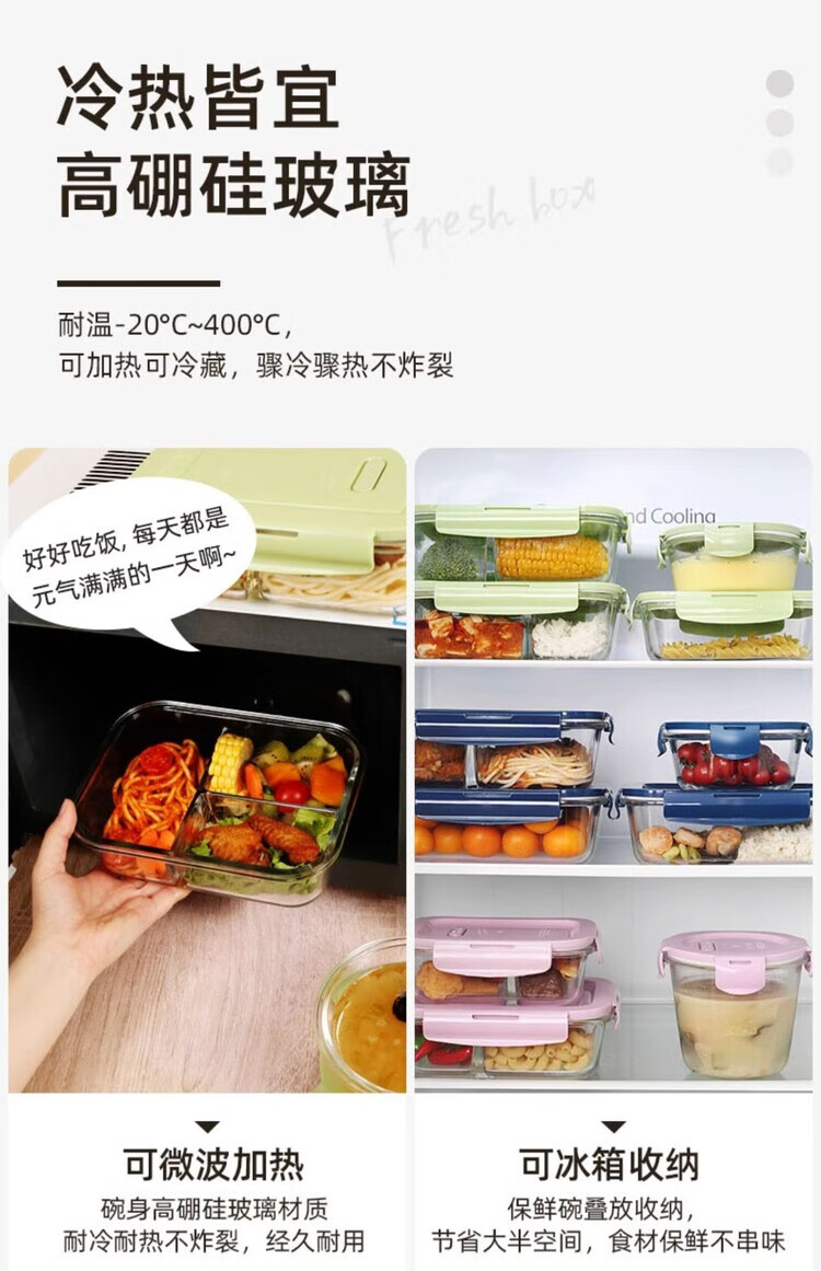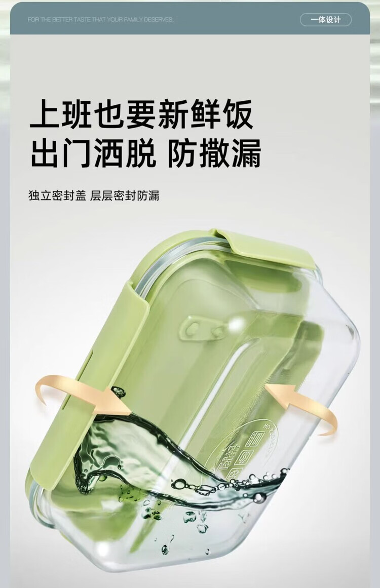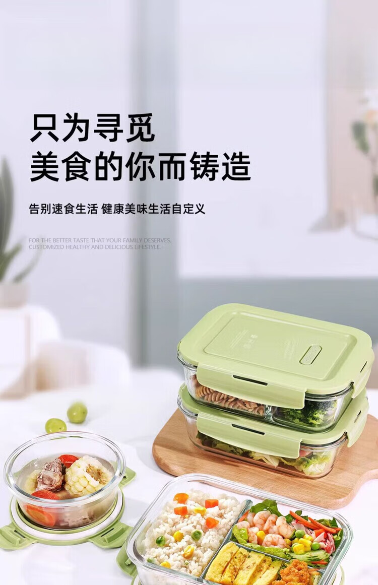 AILUKI日本玻璃饭盒可微波炉加热专用带饭装汤餐碗保鲜分隔型便当带盖 北欧绿-大长三隔1050ml+圆汤碗480ml+包+餐具