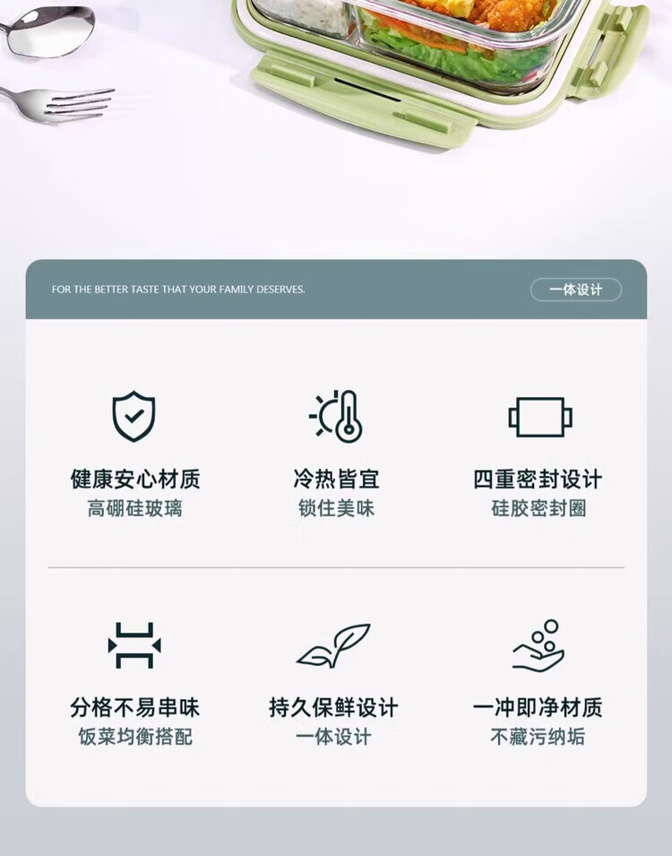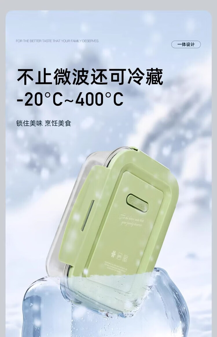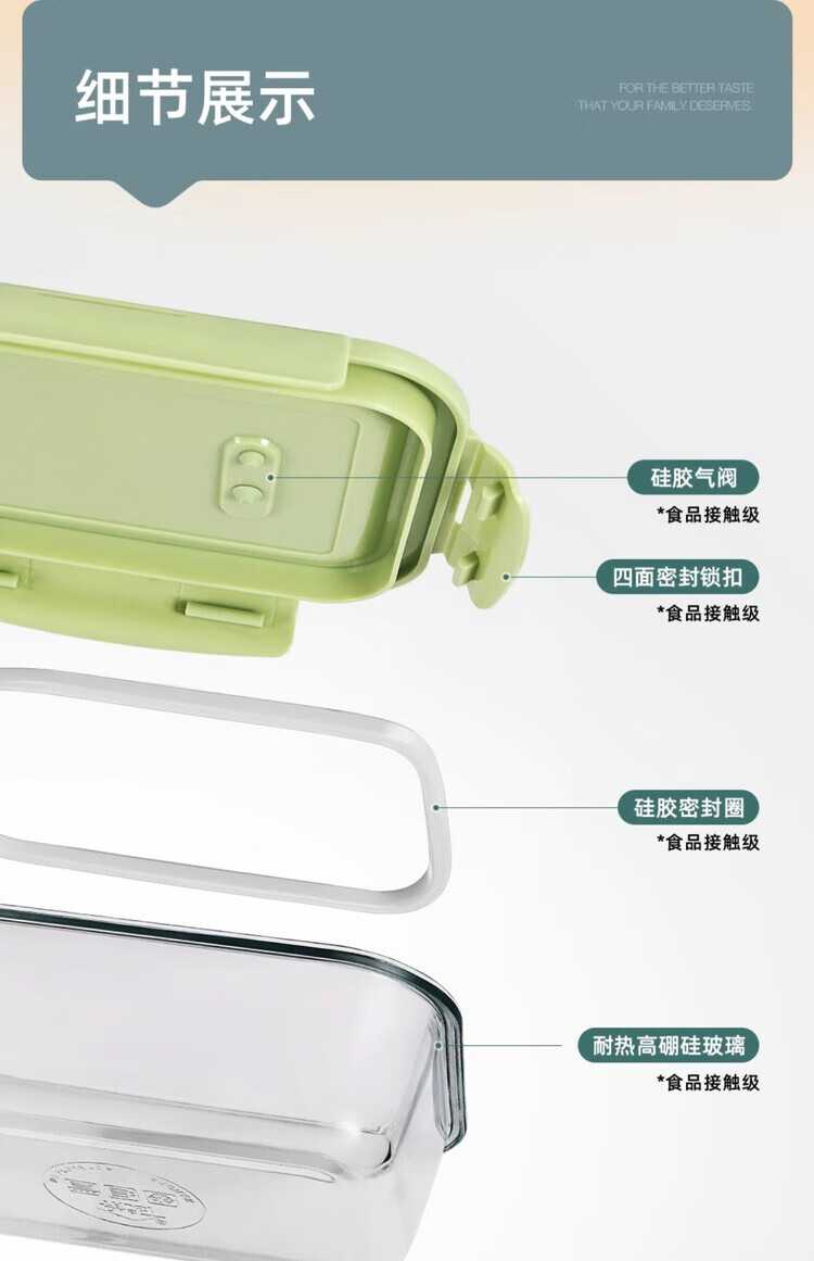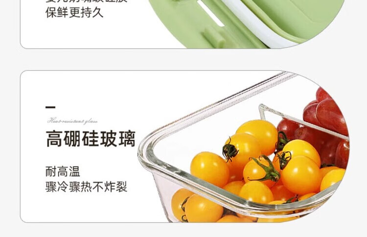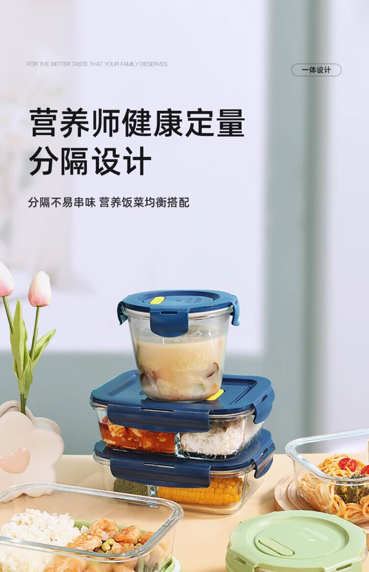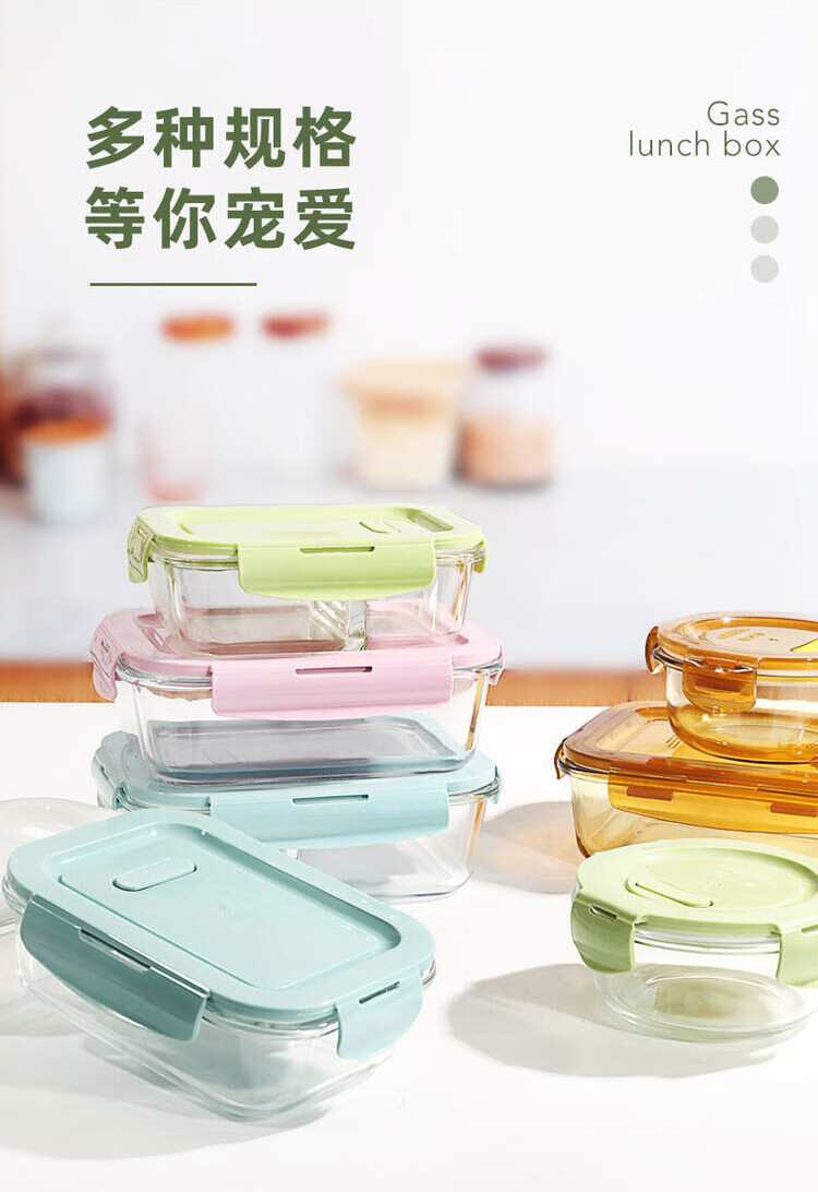 AILUKI日本玻璃饭盒可微波炉加热专用带饭装汤餐碗保鲜分隔型便当带盖 北欧绿-大长三隔1050ml+圆汤碗480ml+包+餐具