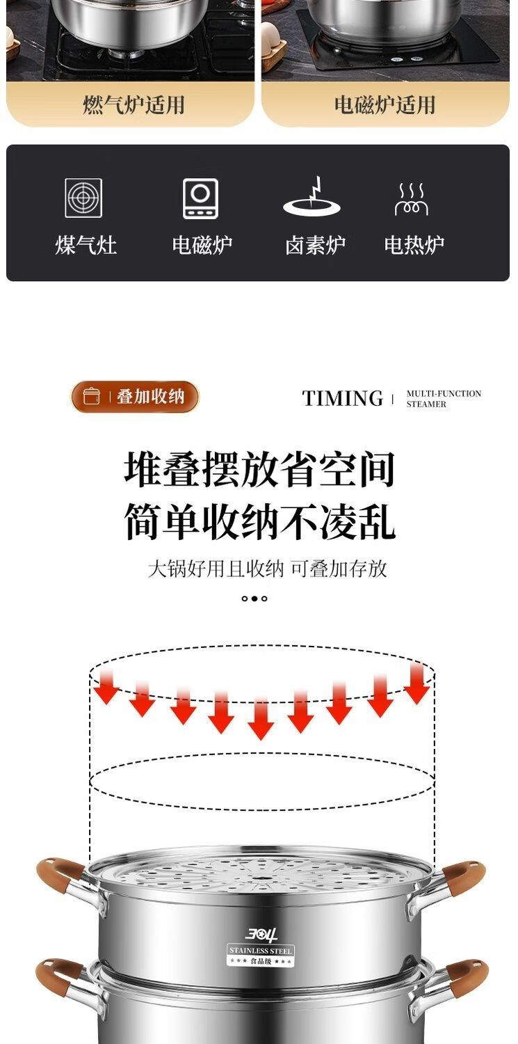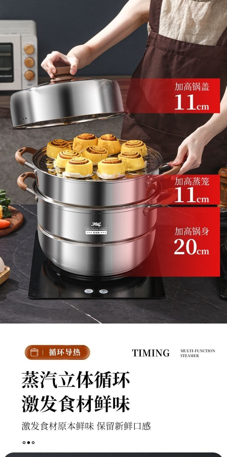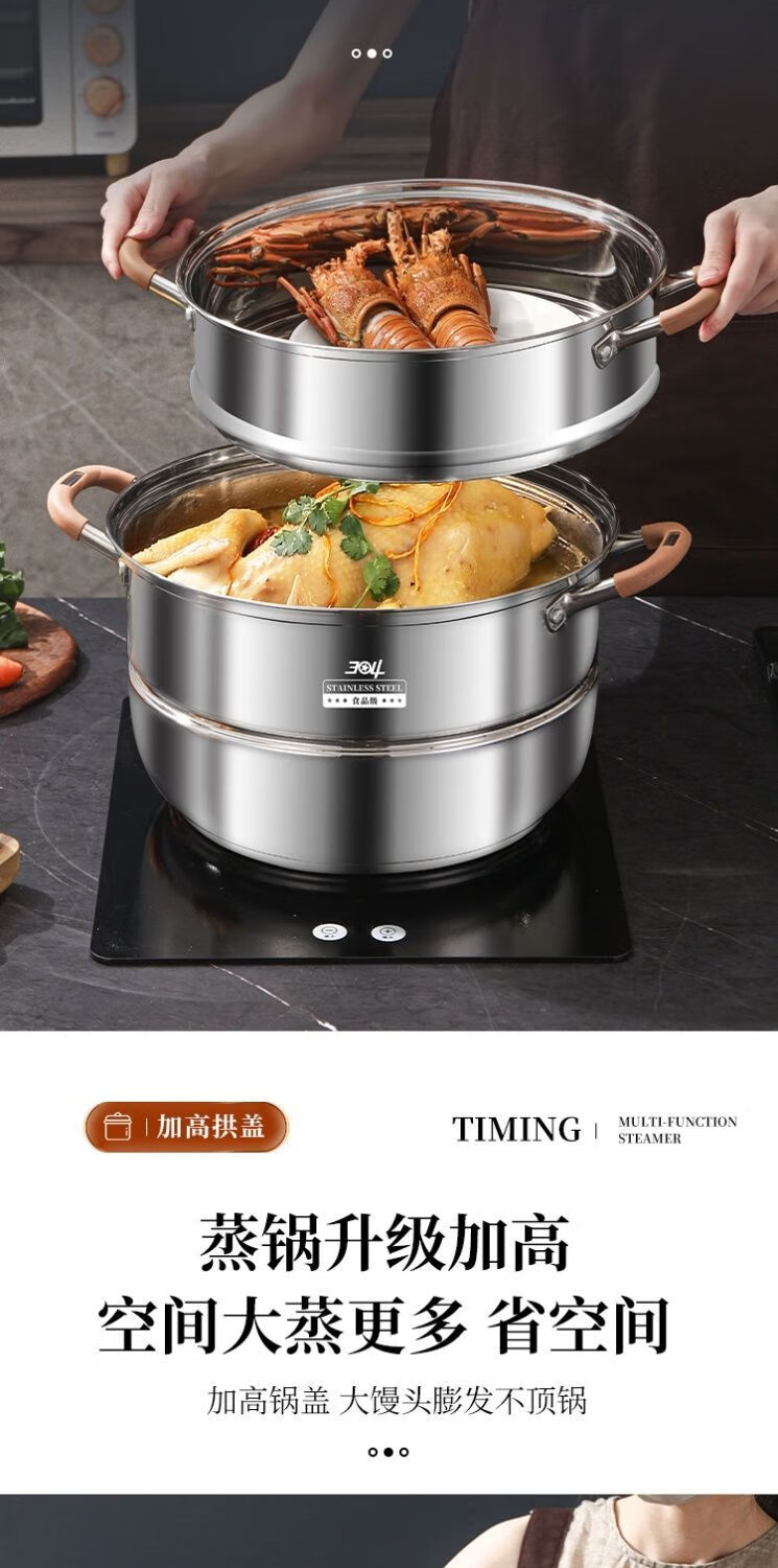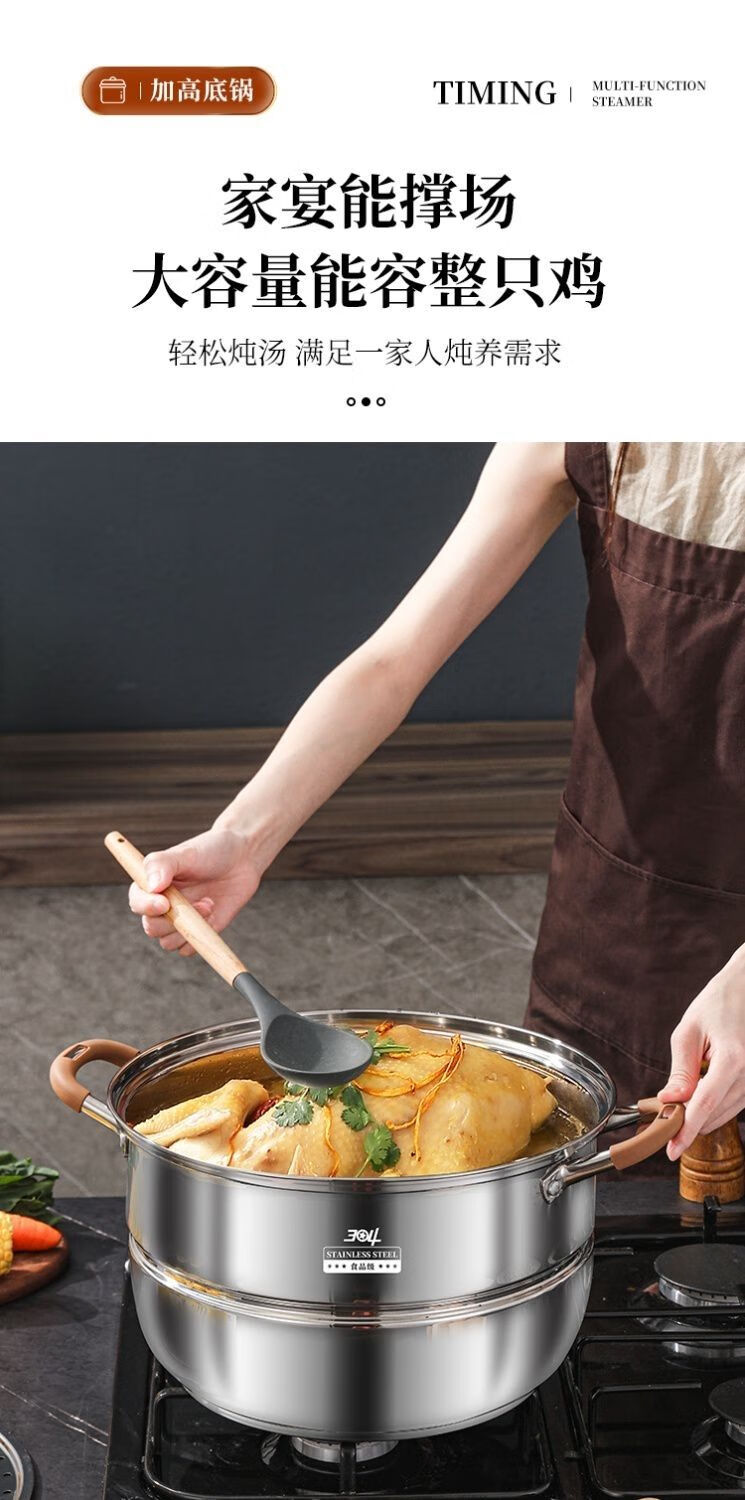 简漾德国304蒸锅特厚家用定时多层蒸笼蒸馍锅蒸鱼大容量电磁炉燃气灶 双层【1锅+1盖+2蒸片】 1cm 28CM