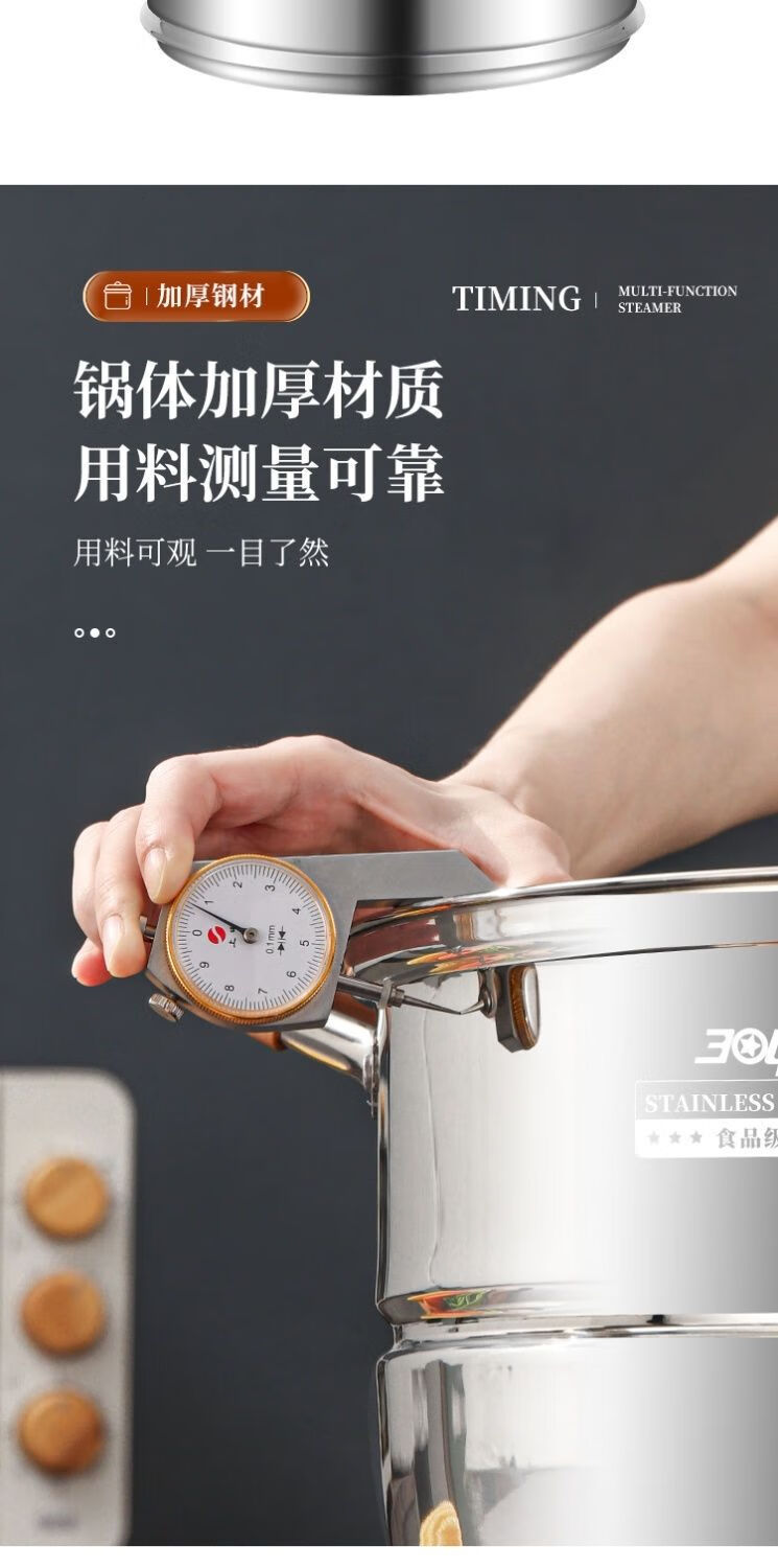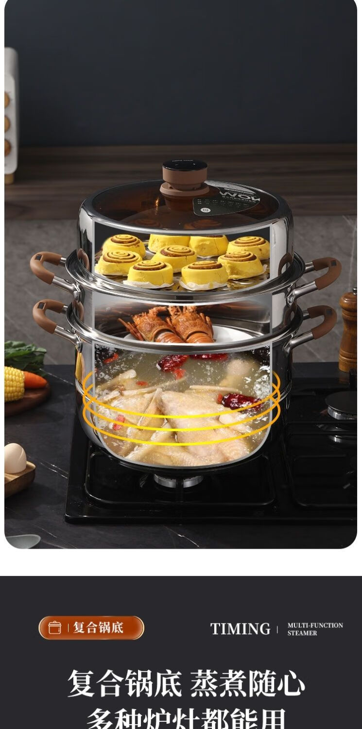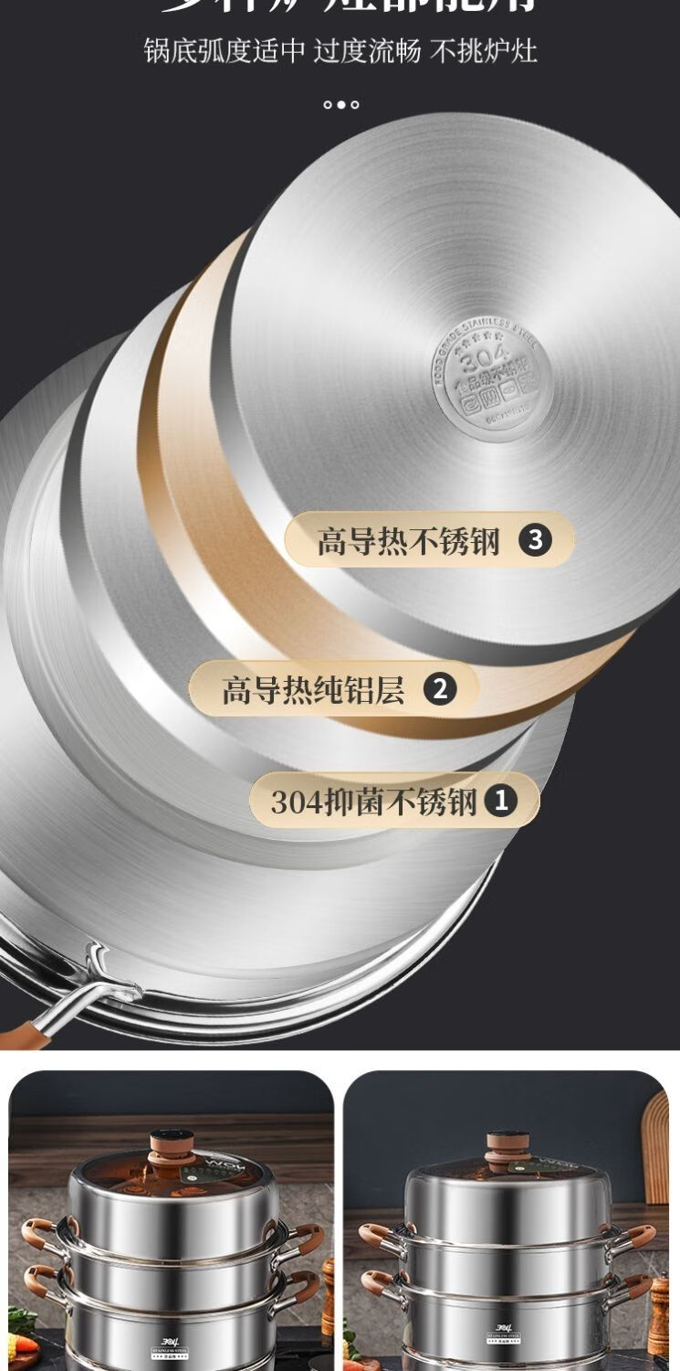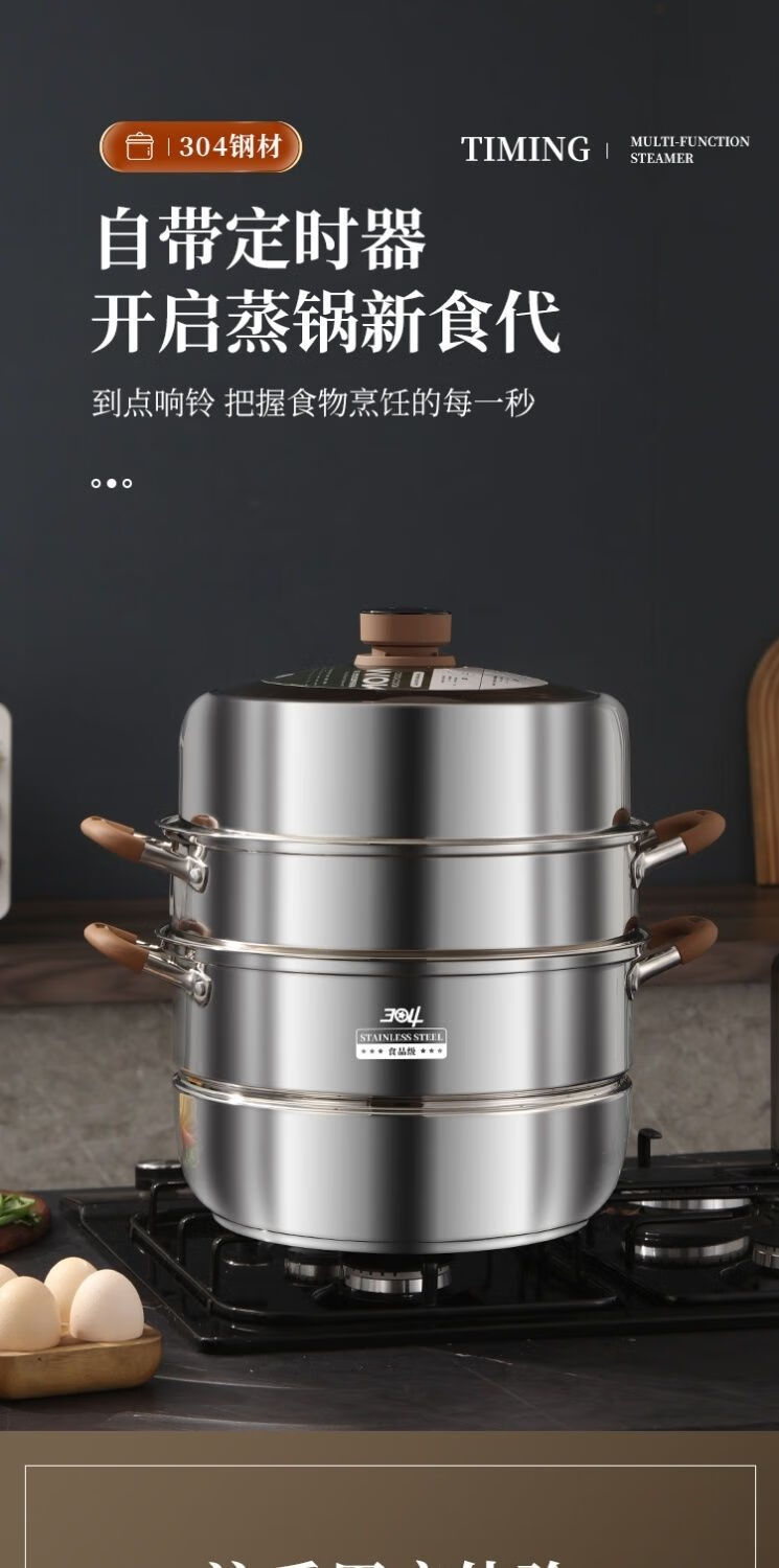 简漾德国304蒸锅特厚家用定时多层蒸笼蒸馍锅蒸鱼大容量电磁炉燃气灶 双层【1锅+1盖+2蒸片】 1cm 28CM