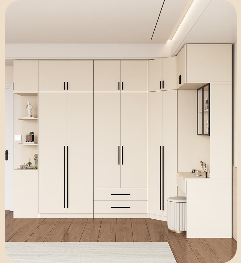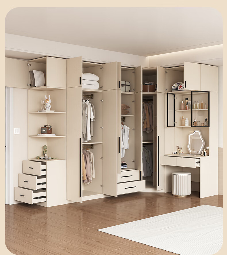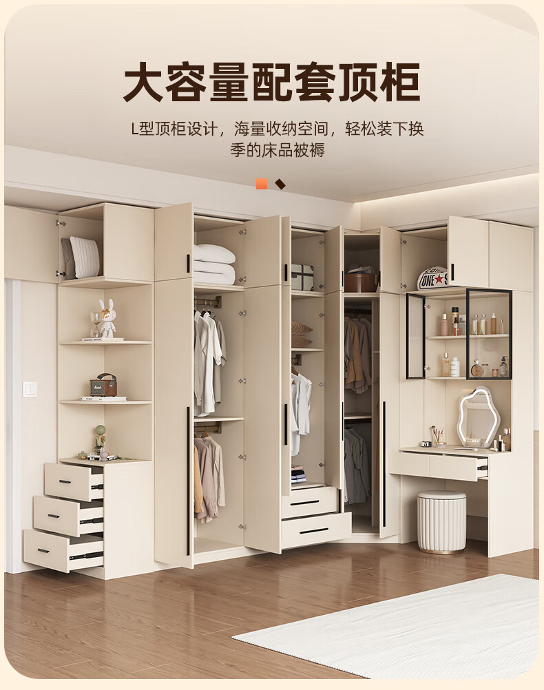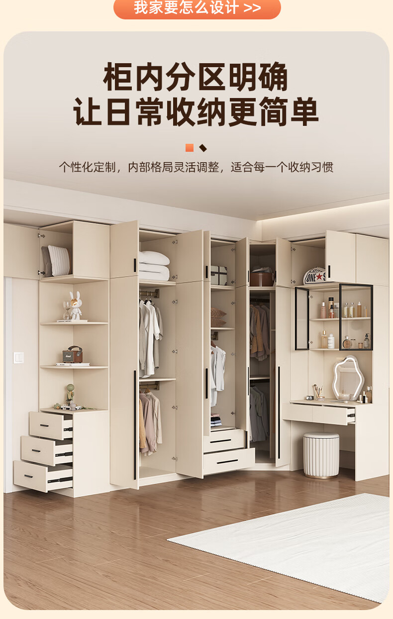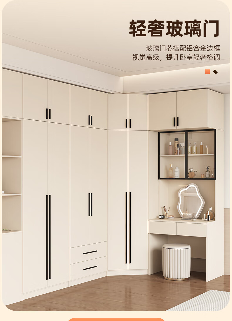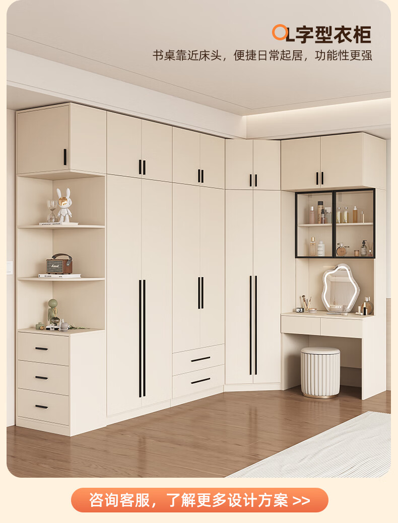 雨村实木衣柜现代简约奶油风家用卧室衣帽间梳妆台直角转角衣柜可定制 两门抽屉衣柜+边柜+书桌柜+顶柜