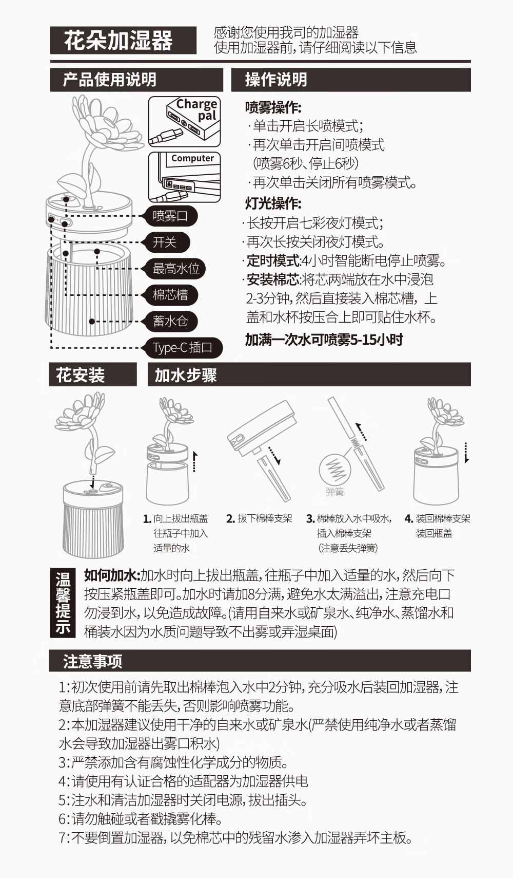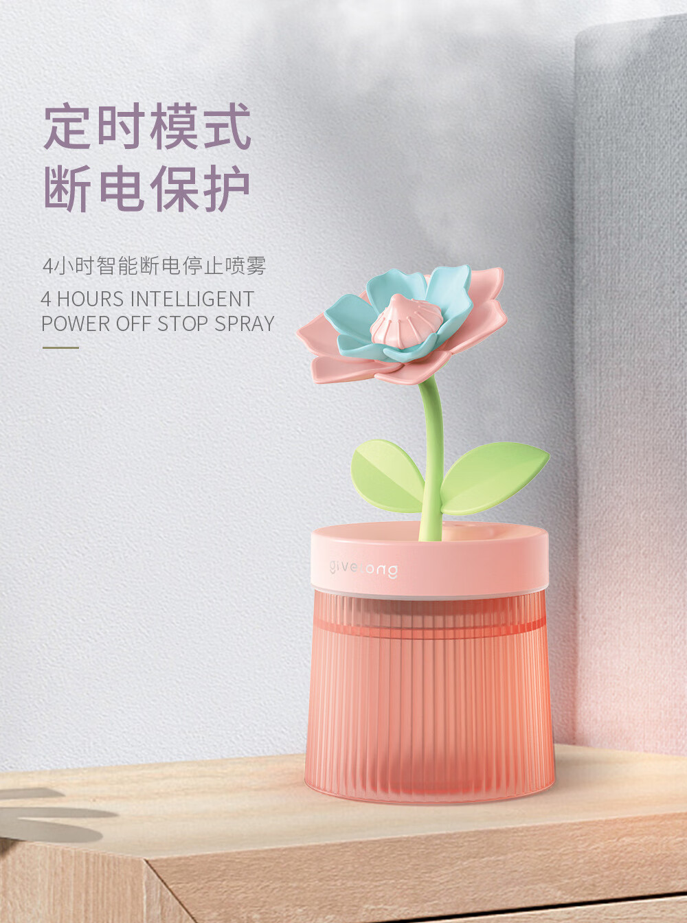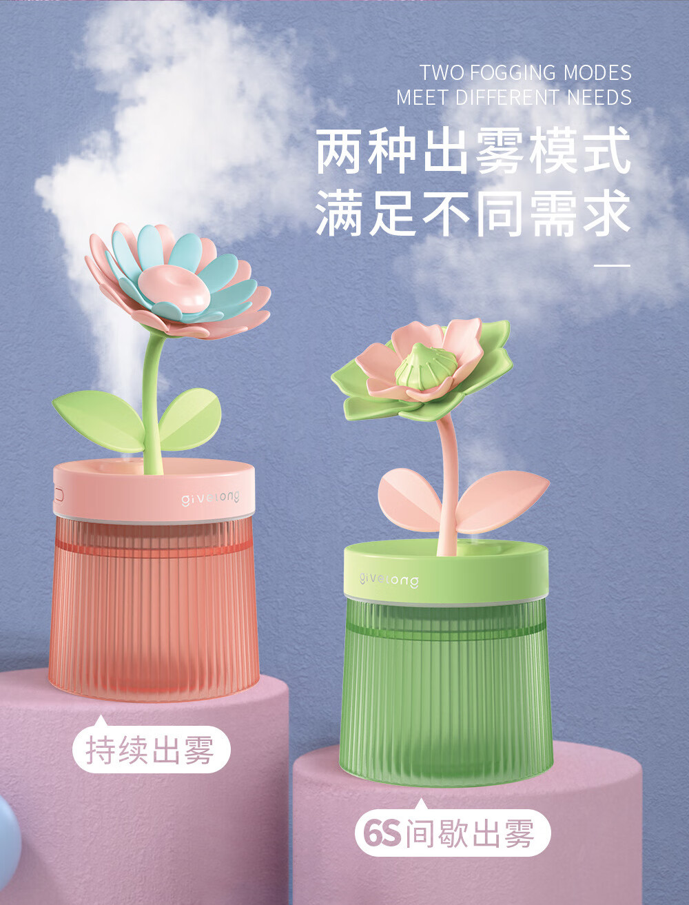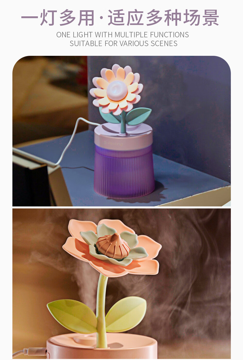 OUMIRO家用客厅小容量加湿器花朵空气加湿器桌面向日葵加湿器七彩氛围灯喷雾器车载USB香薰机2025 栀子花加湿器小夜灯紫色