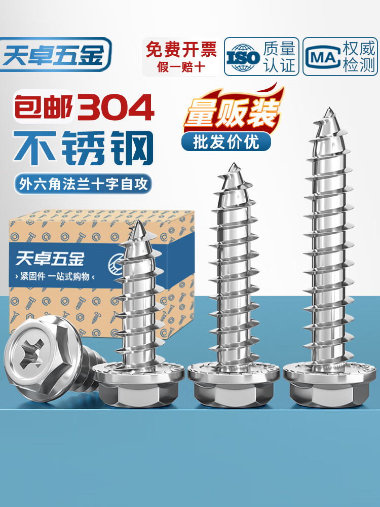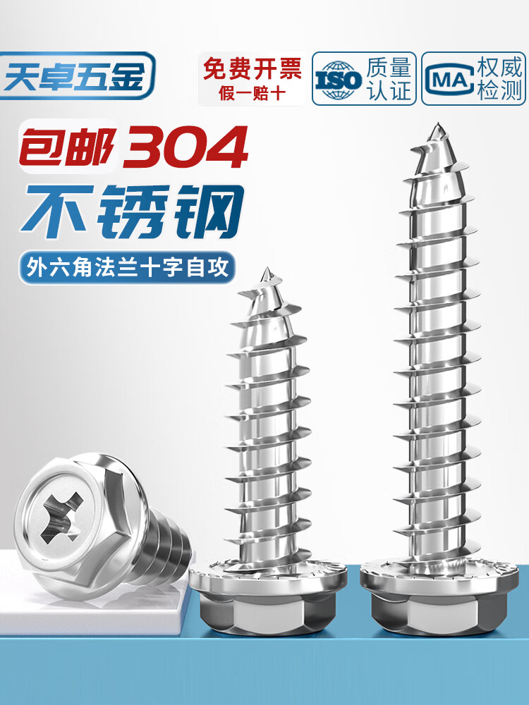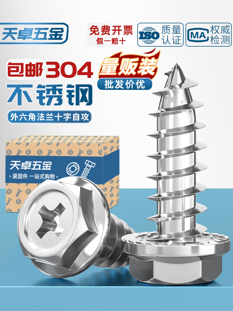 天卓五金304不锈钢十字凹穴外六角法兰自攻螺丝防滑齿带垫木螺钉MM3M4M5M6 ---以下为【304不锈钢 带齿】---