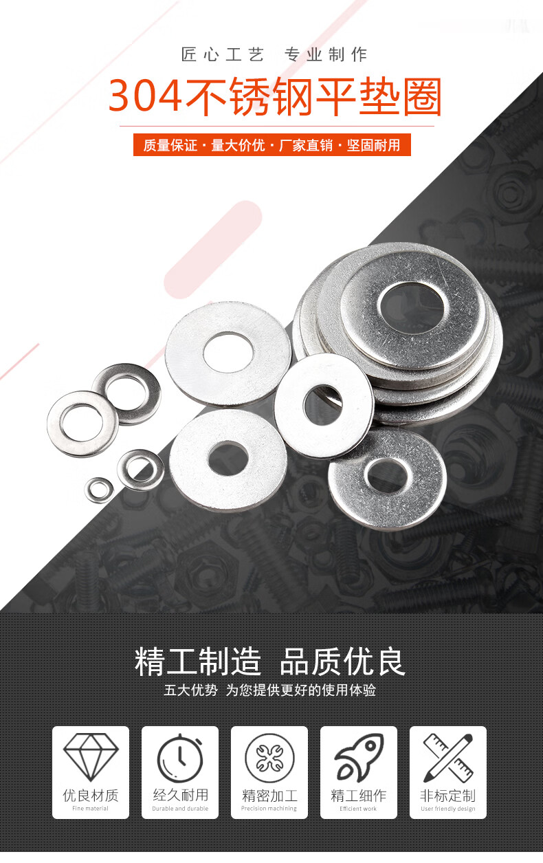 宝德丰304不锈钢加大加厚平垫片圆形平垫圈金属小垫片螺丝垫圈大全国标 M2x4.5x0.5(500只)
