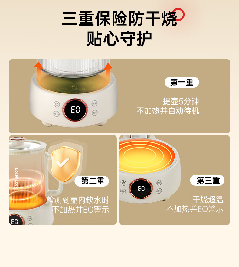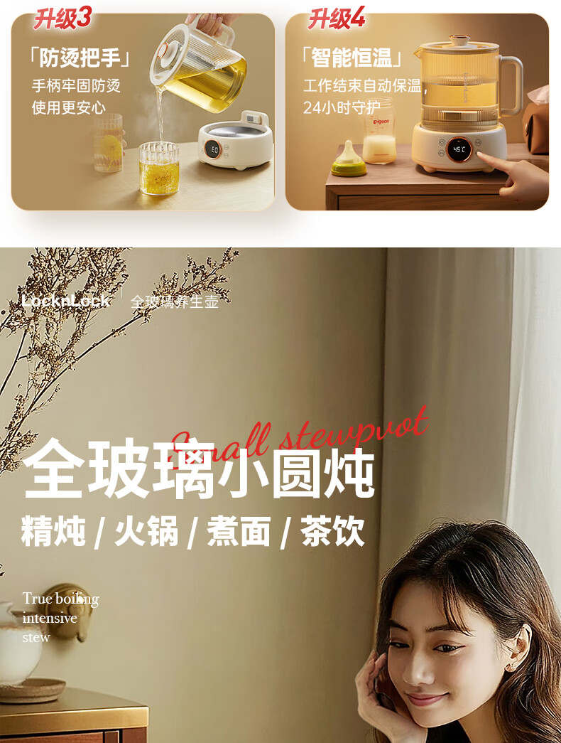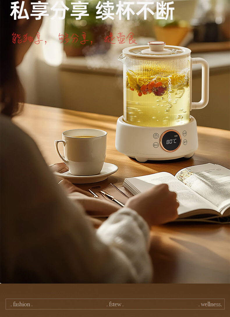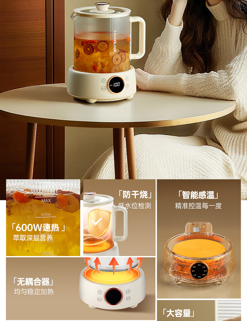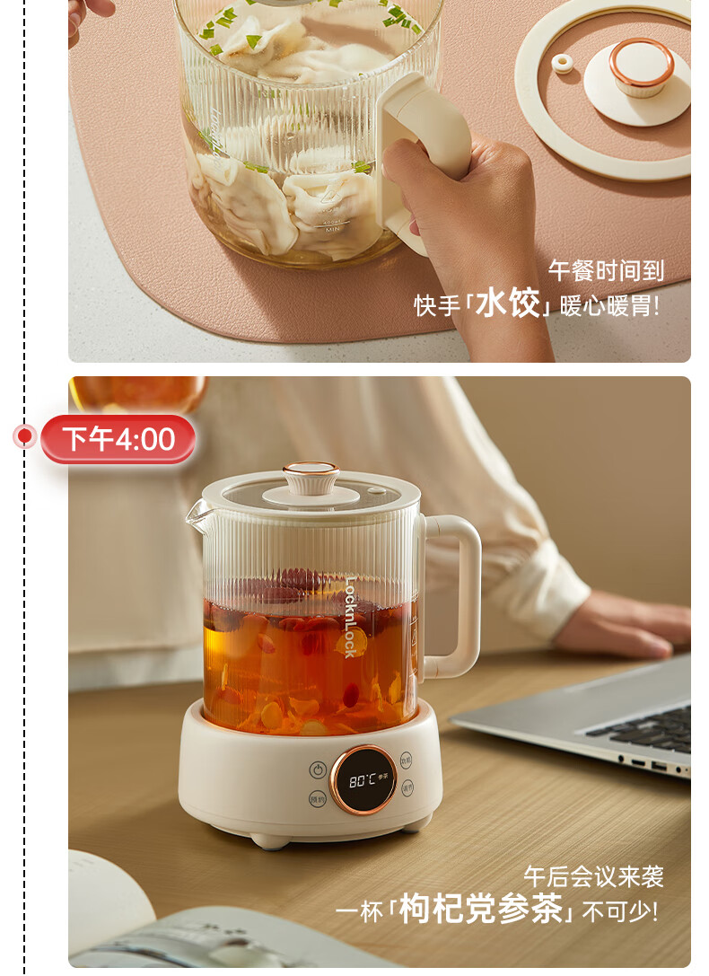 乐扣乐扣全玻璃养生壶电热水壶分体式烧水煮茶壶小花茶壶恒温加热保温迷你泡茶壶1L 炖煮款-无茶漏 1L