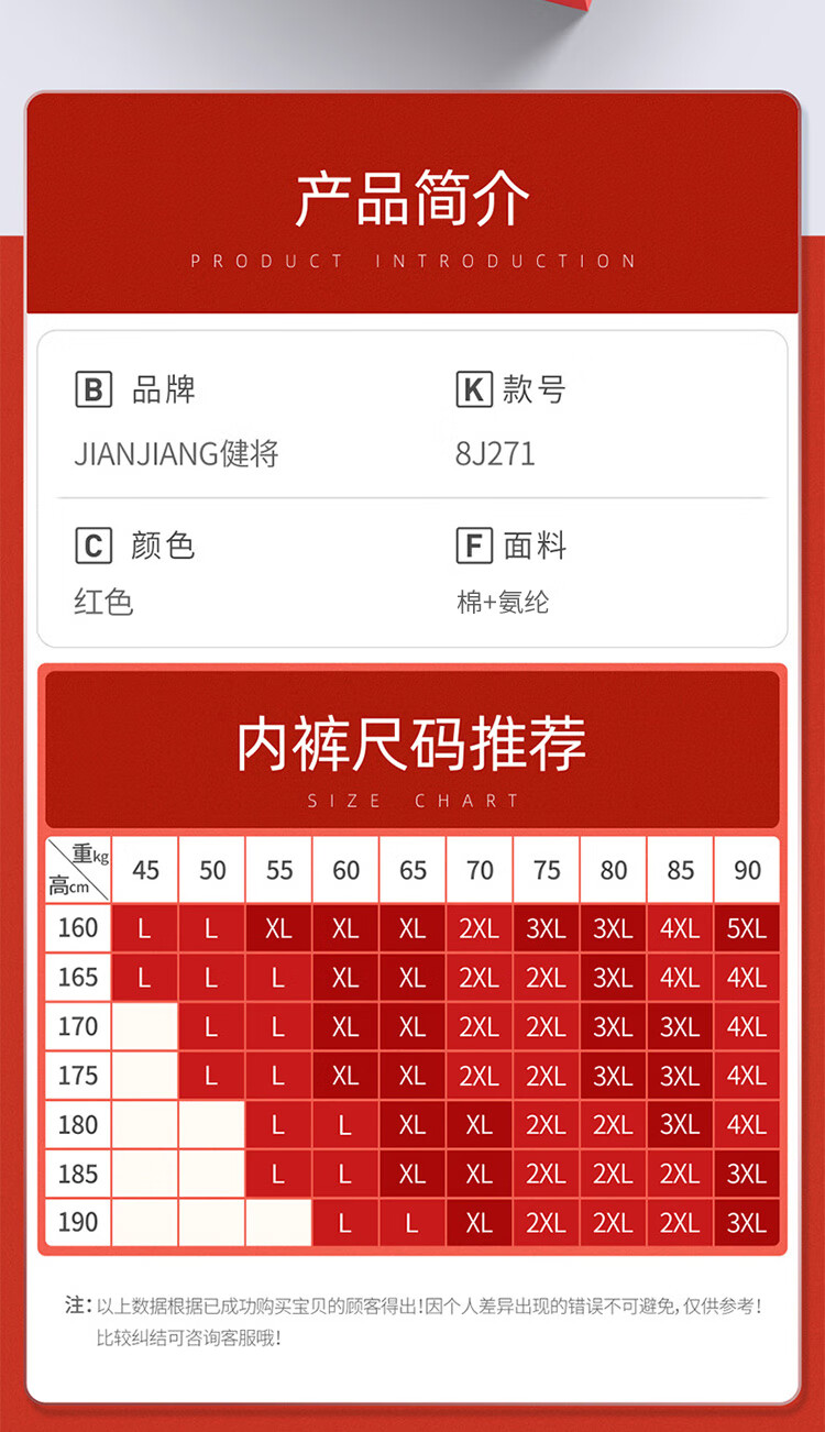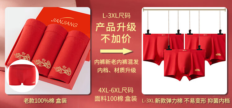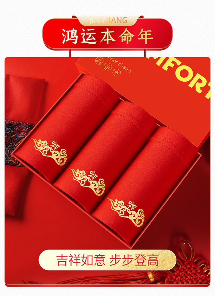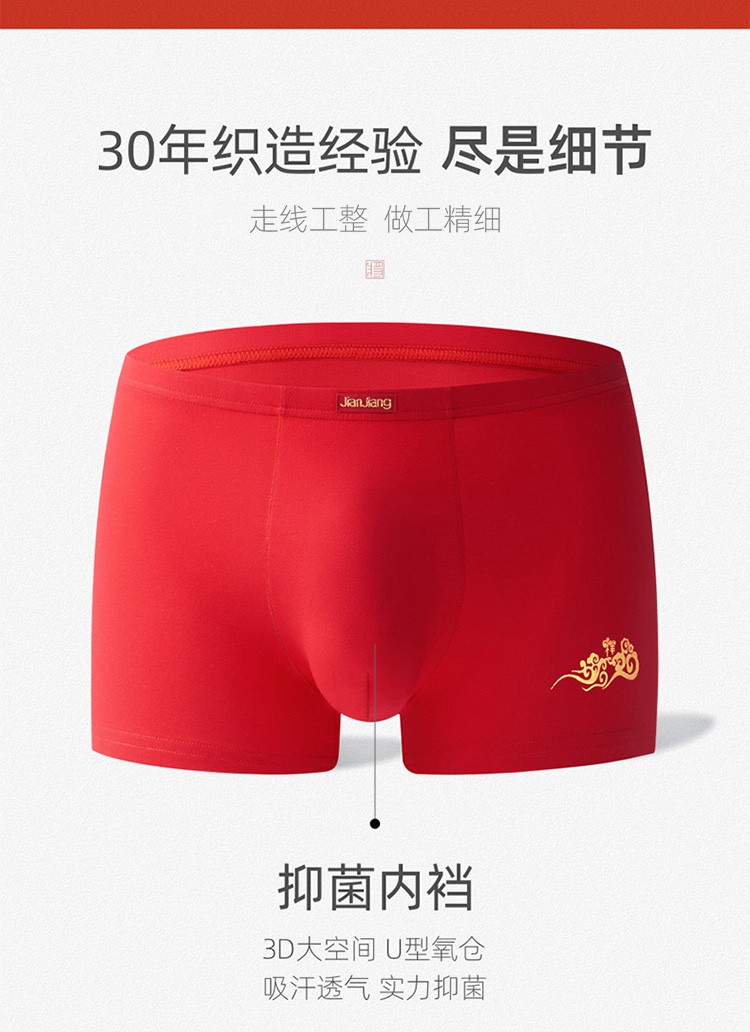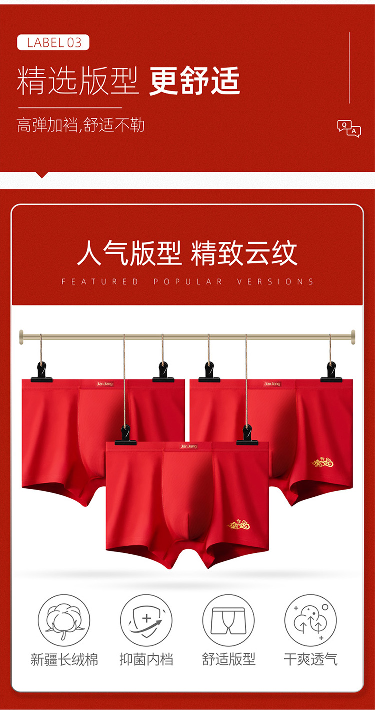 健将男士红内裤男马年本命年纯棉抑菌平角裤大码肥佬透气男式四角裤头 中国红装内裤 3条 5XL (腰3.2-3.4尺 重190-210斤)
