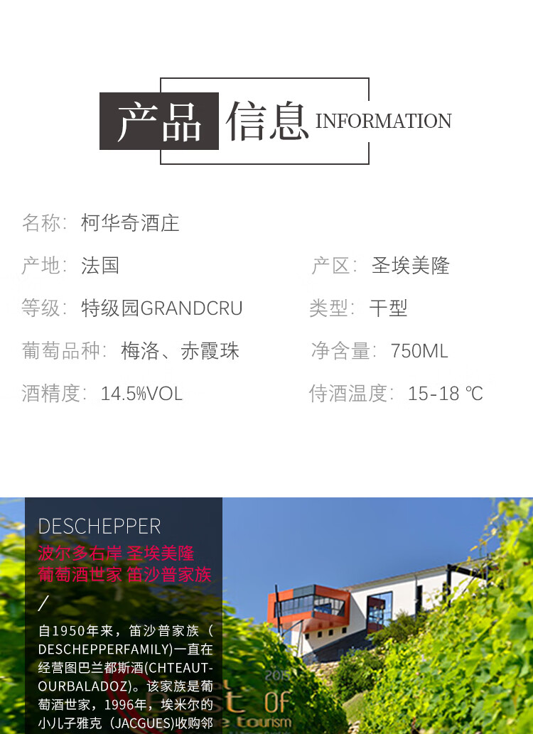 柯华奇法国进口 圣埃美隆特级园 柯华奇酒庄红葡萄酒干红葡萄酒 750ml