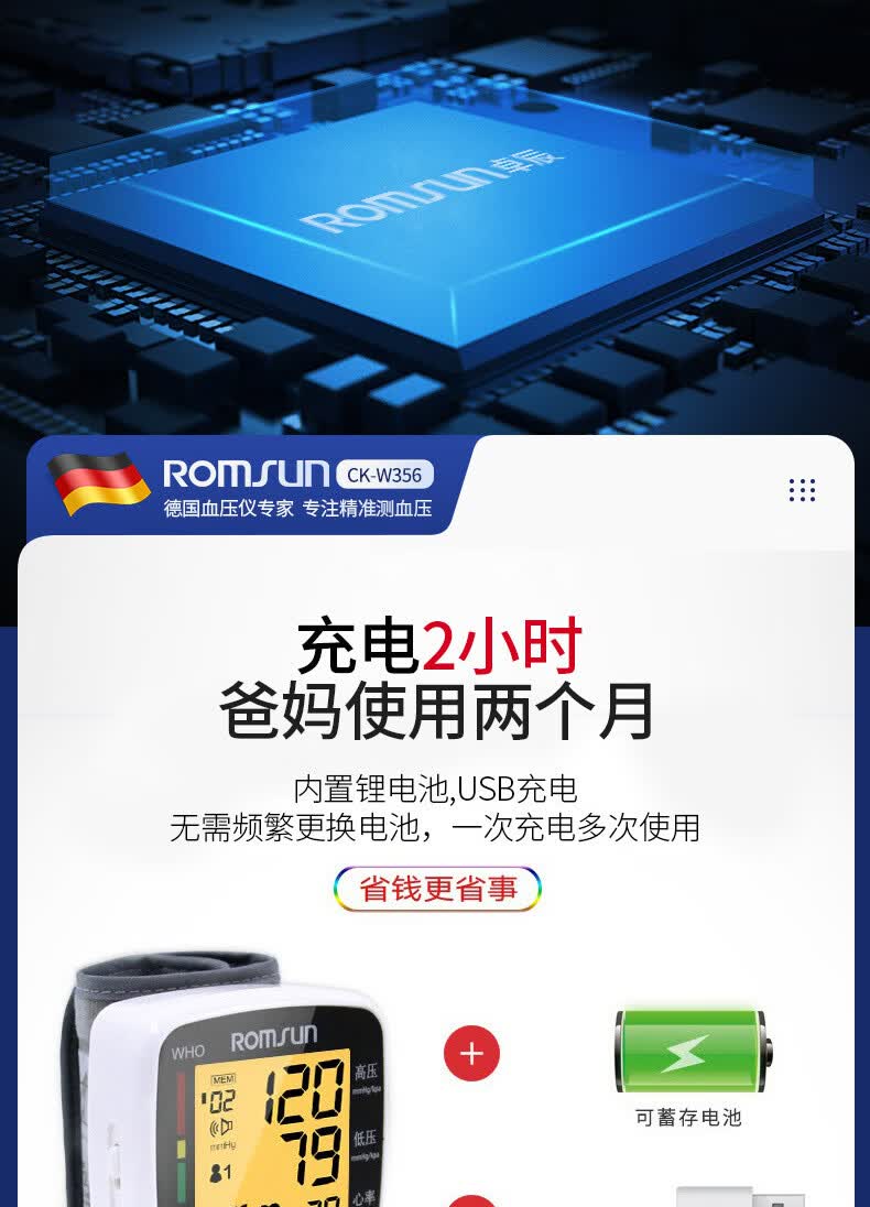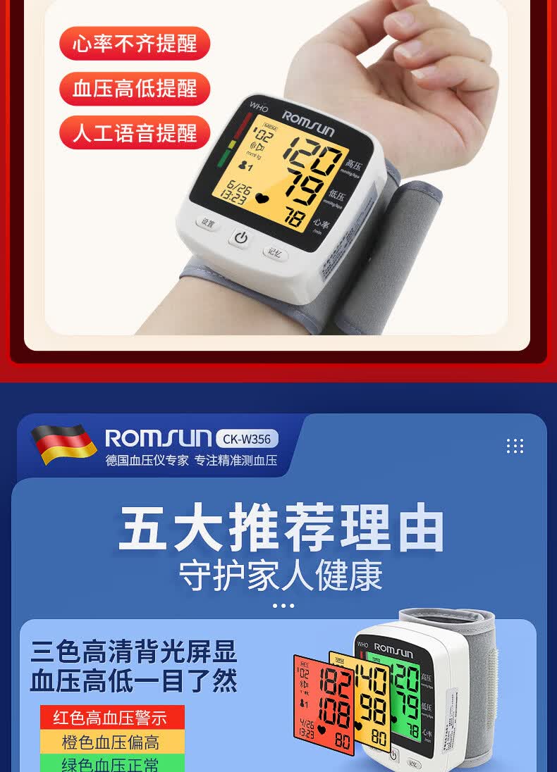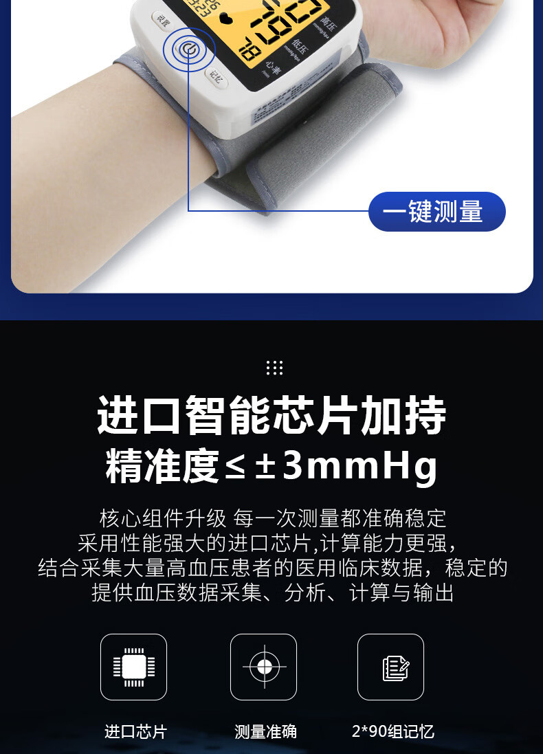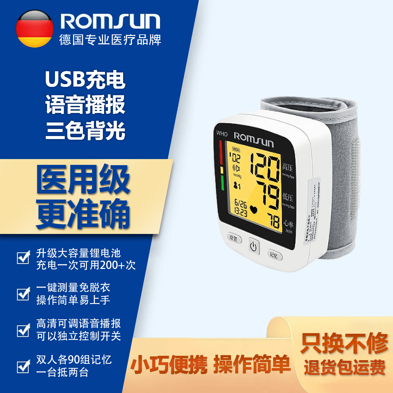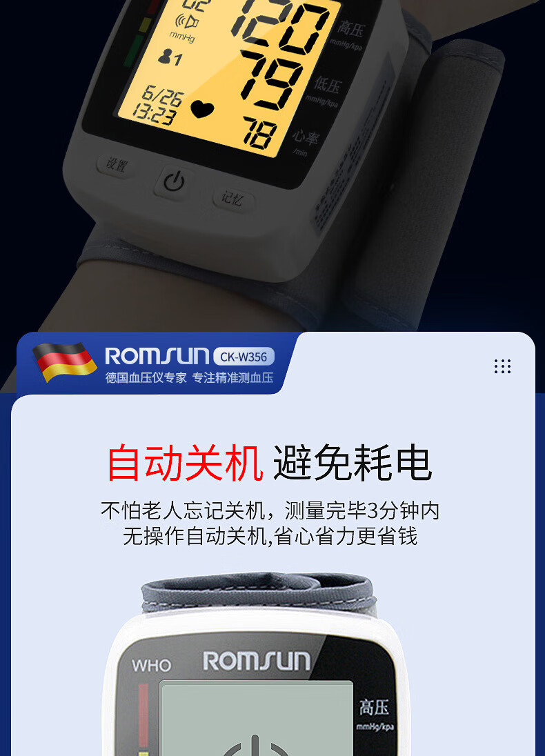卓辰德国品牌血压仪血压测量仪医用高精准血压计家用血压仪腕式血压计 W356三色背光充电款(好评晒图返现5元) 台