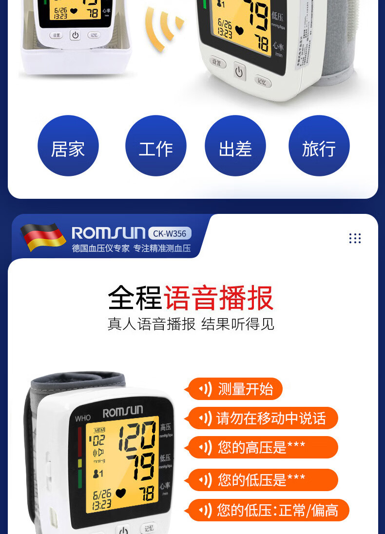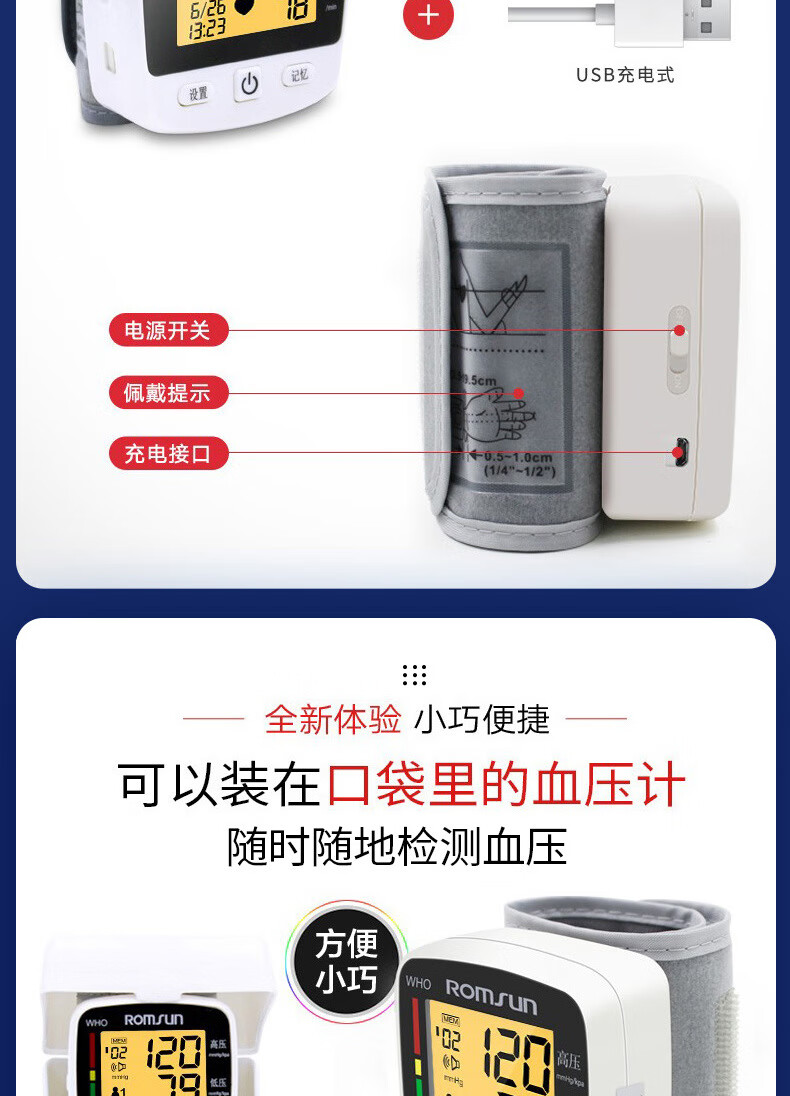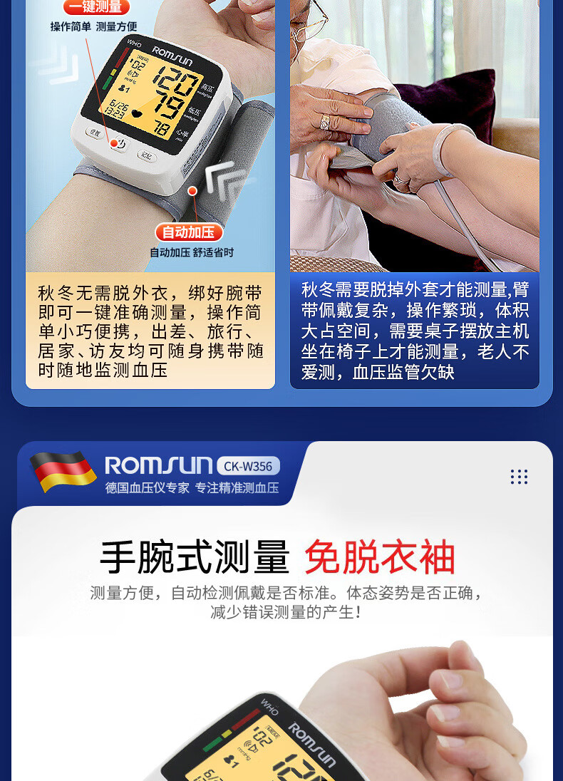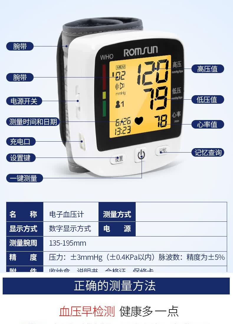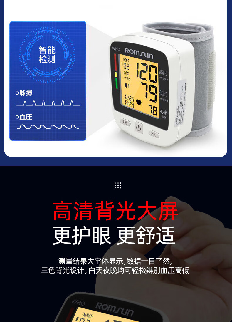 卓辰德国品牌血压仪血压测量仪医用高精准血压计家用血压仪腕式血压计 W356三色背光充电款(好评晒图返现5元) 台