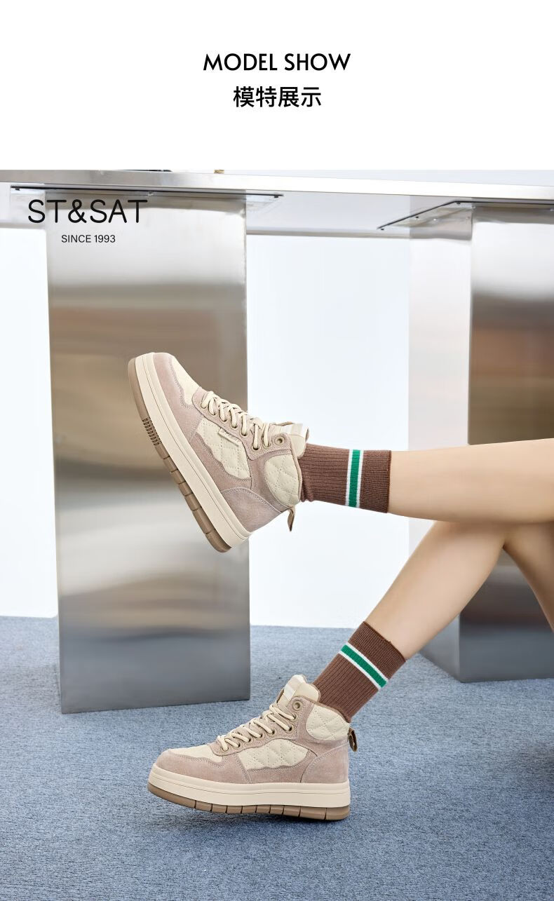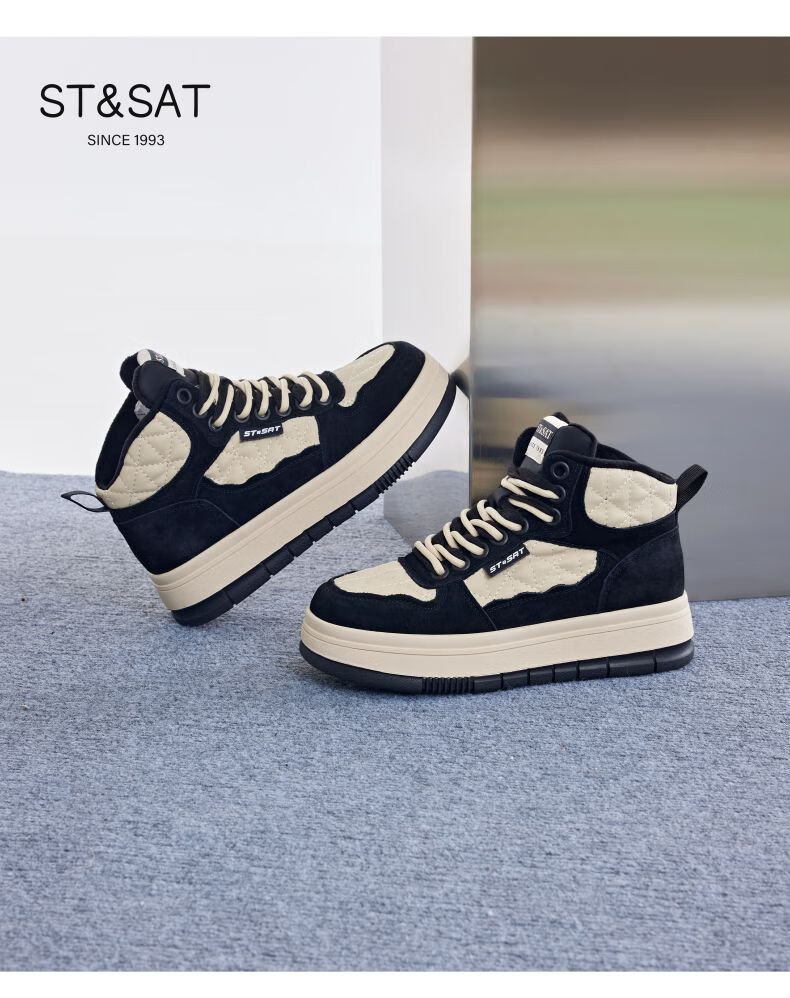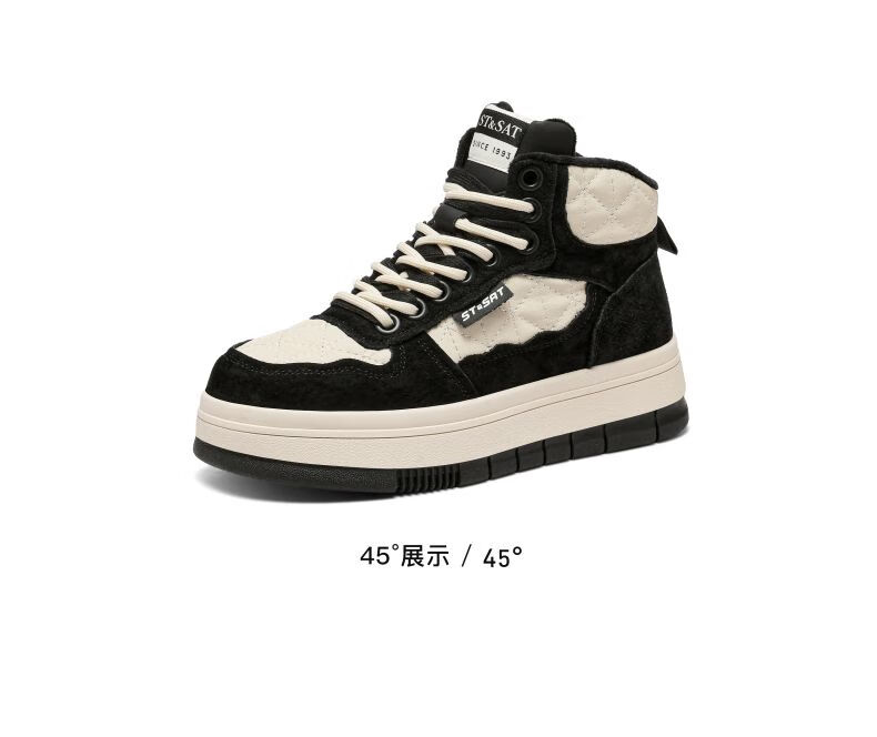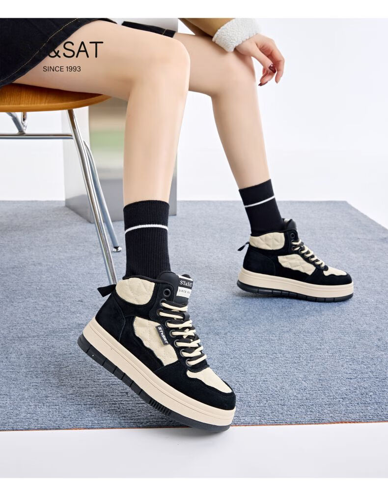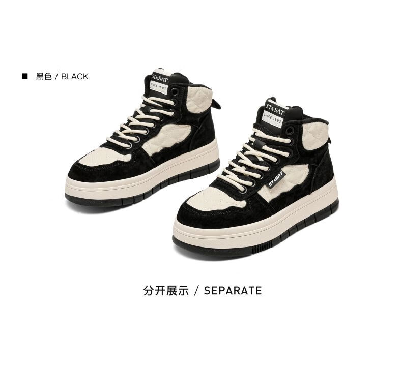 星期六(St&Sat)百搭拼色系带休闲鞋2025新款加绒爆款板鞋女高帮鞋 黑色 35