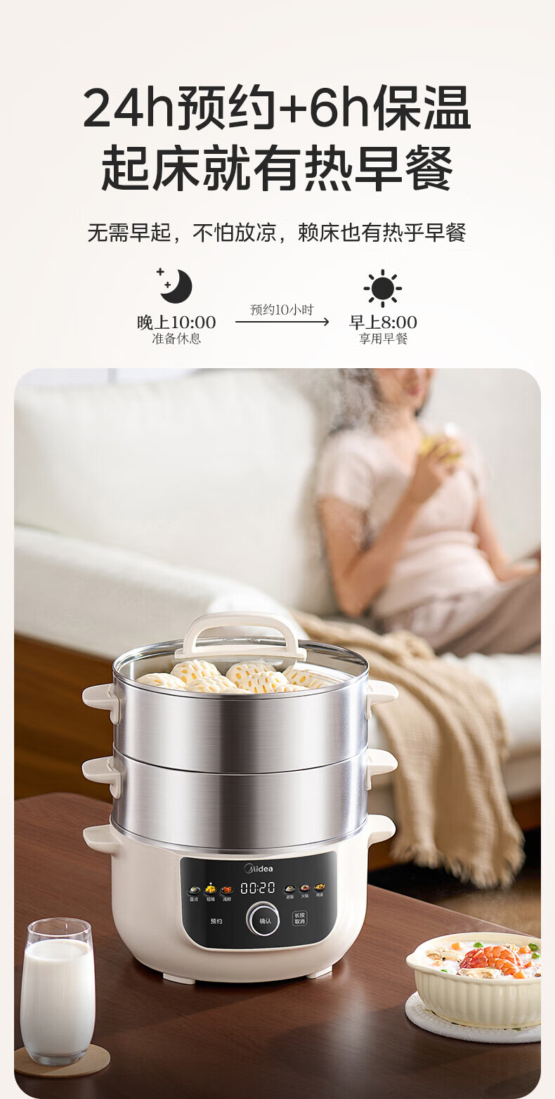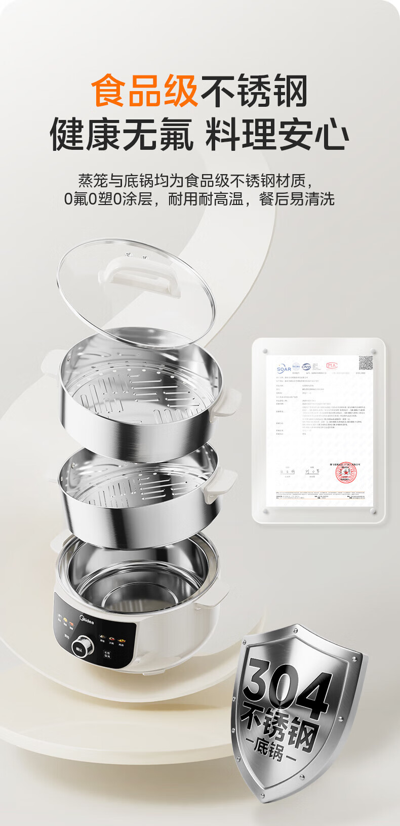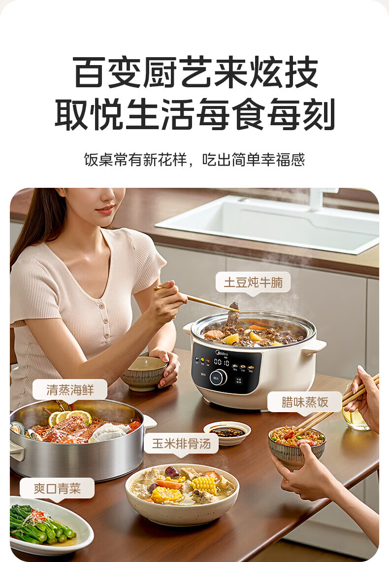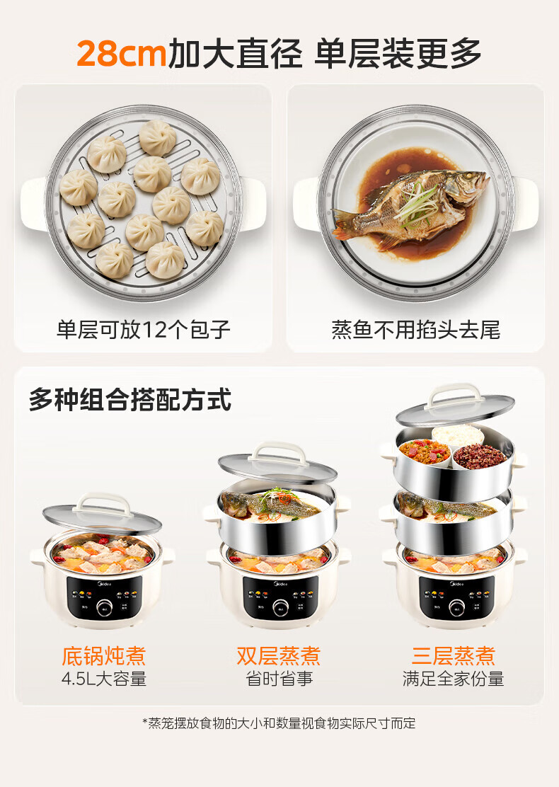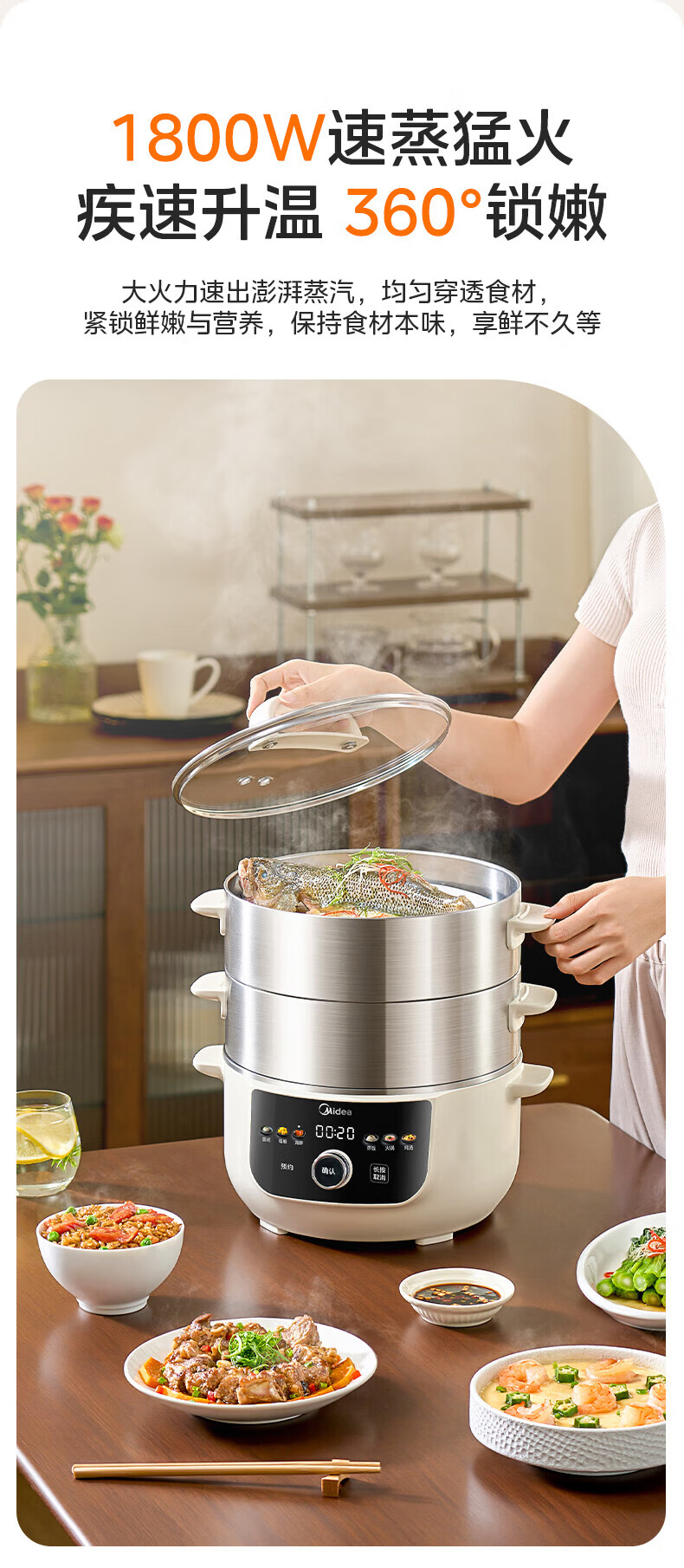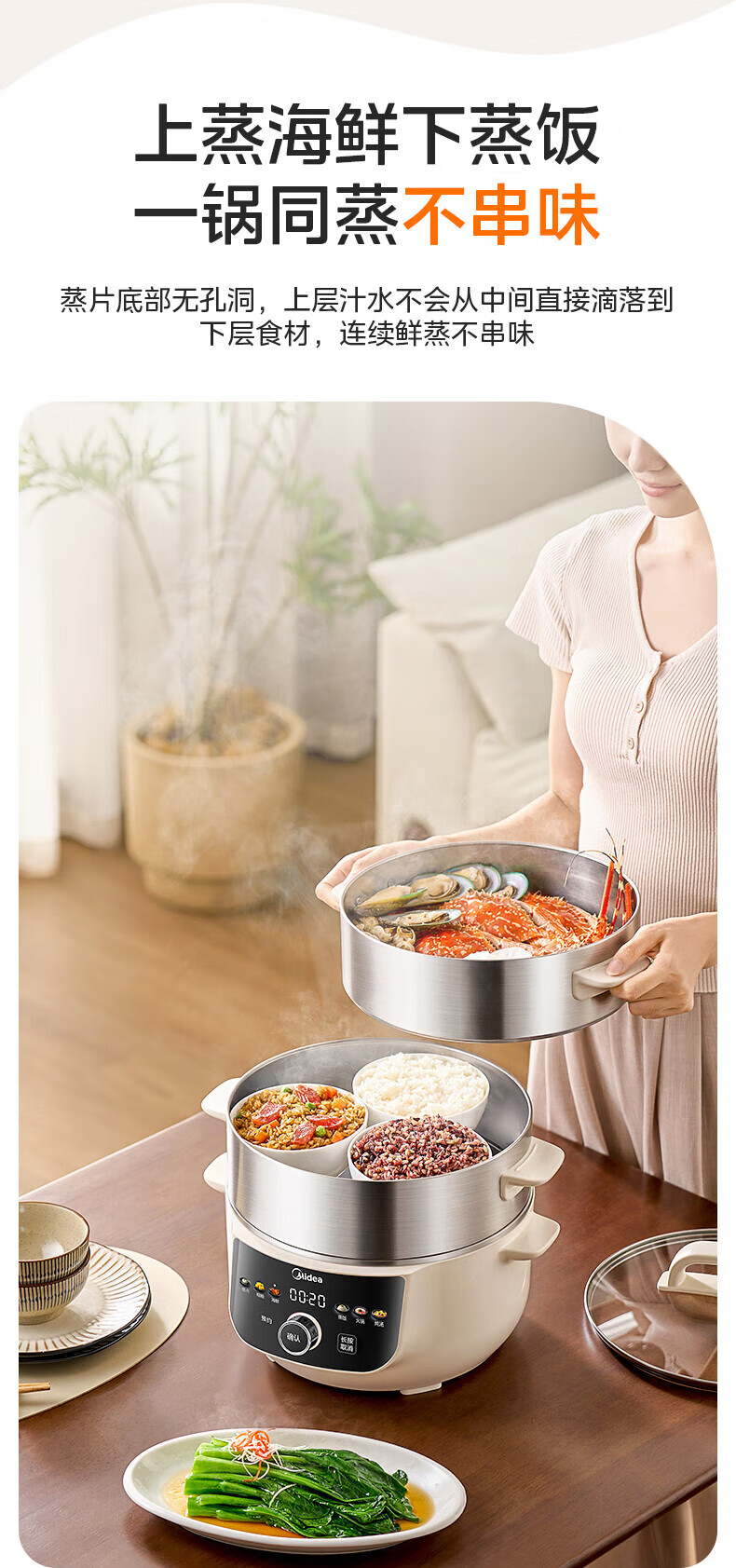 美的(Midea)电蒸锅 电煮锅 电火锅 家用多功能锅电锅蒸包子锅电热锅煮蛋器不锈钢蒸笼大容量多用途锅 10L 【26cm口径】ZG26EASY401