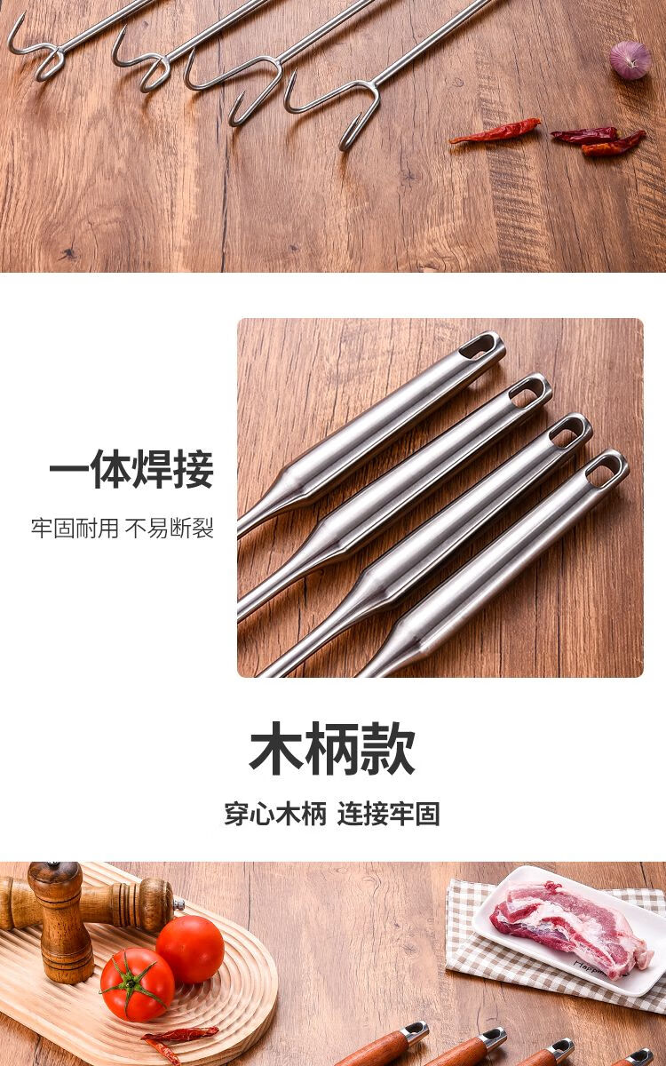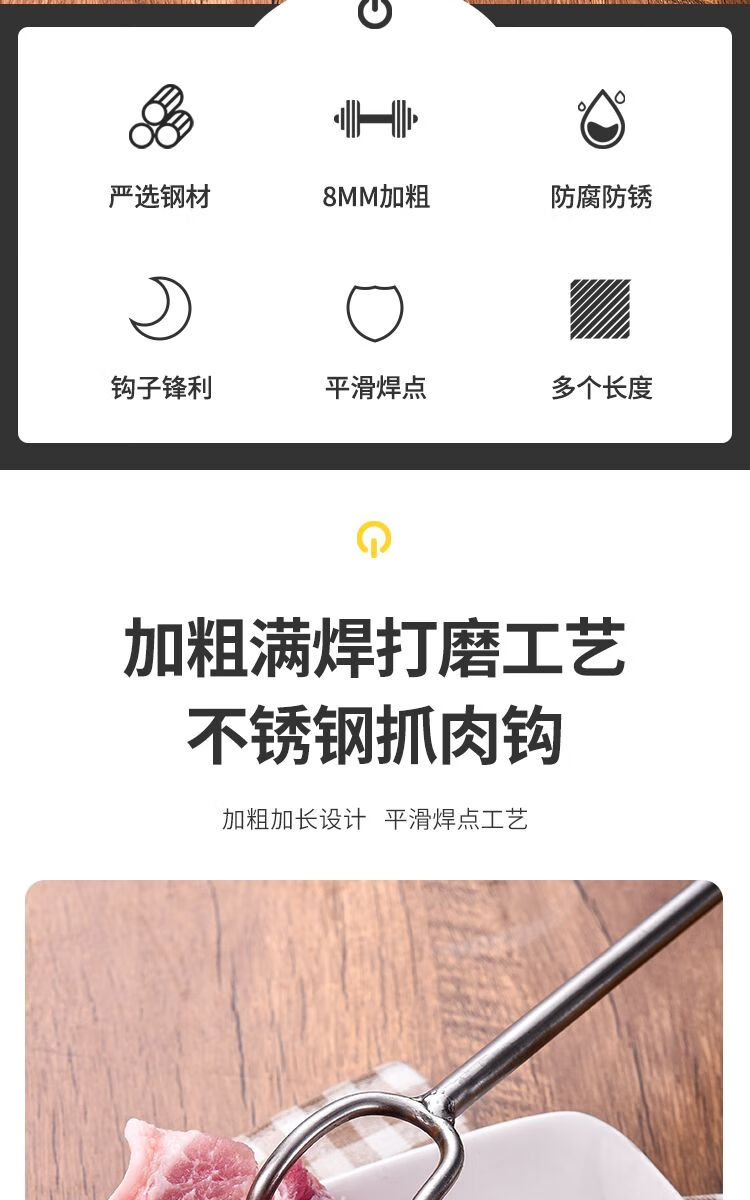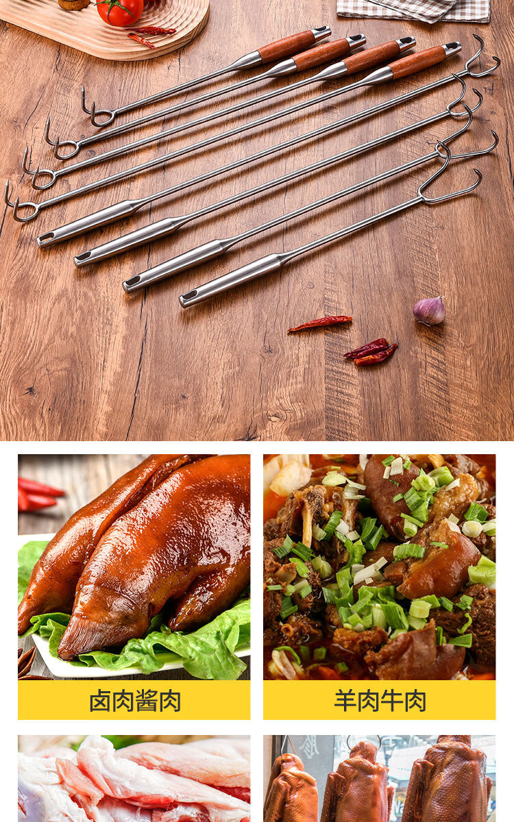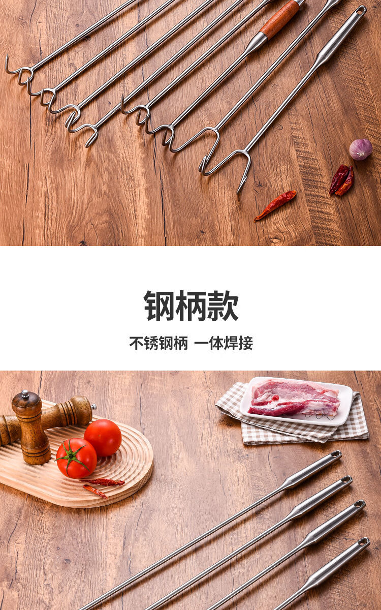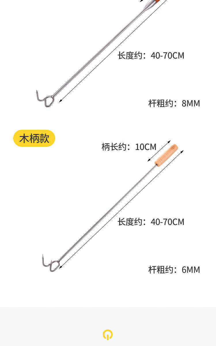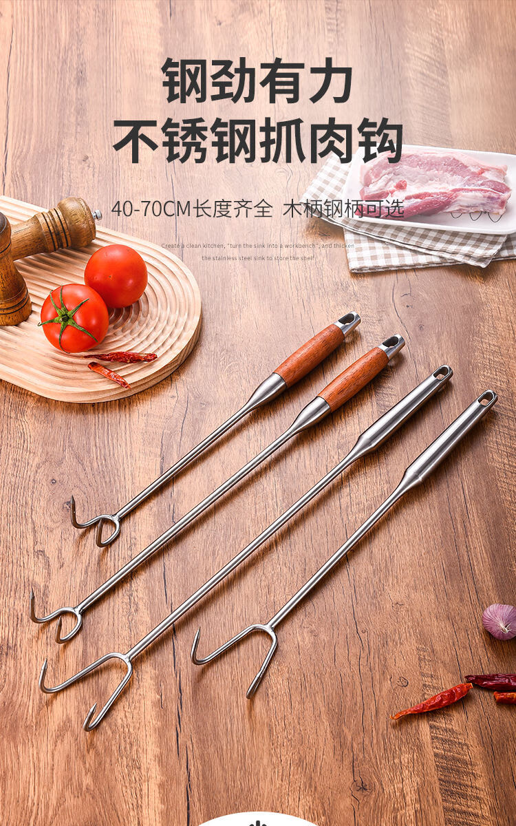 GIOIO加粗不锈钢抓钩捞肉长杆防烫长柄卤肉钩老式捞熟肉钩户外拾物捡菌 木头把手【3MM厚】-普通款
