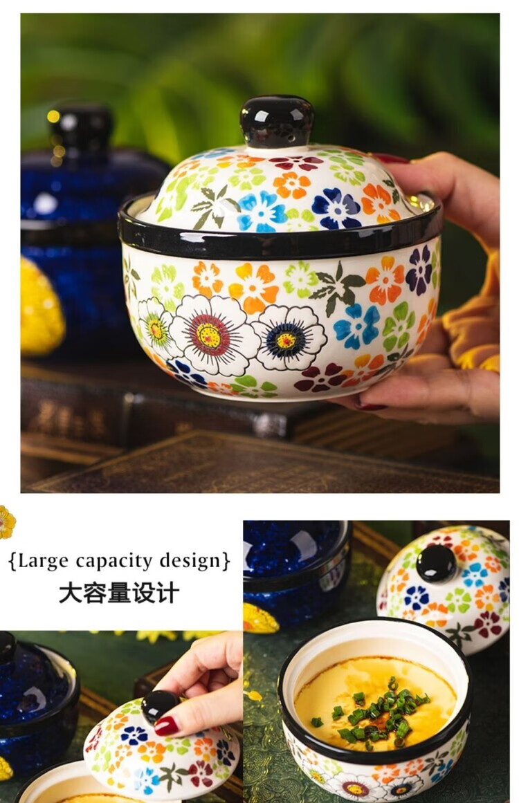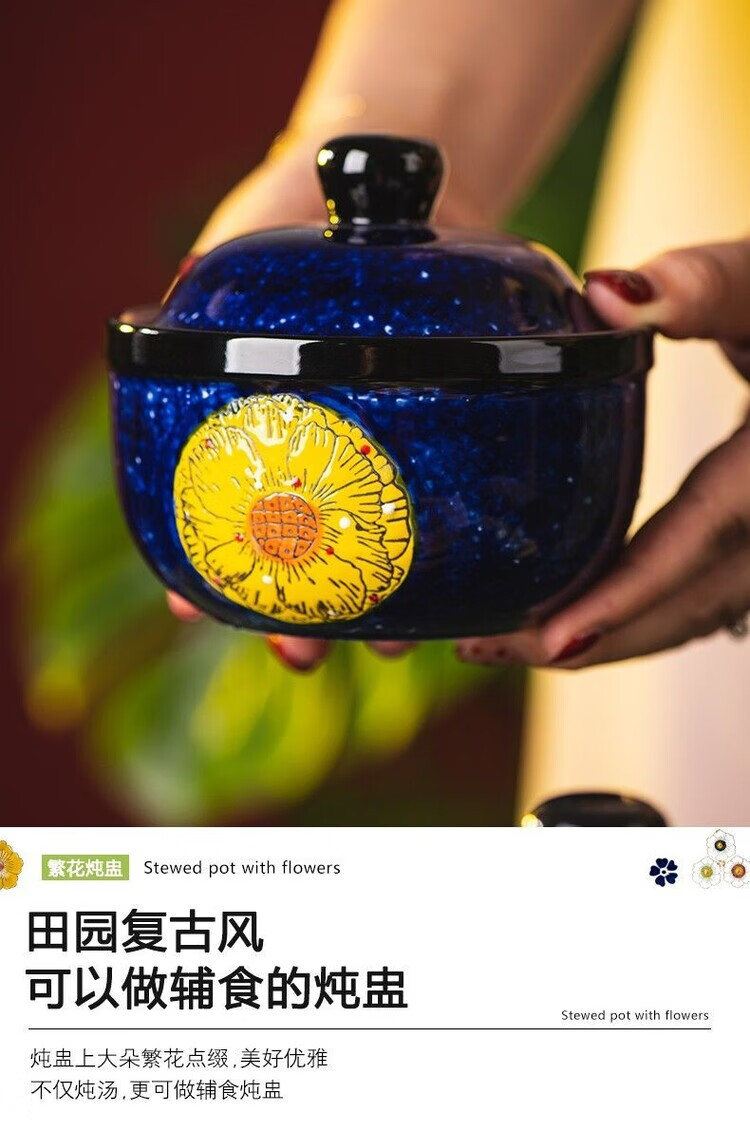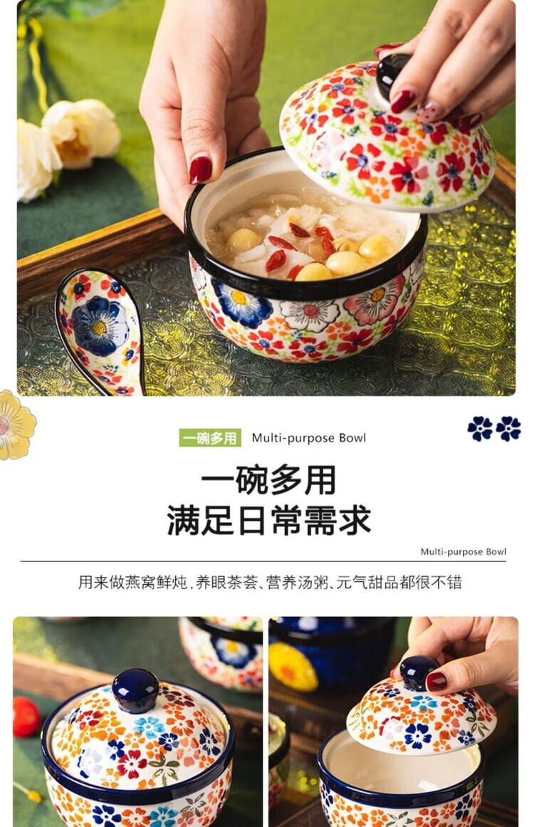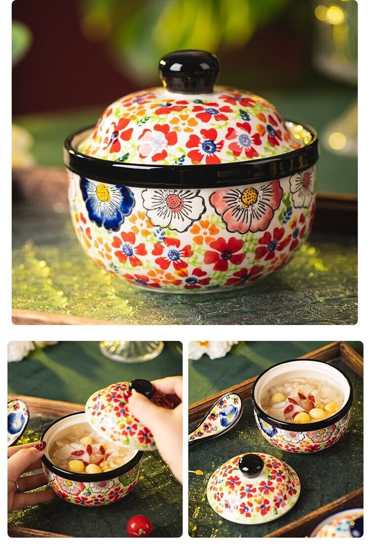 花沐禧手绘陶瓷小炖盅家用带盖汤盅隔水汤罐蒸蛋碗蒸鸡蛋羹专用碗甜品碗 漫花嫣红炖盅