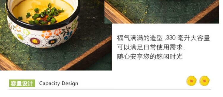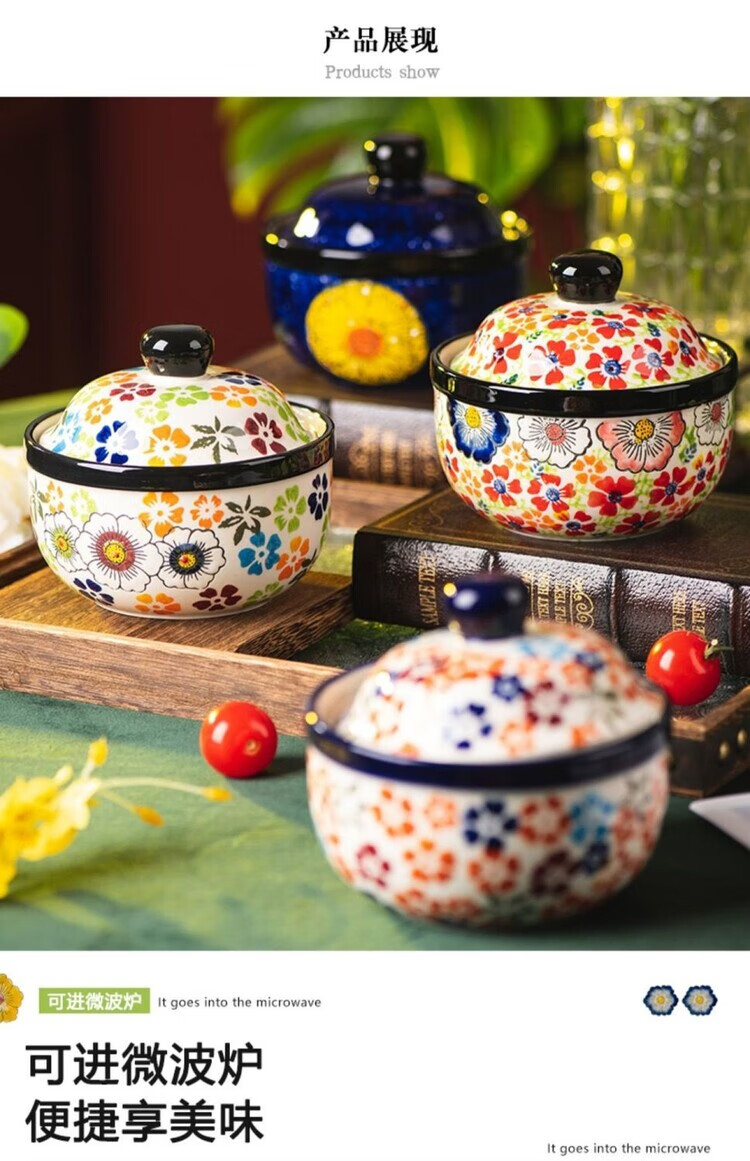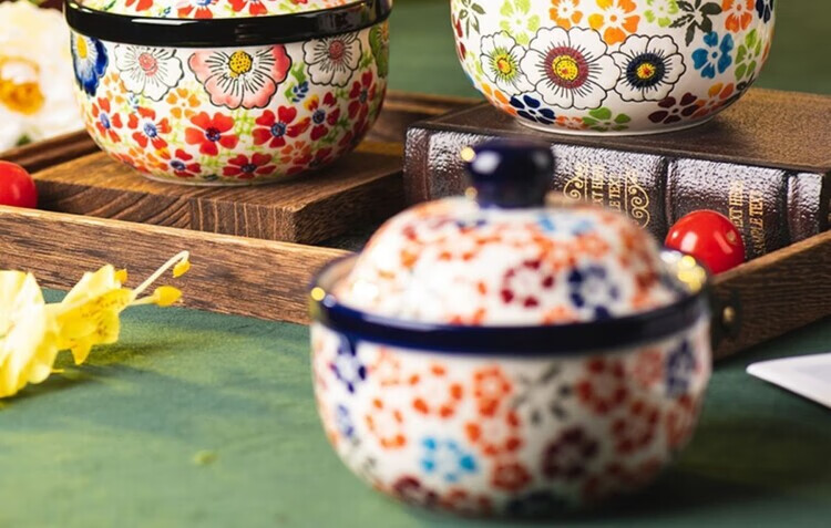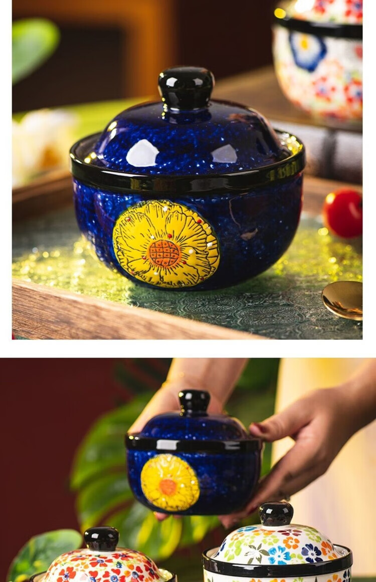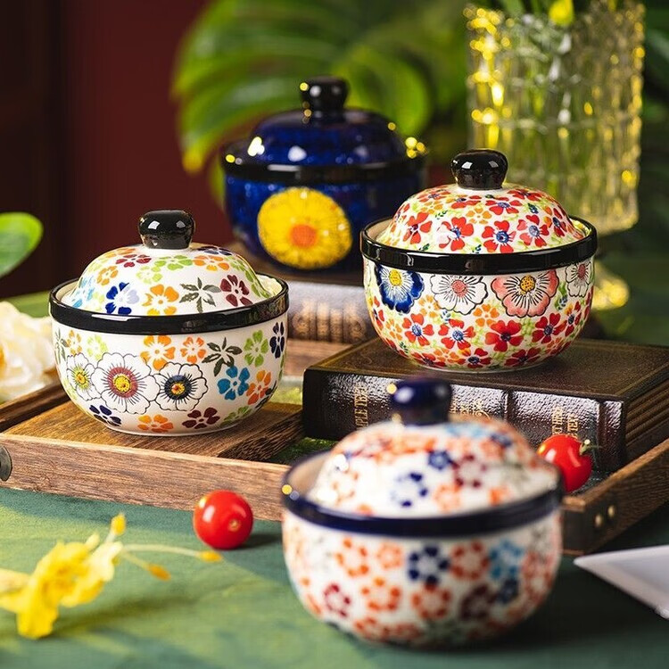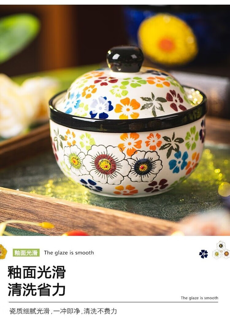 花沐禧手绘陶瓷小炖盅家用带盖汤盅隔水汤罐蒸蛋碗蒸鸡蛋羹专用碗甜品碗 漫花嫣红炖盅