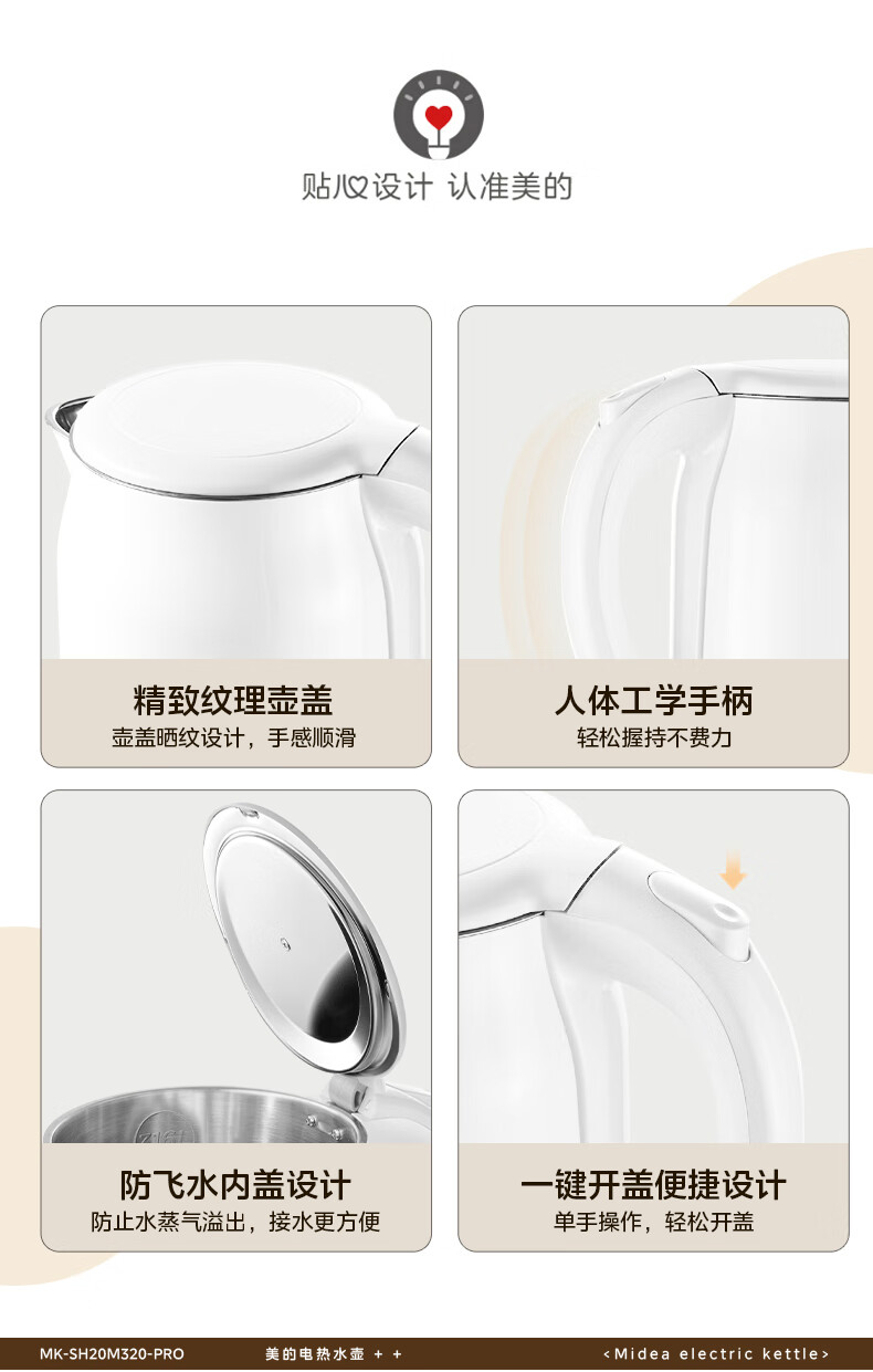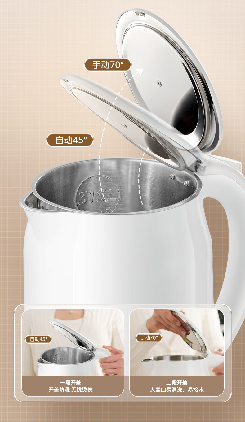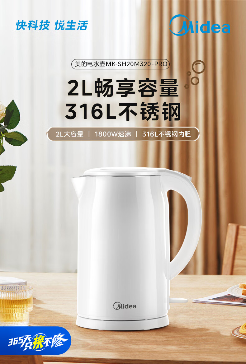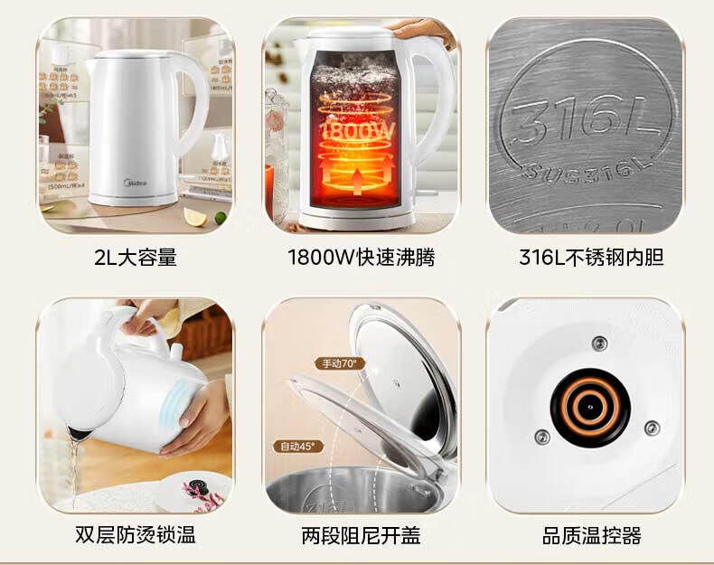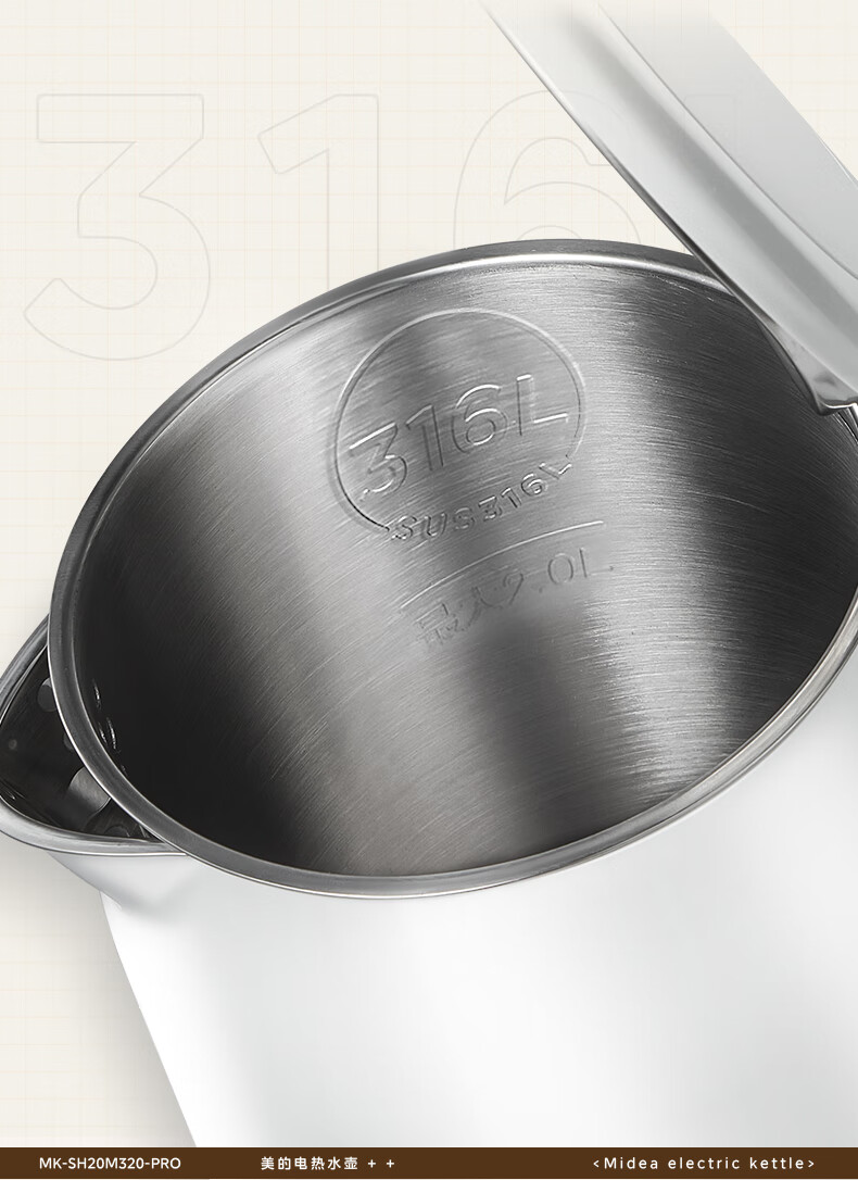 美的(Midea)烧水壶电水壶热水壶母婴级316L不锈钢 0涂层2升大容量开水壶 双层防烫 MK-SH20M320-PRO