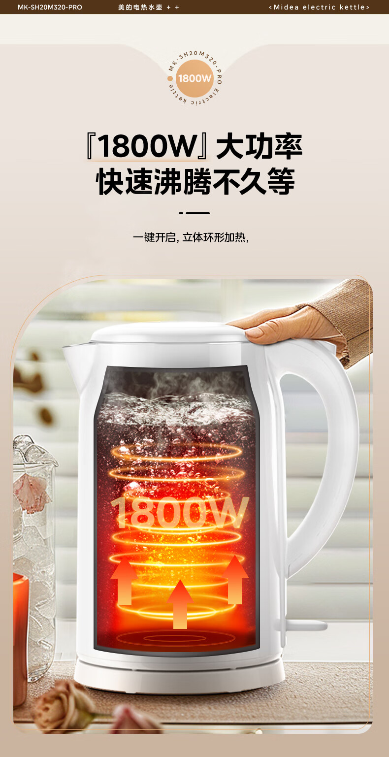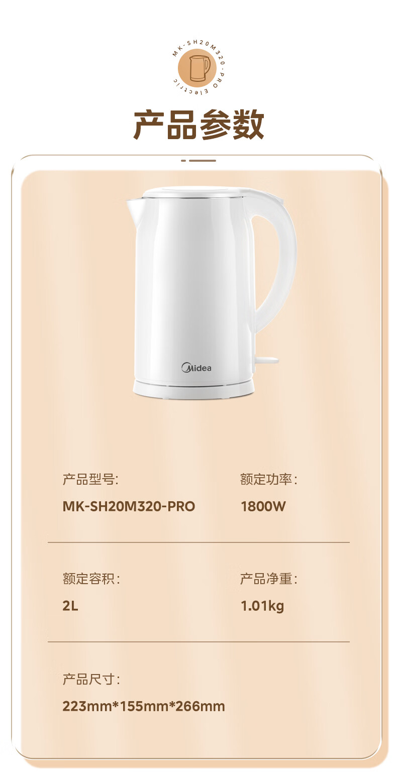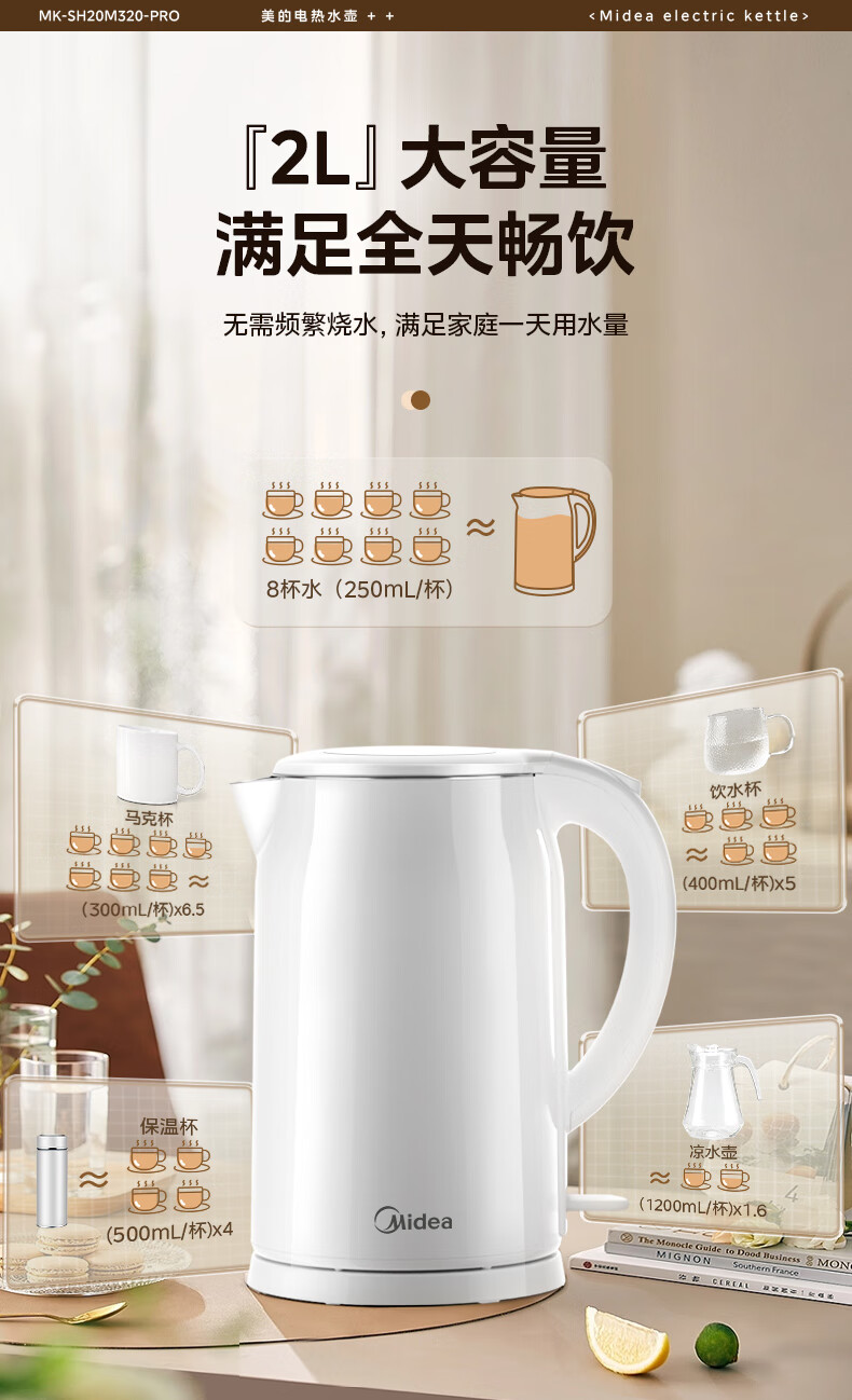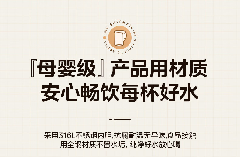 美的(Midea)烧水壶电水壶热水壶母婴级316L不锈钢 0涂层2升大容量开水壶 双层防烫 MK-SH20M320-PRO