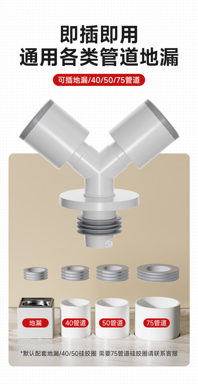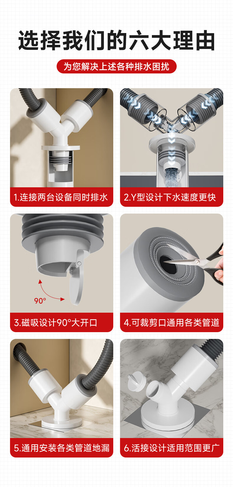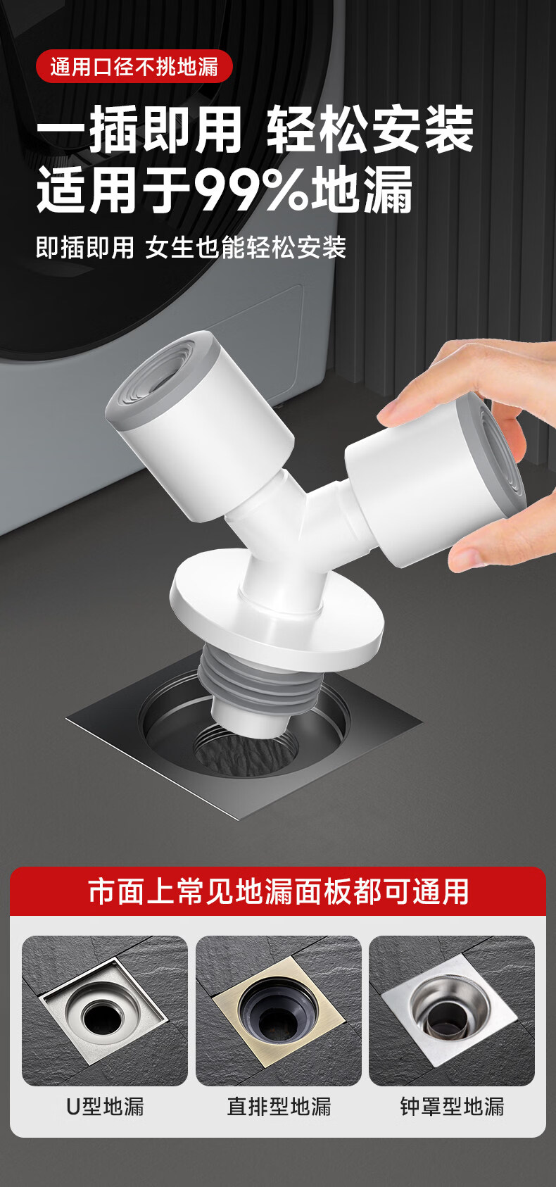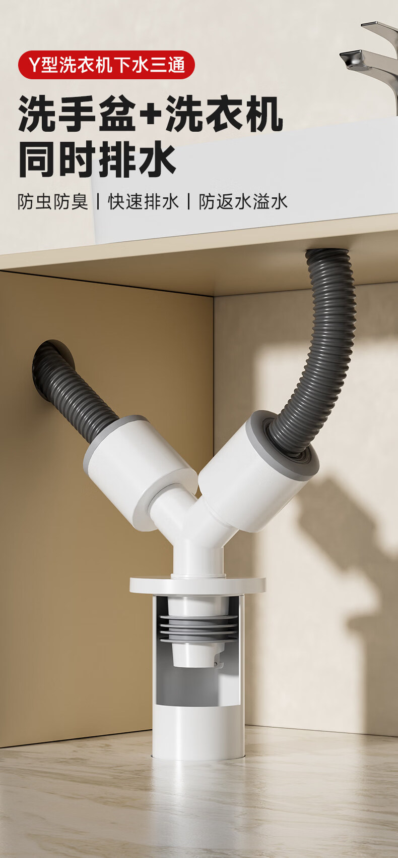 壹品印象阳台洗衣机下水三头通分水器烘干机排水管道四通防反水止逆阀接头 奶白【Y型大头两通】防臭防虫大排量防溢 (洗衣机/面盆/烘干机/扫地机器人)