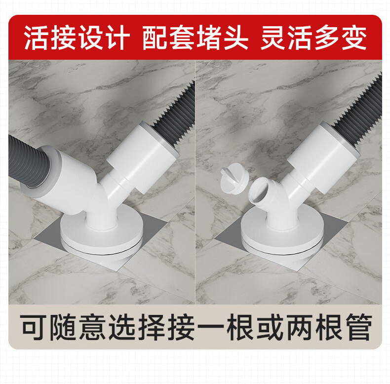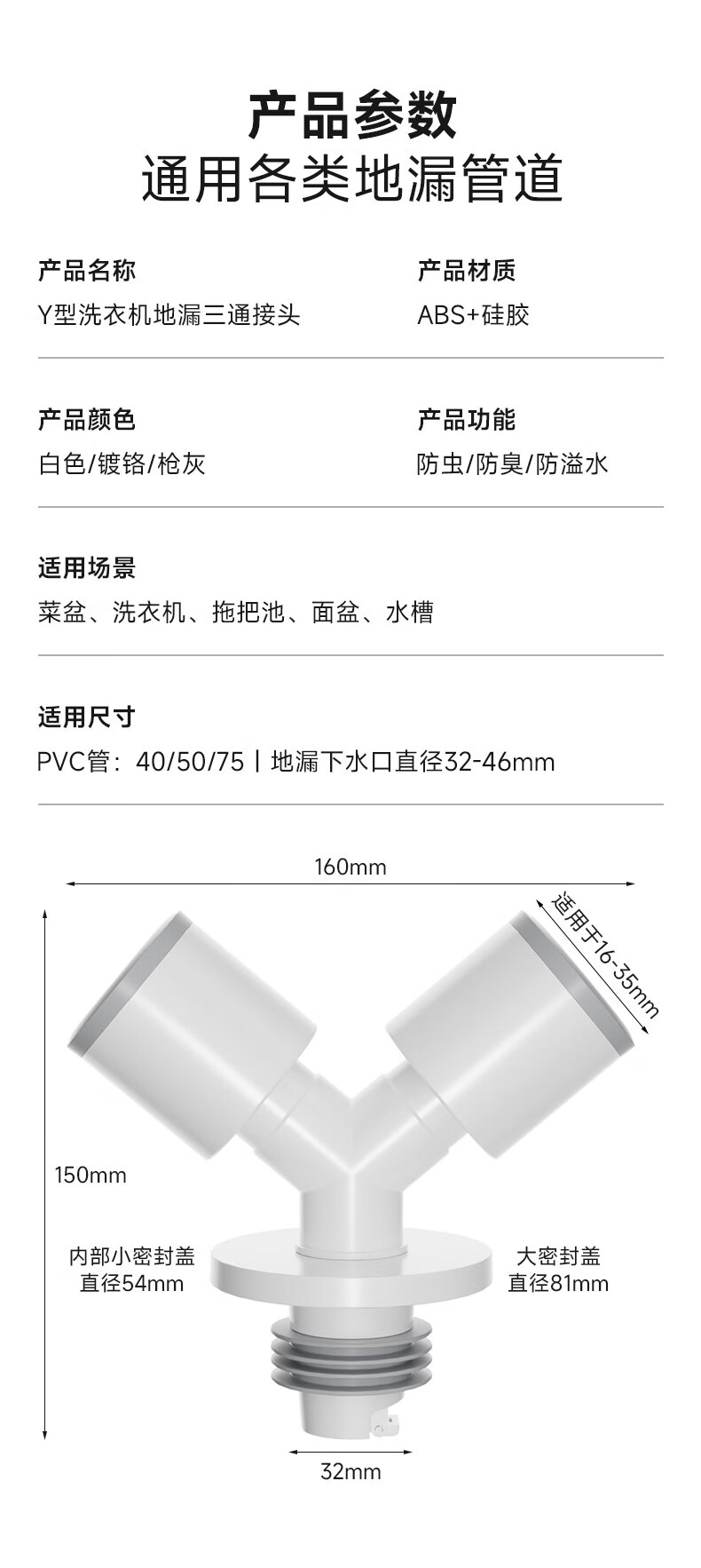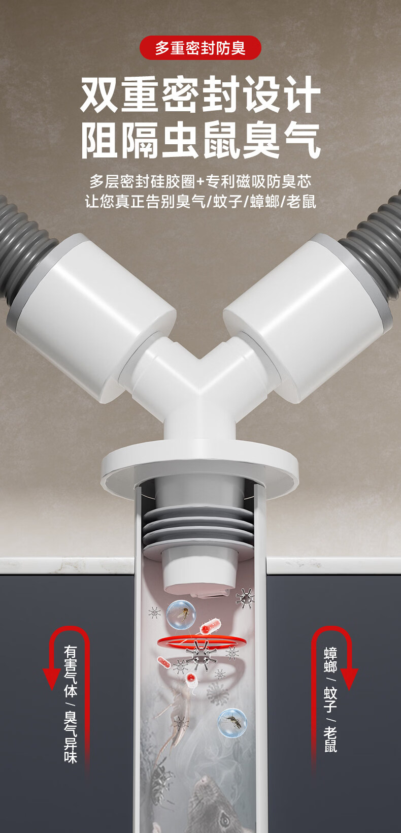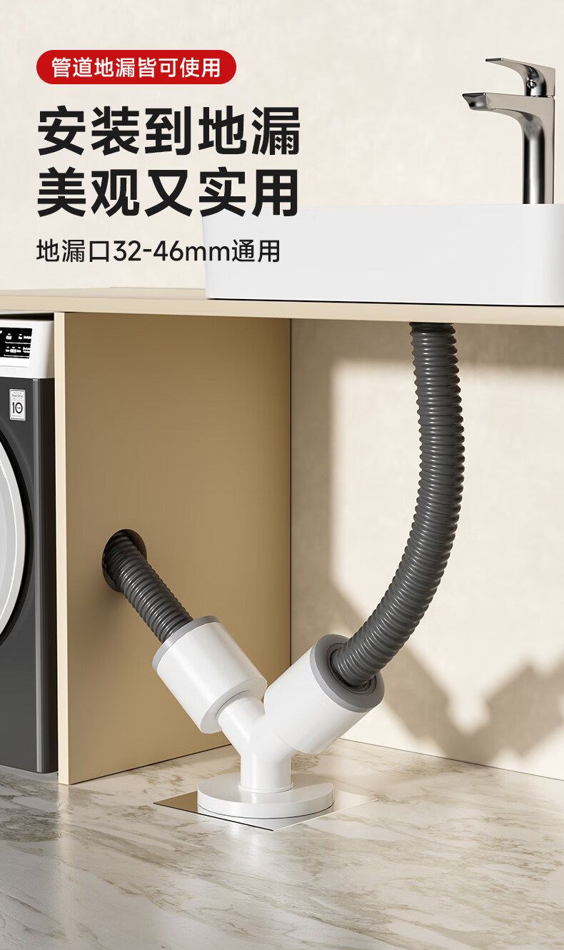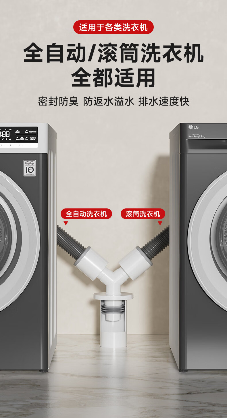 壹品印象阳台洗衣机下水三头通分水器烘干机排水管道四通防反水止逆阀接头 奶白【Y型大头两通】防臭防虫大排量防溢 (洗衣机/面盆/烘干机/扫地机器人)