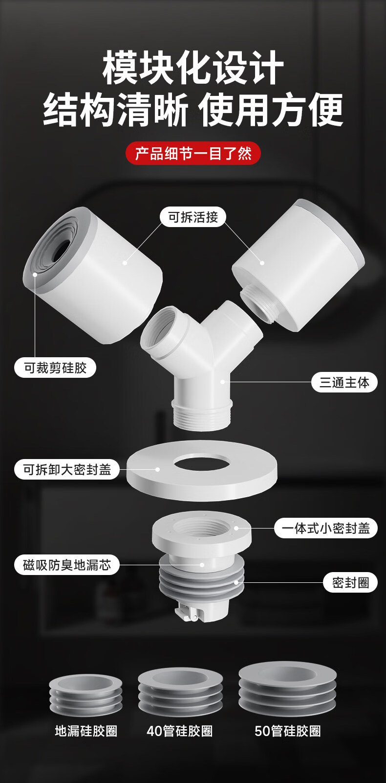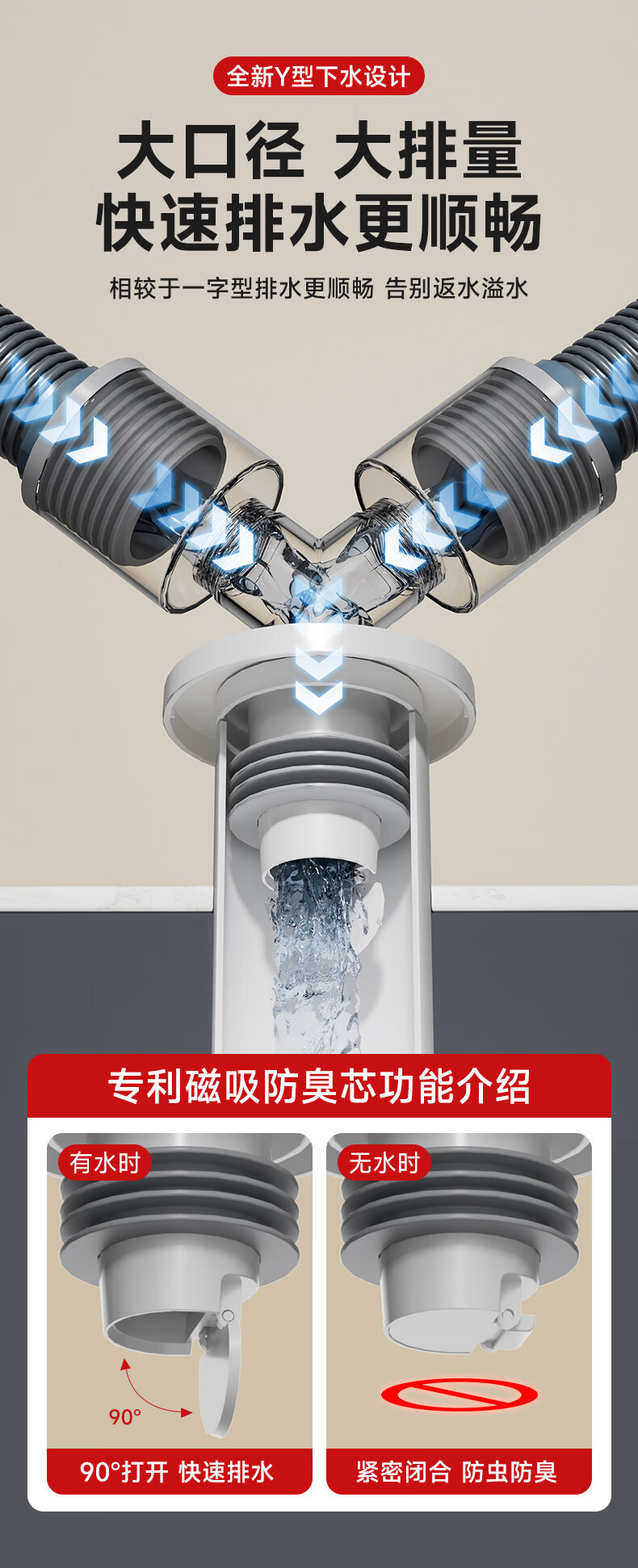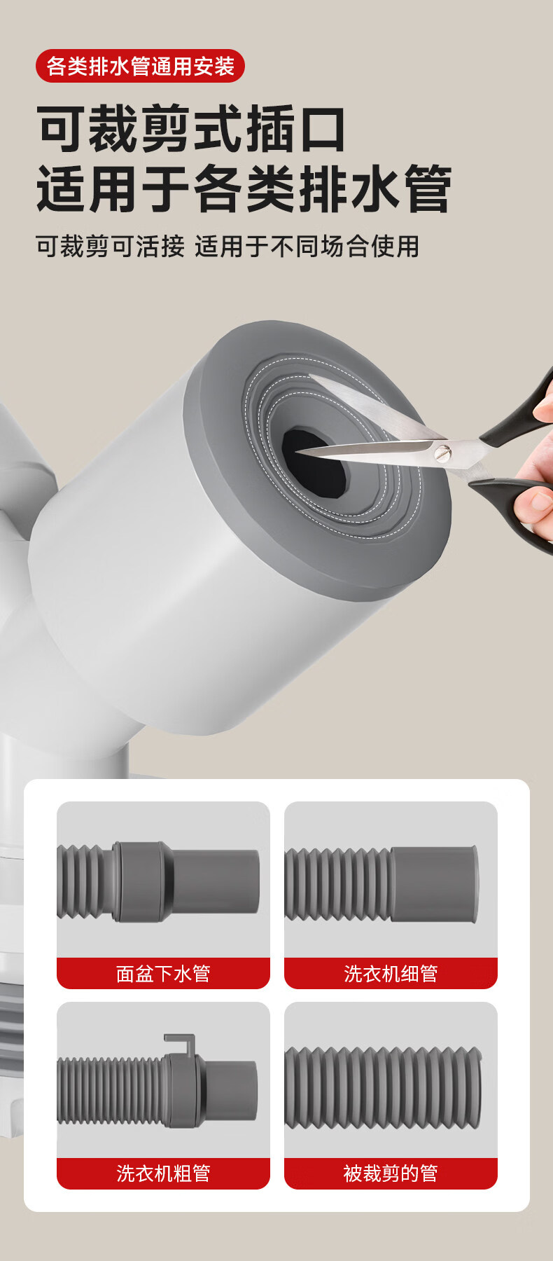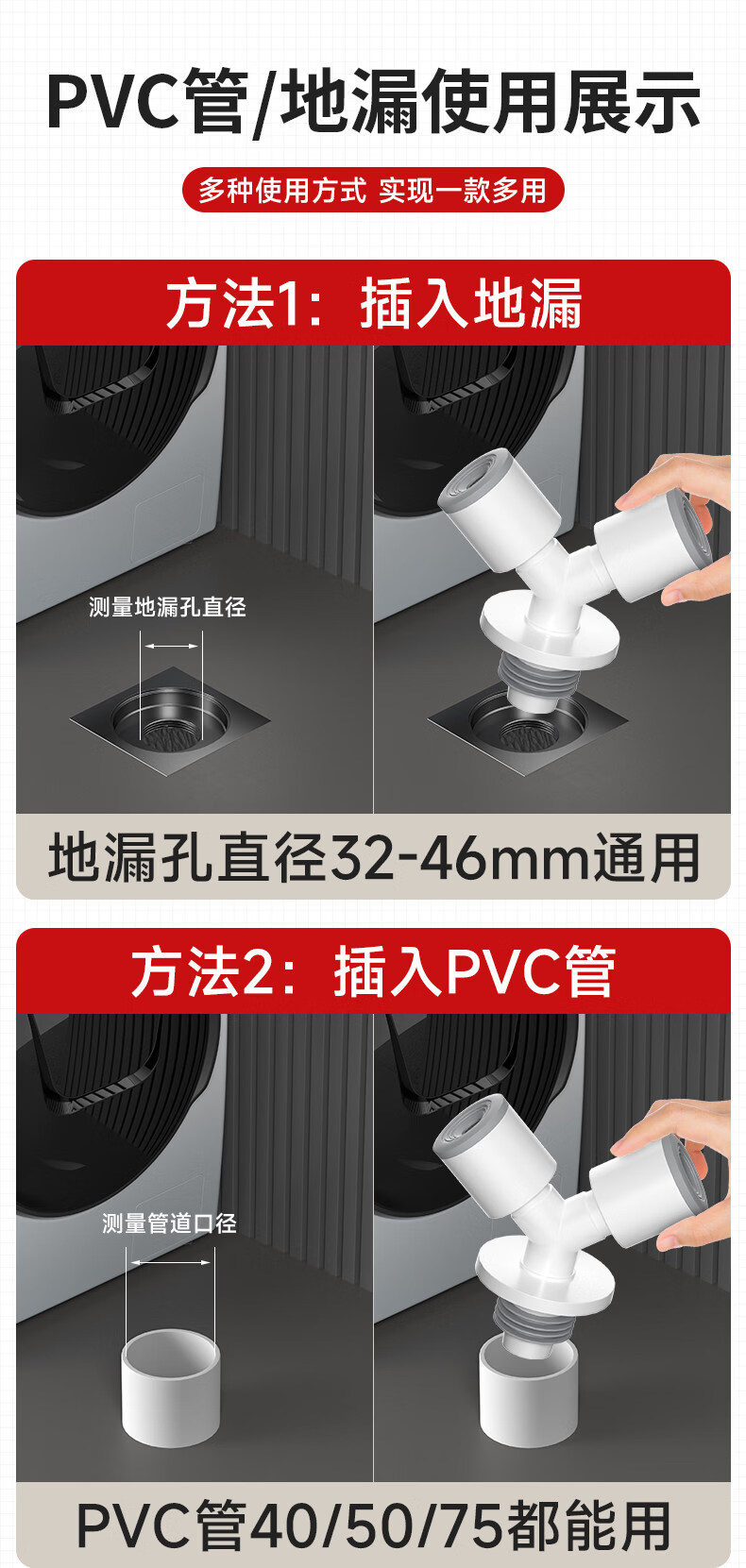 壹品印象阳台洗衣机下水三头通分水器烘干机排水管道四通防反水止逆阀接头 奶白【Y型大头两通】防臭防虫大排量防溢 (洗衣机/面盆/烘干机/扫地机器人)