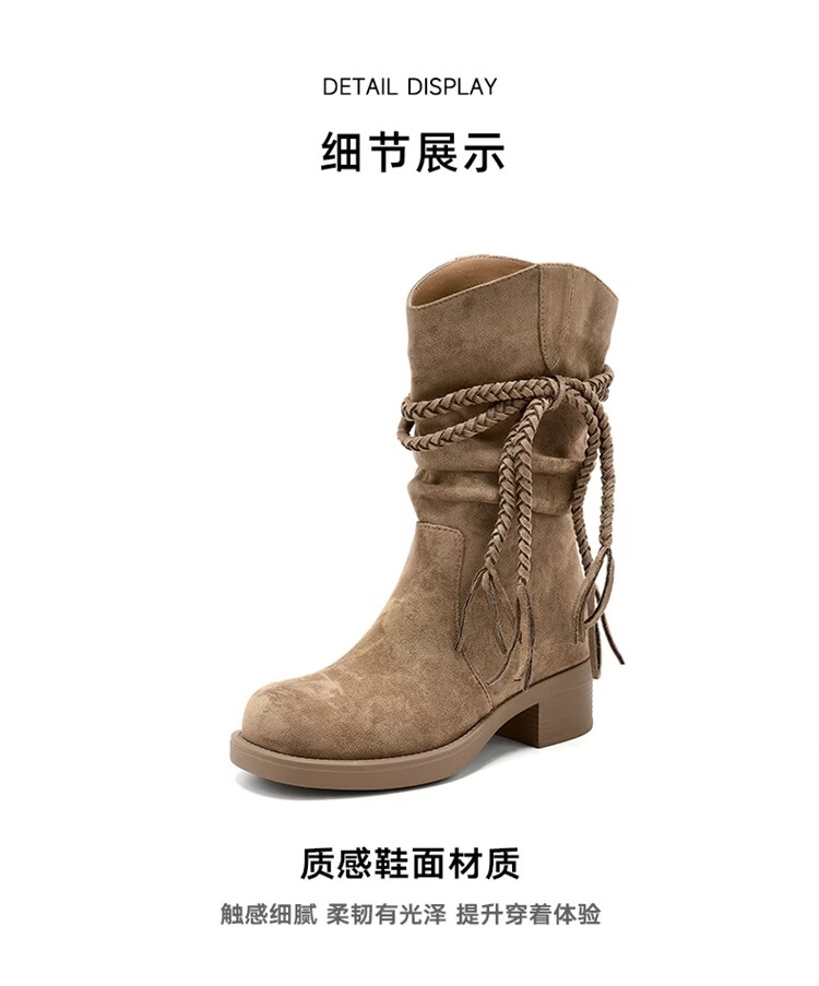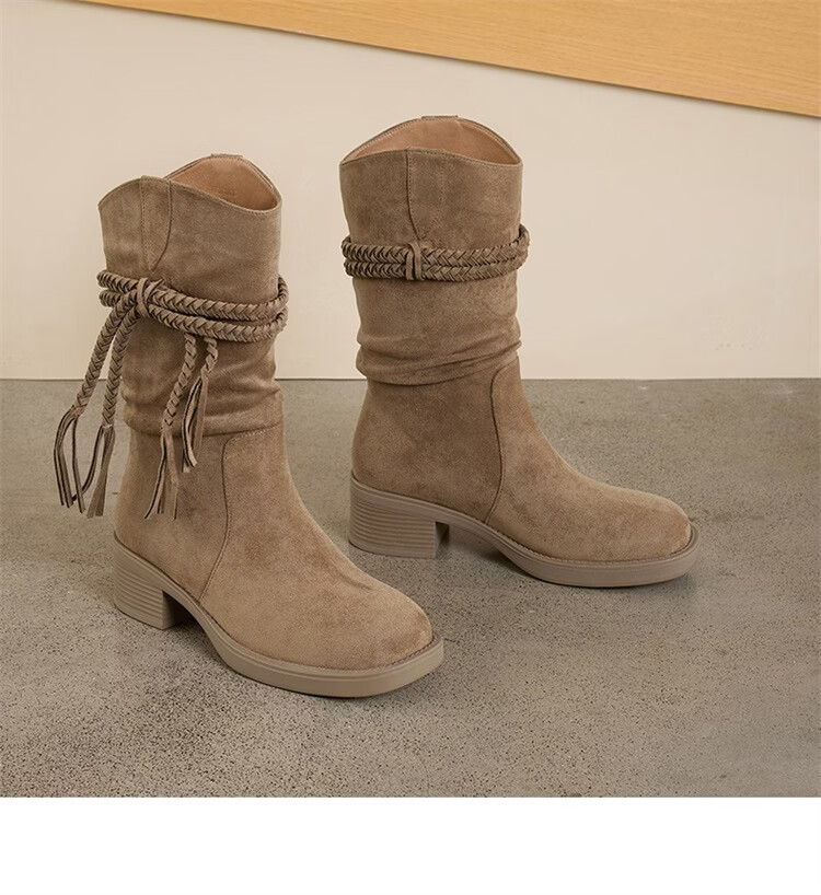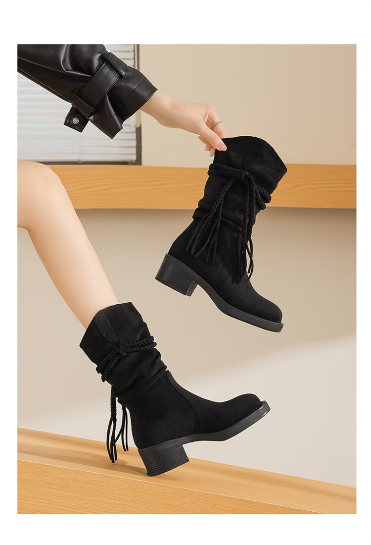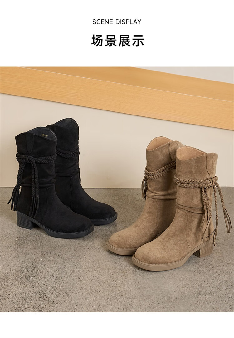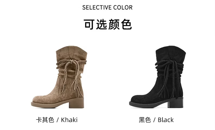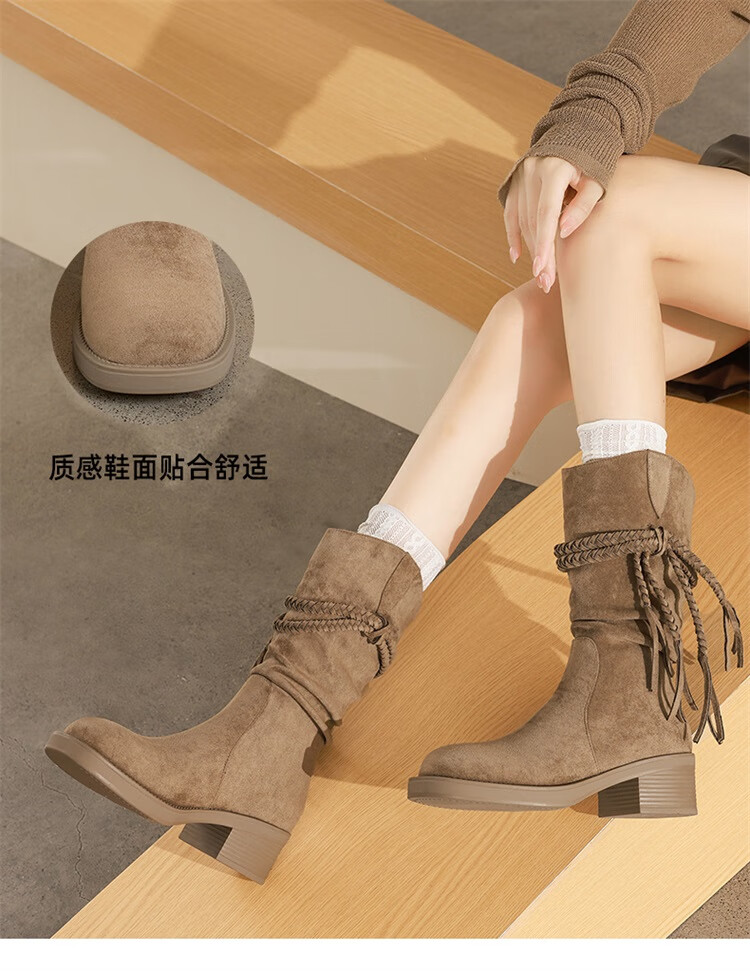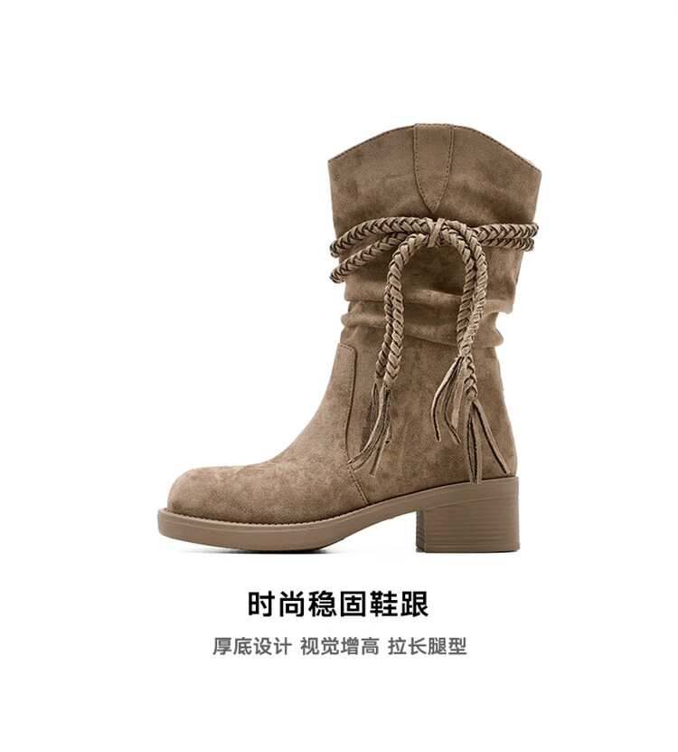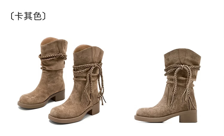 星期六复古堆堆靴女2025新款冬季流苏短靴子女西部靴废土风骑士靴 卡其色 【羊皮革鞋垫】跟高5cm 35