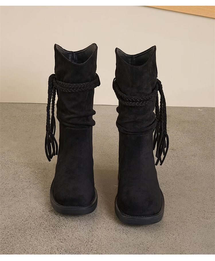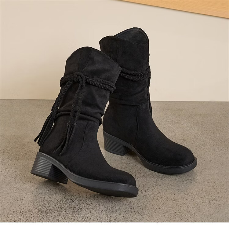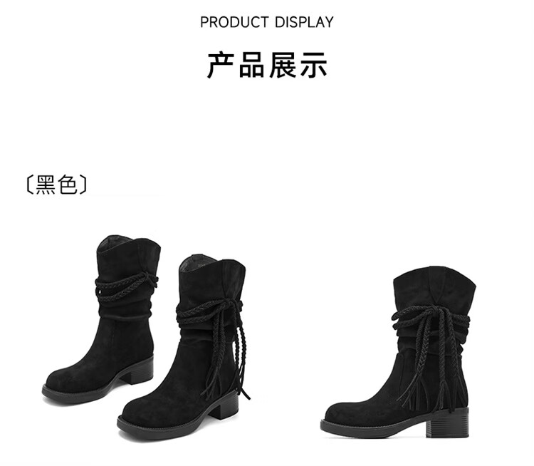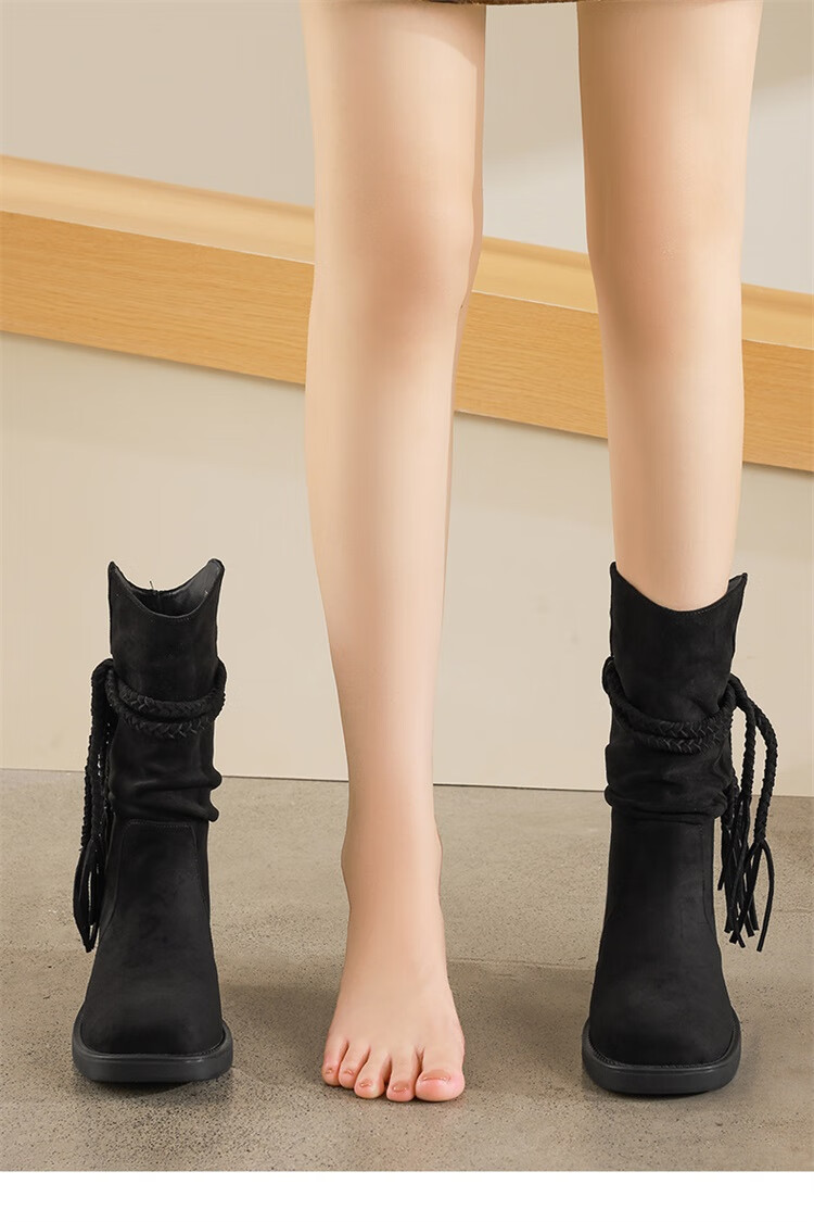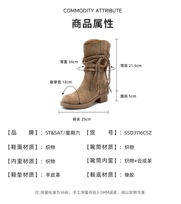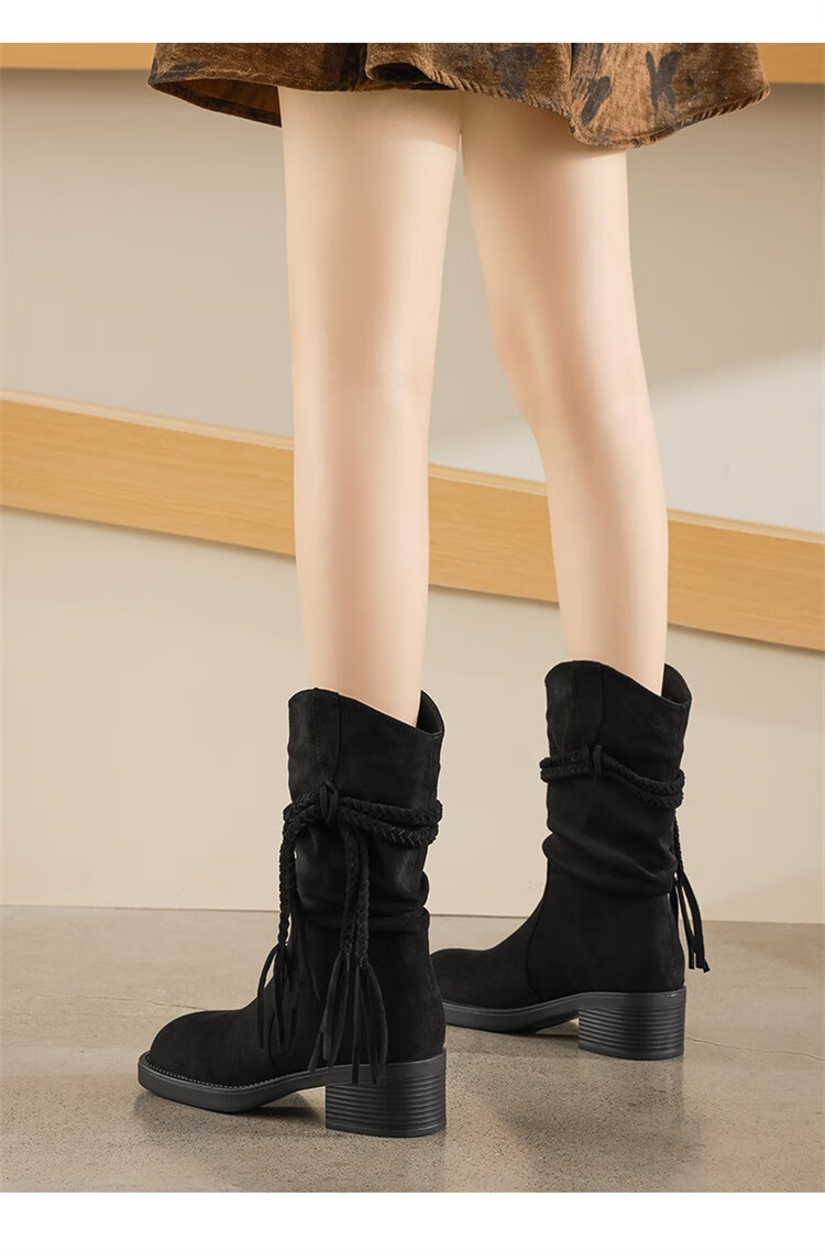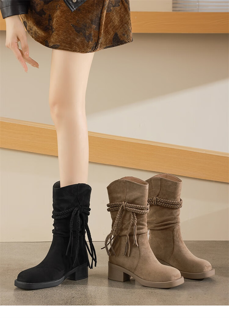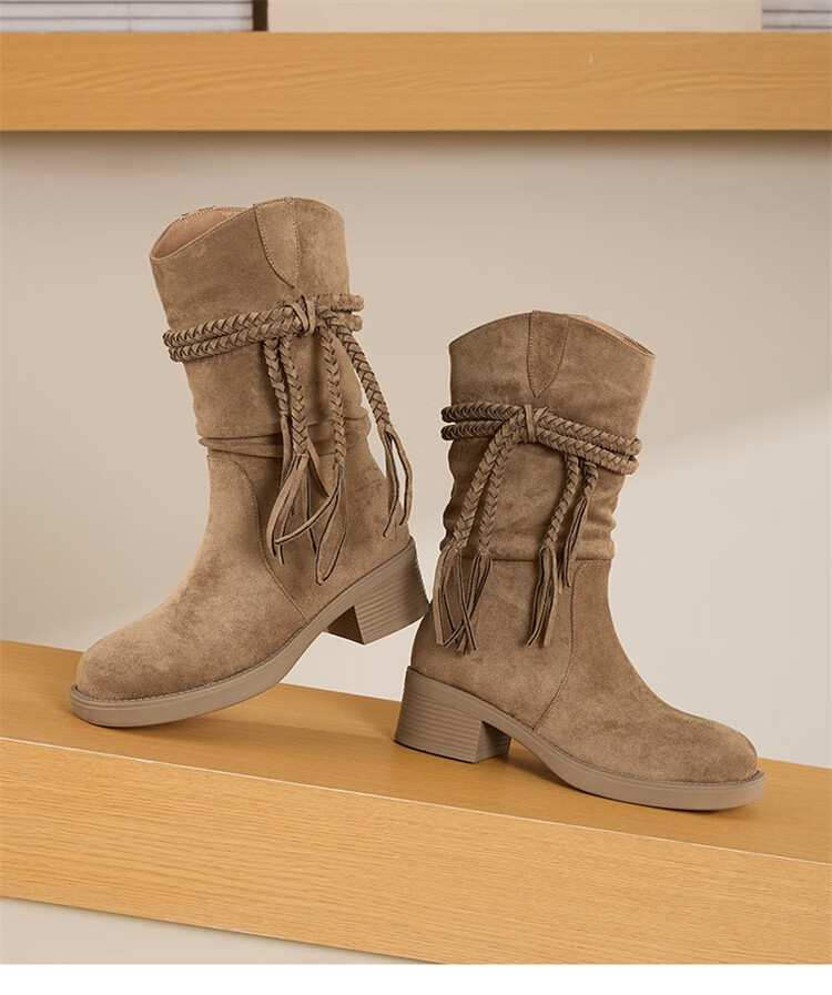 星期六复古堆堆靴女2025新款冬季流苏短靴子女西部靴废土风骑士靴 卡其色 【羊皮革鞋垫】跟高5cm 35