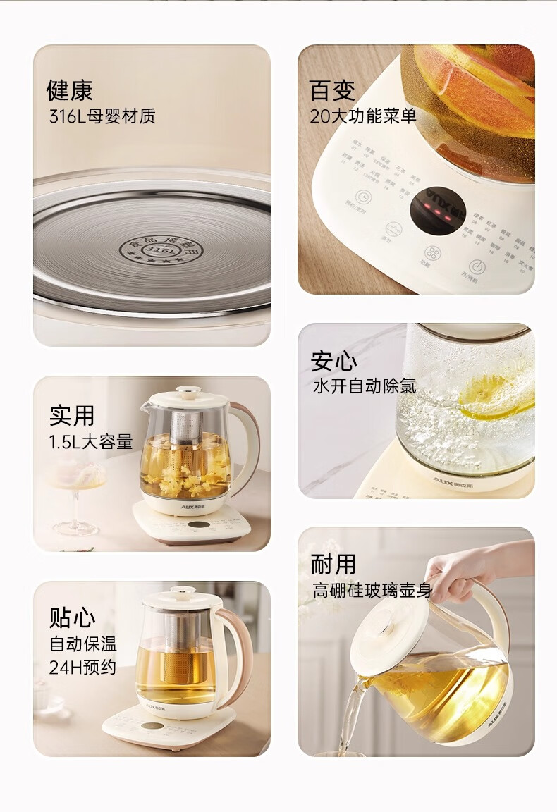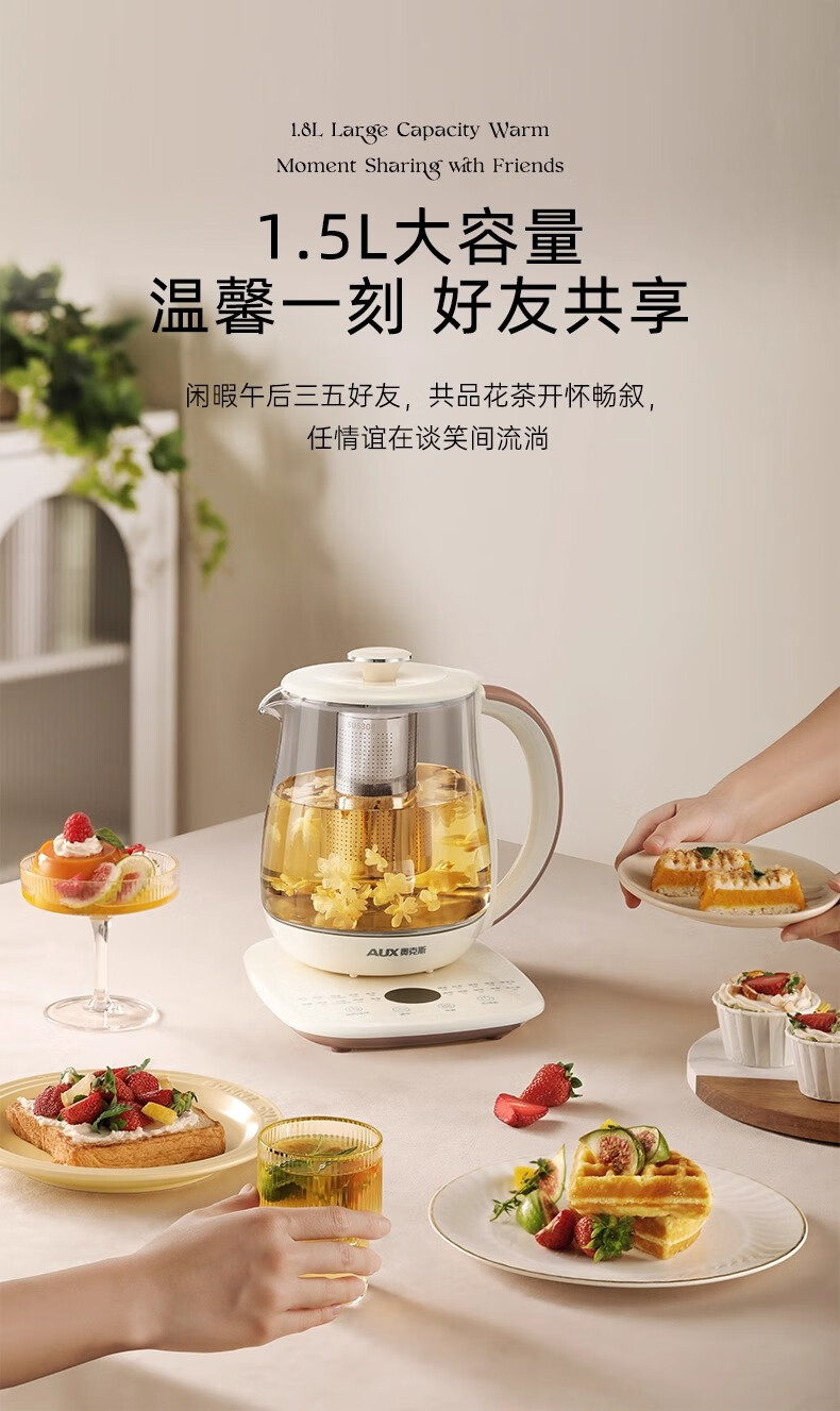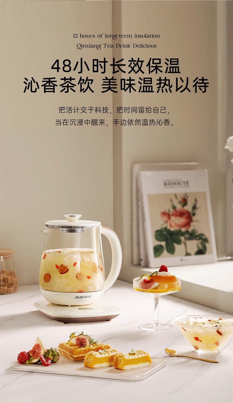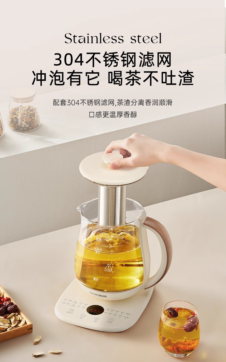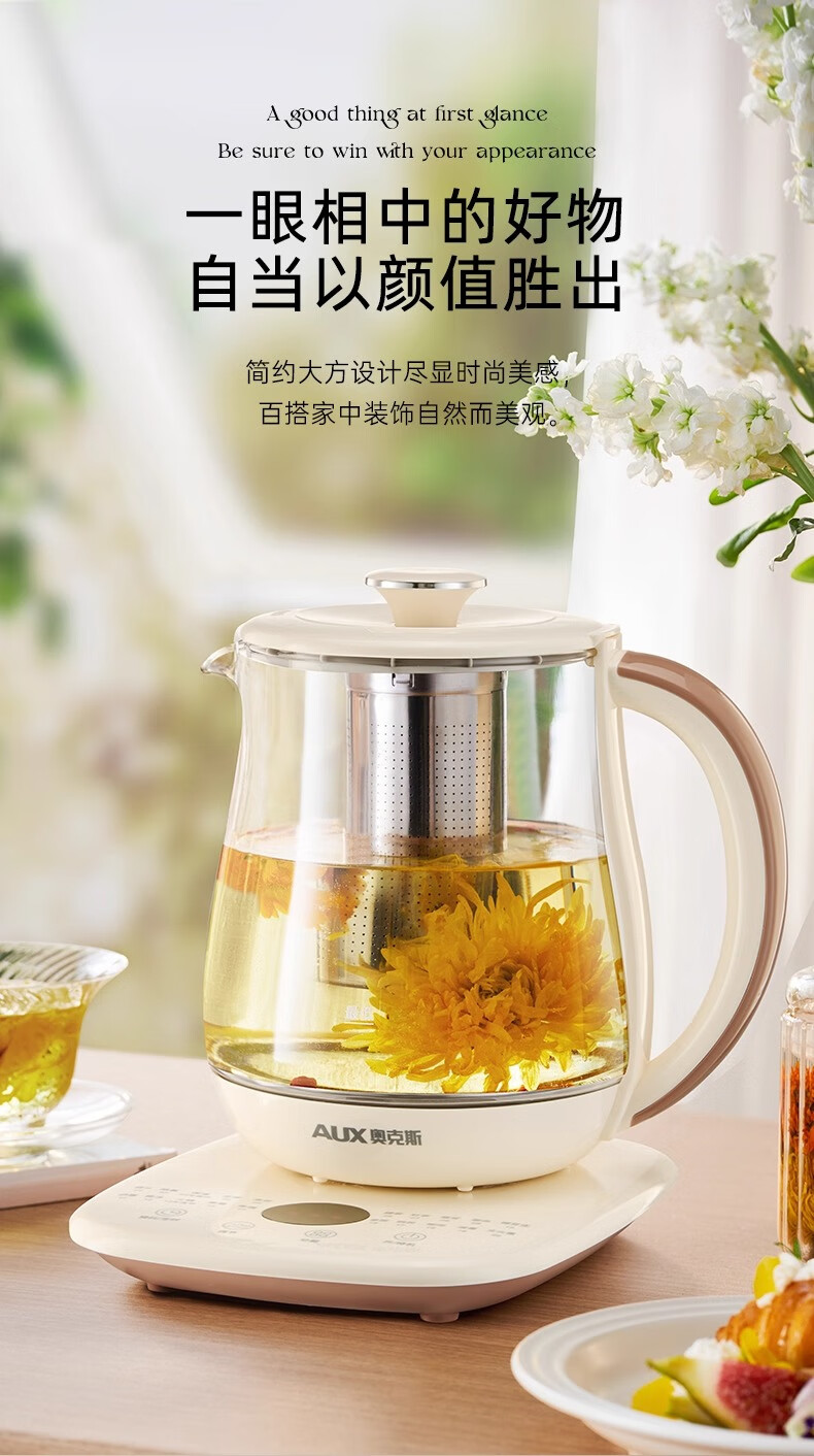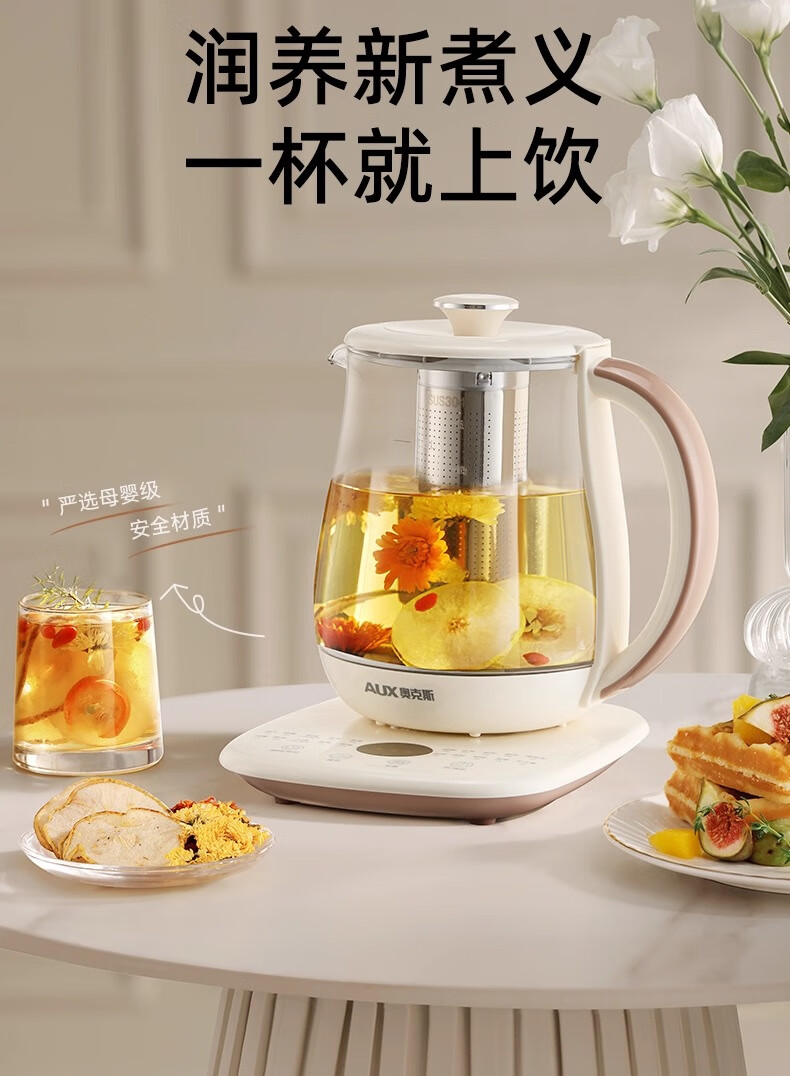奥克斯(AUX)养生壶全自动1.5L家用煮茶壶24h预约烧水壶办公室多功能48小时智能恒温花茶壶煮茶器304底盘