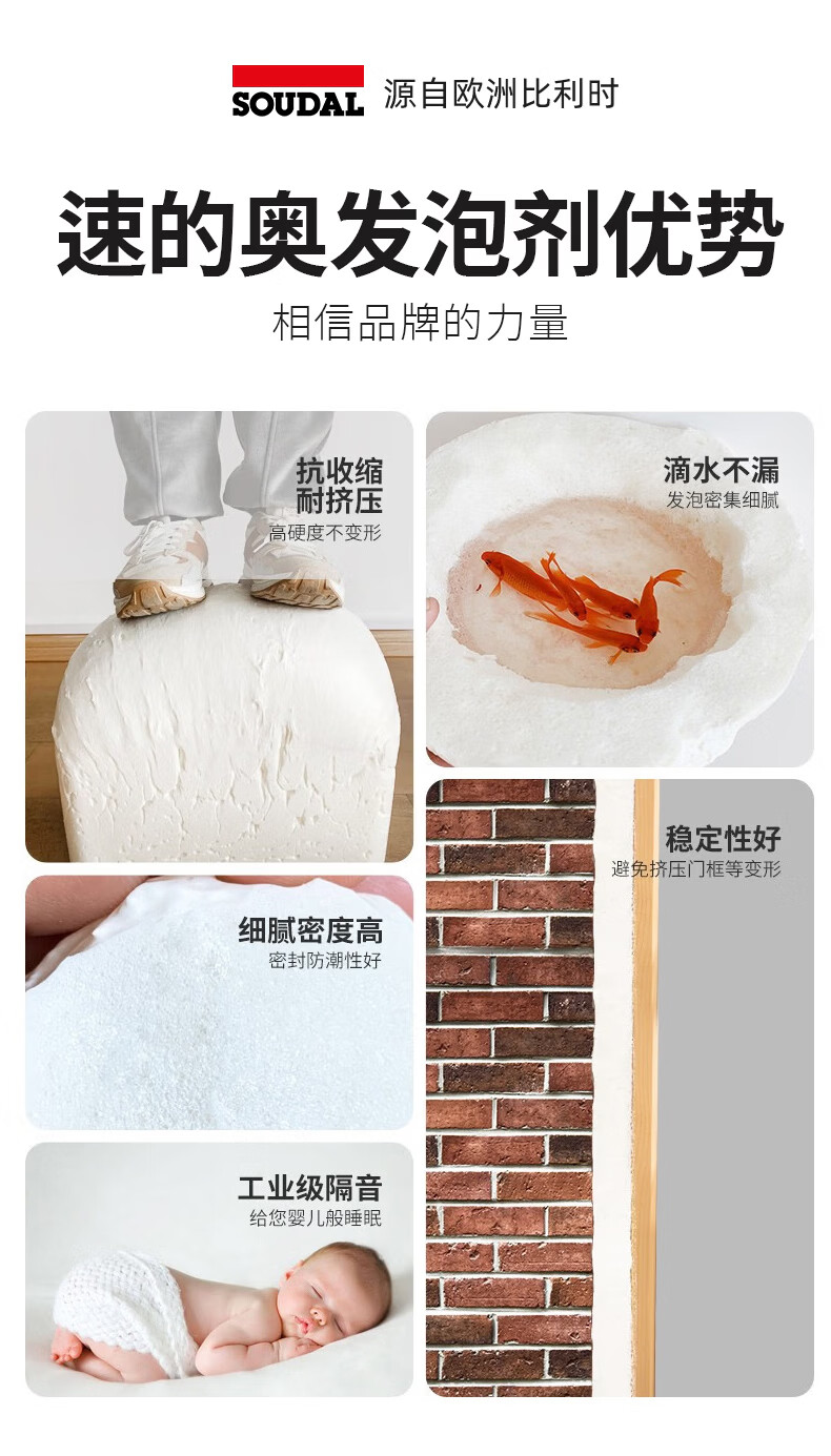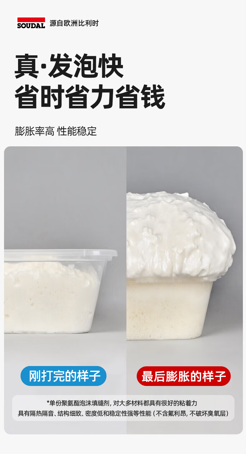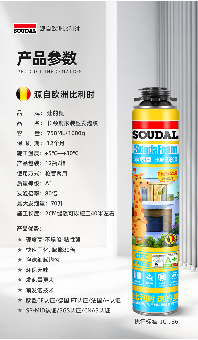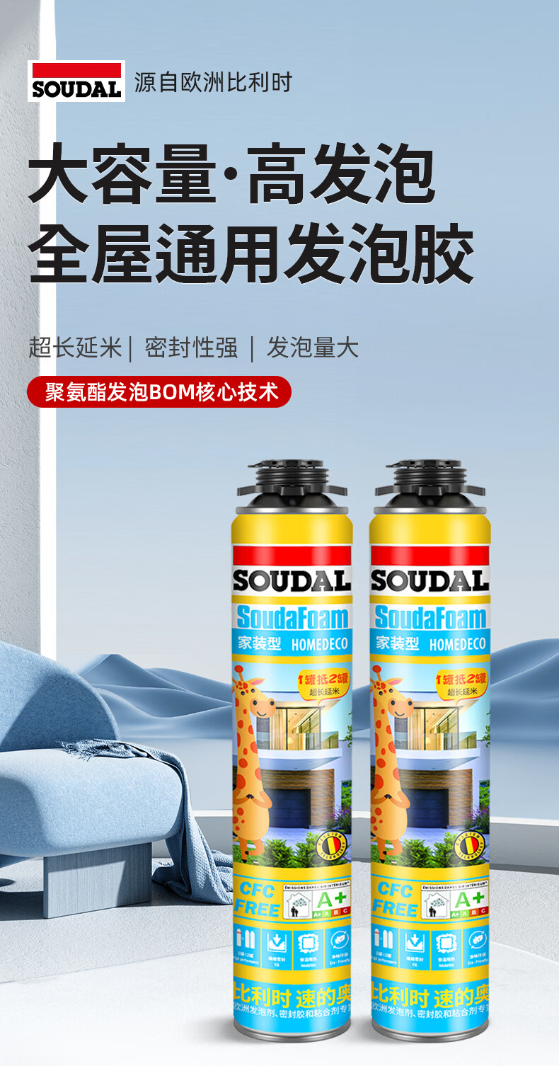 速的奥(SOUDAL)长颈鹿发泡胶隔热隔音聚氨酯喷涂粘结泡沫填充堵缝剂 A1质量 1000g/瓶 大容量·1瓶 比利时皇家指定品牌