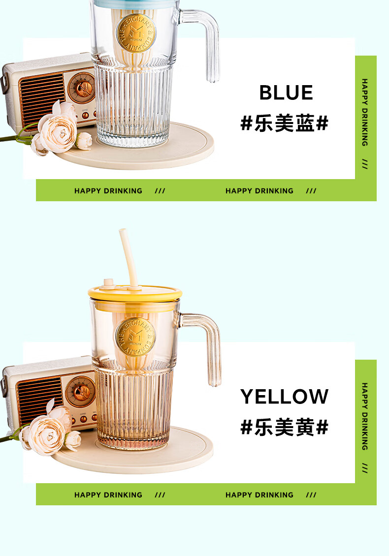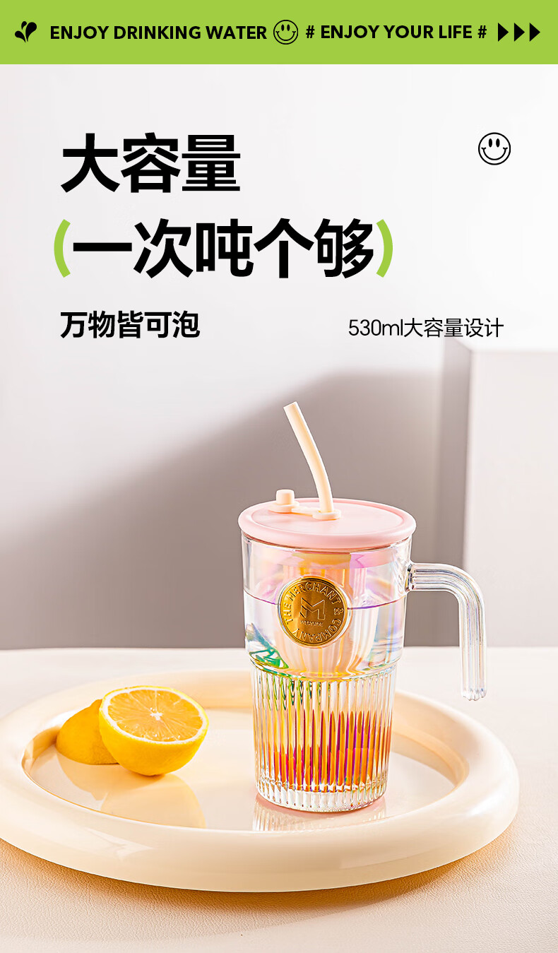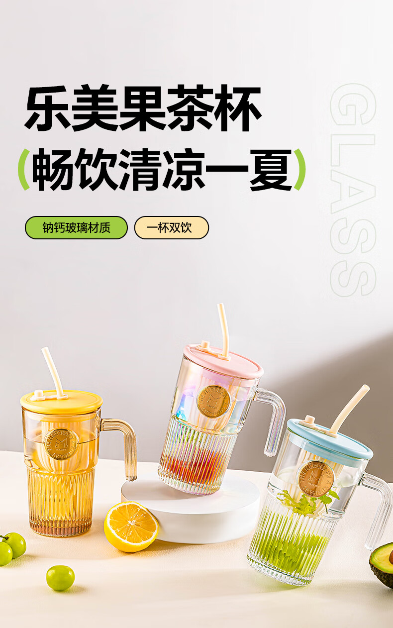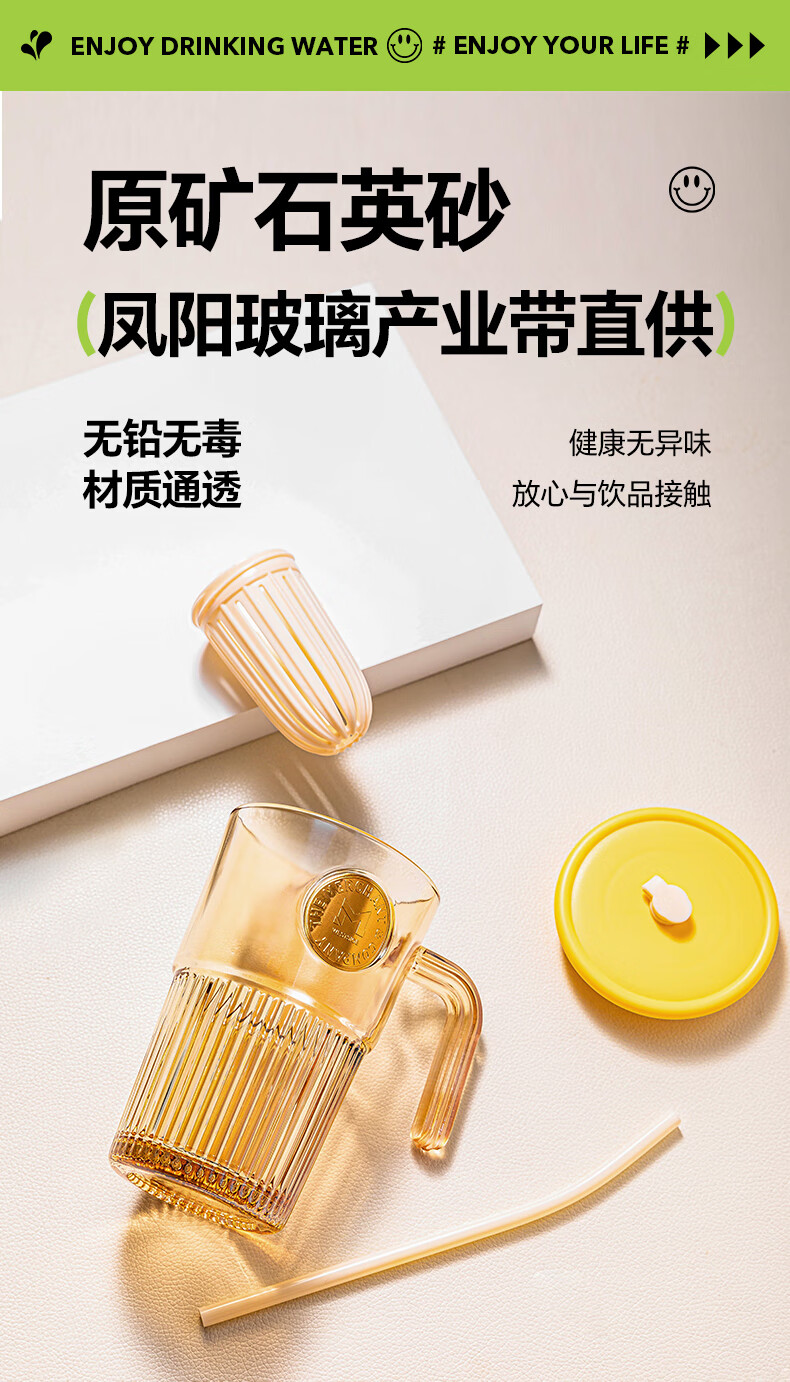乐唯诗(LOVWISH)ins风大容量带盖带吸管竖条纹玻璃杯高颜值冷饮杯果汁咖啡杯水杯 乐美吸管杯【琥珀】530ml1只