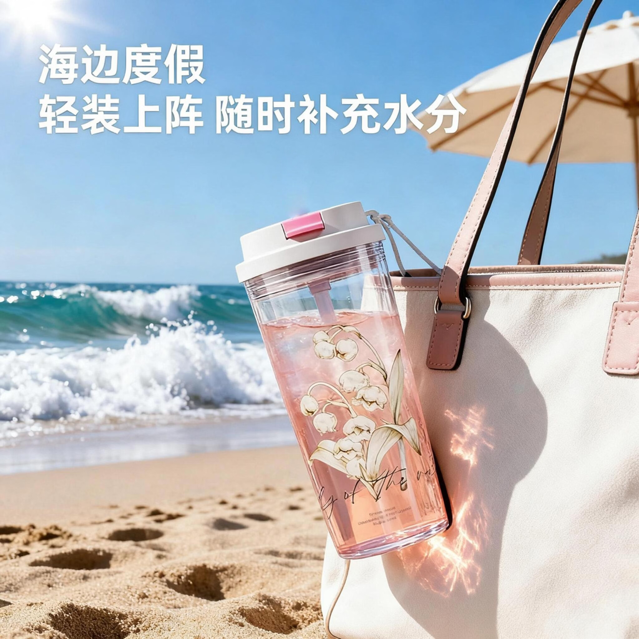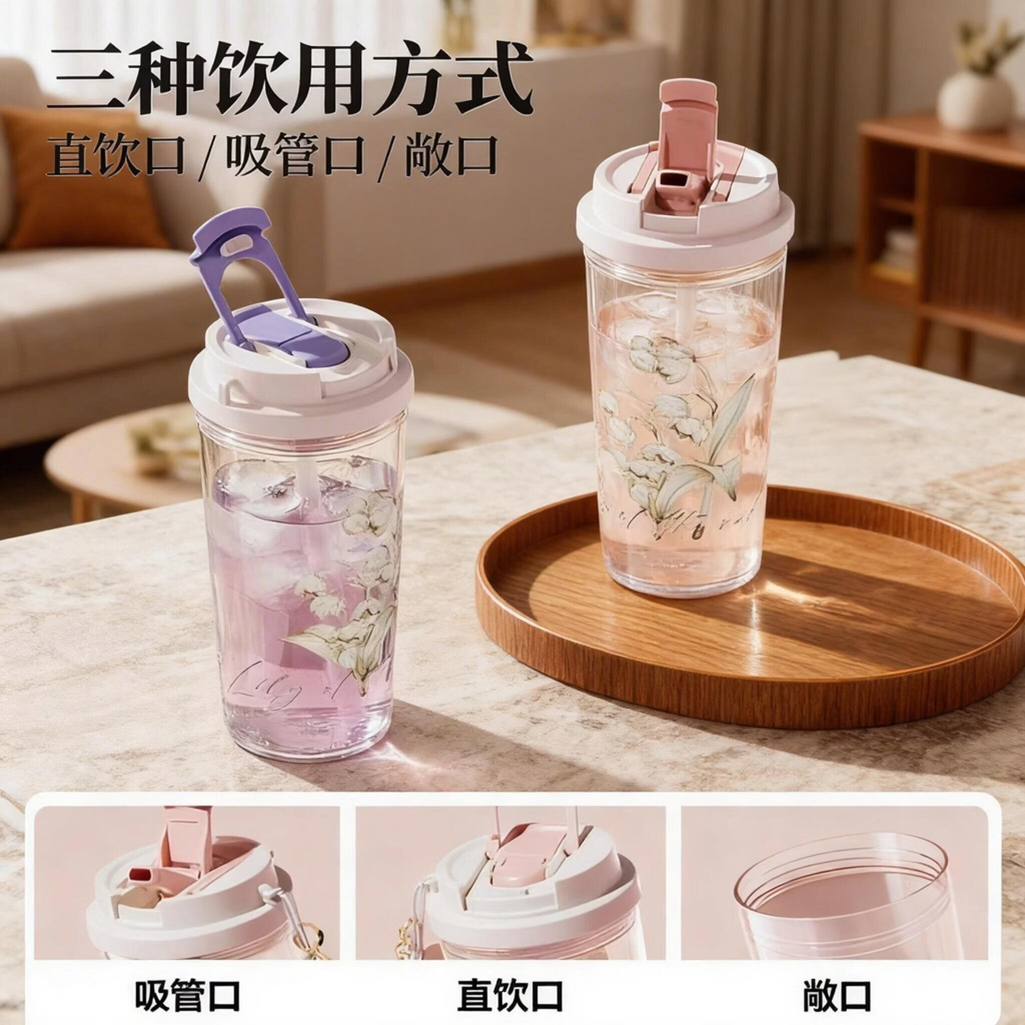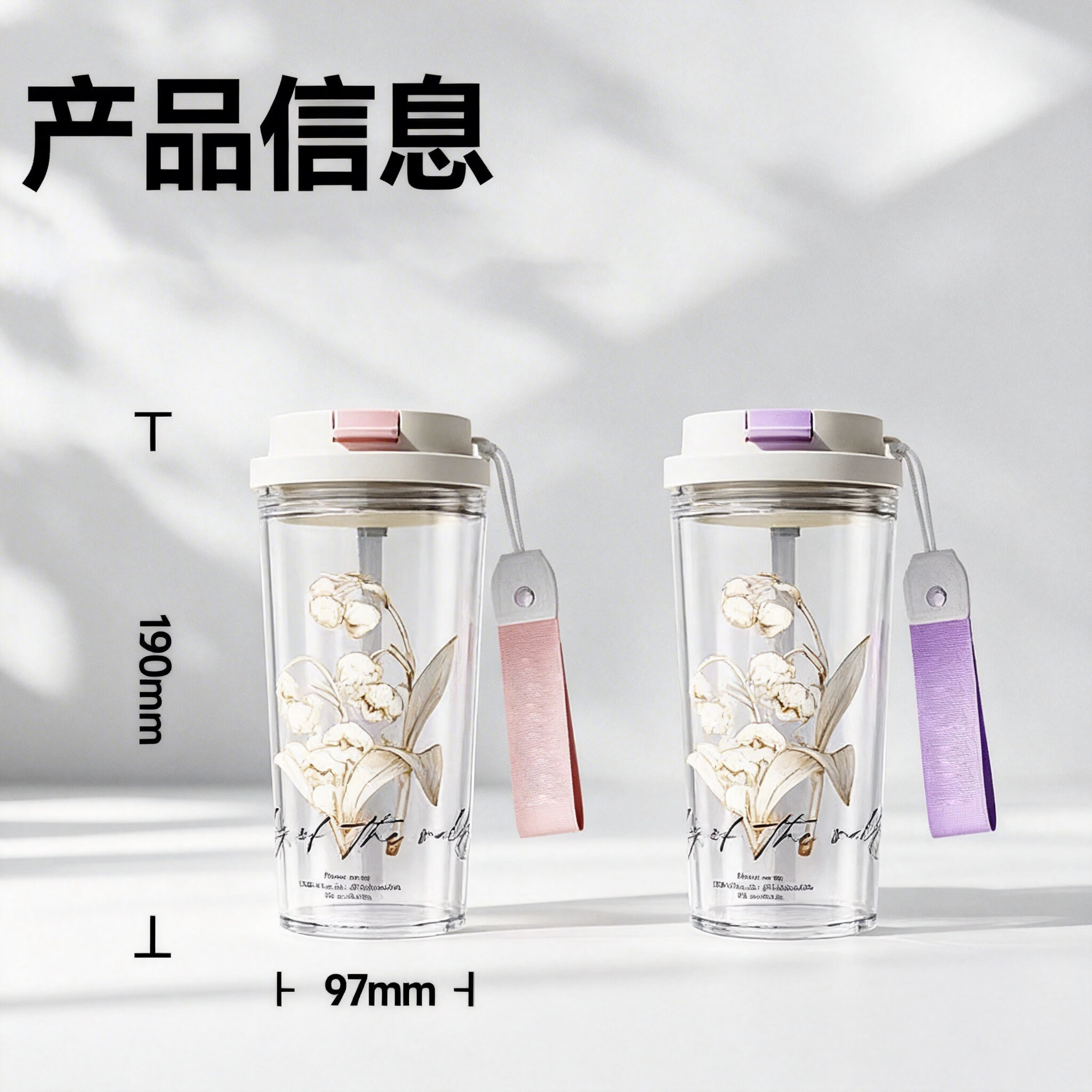 亚创优品+2026新款铃兰水杯女生高颜值塑料便携式小众简约吸管双饮随手杯子 铃兰白绿550ml食品级双饮杯+原装提绳 无规格